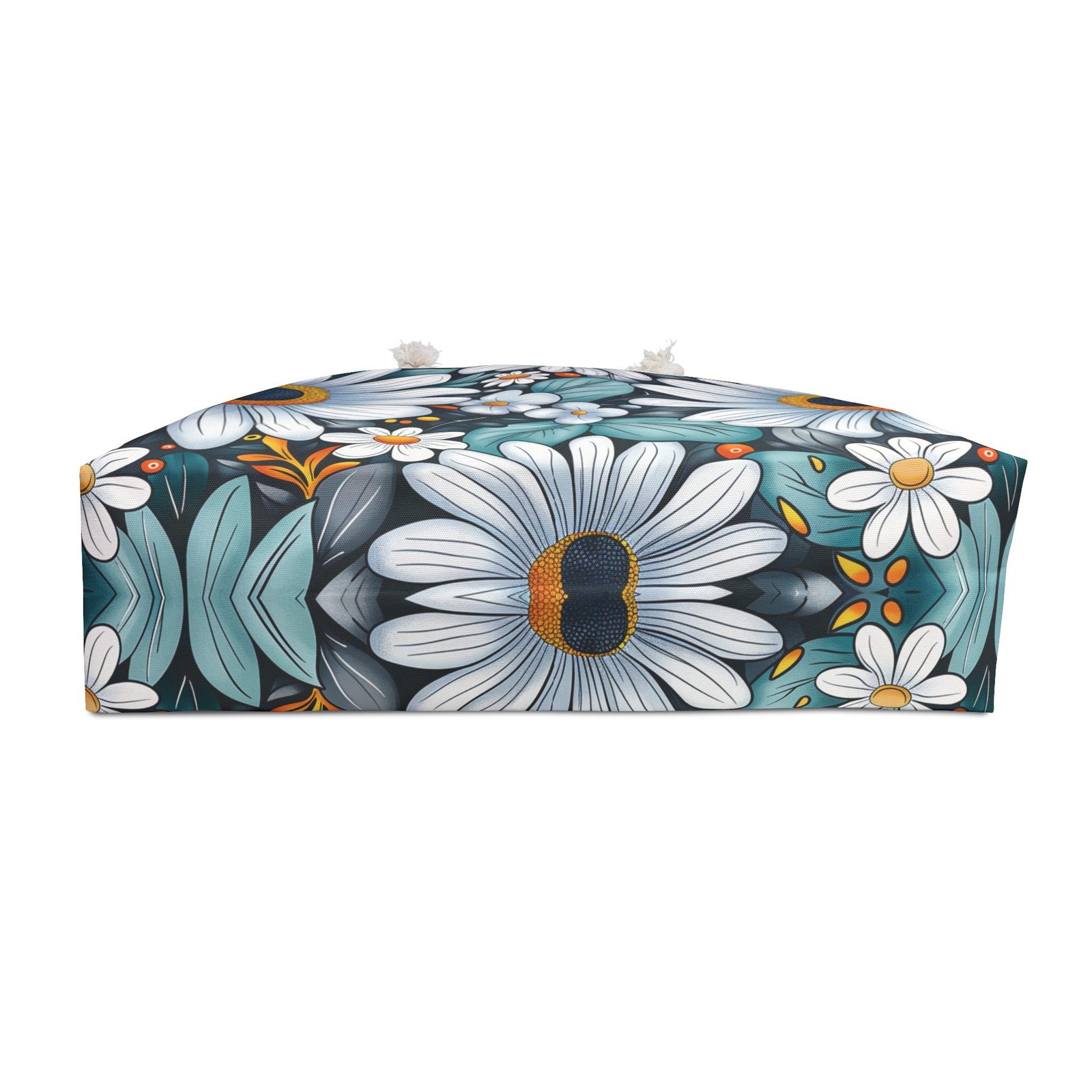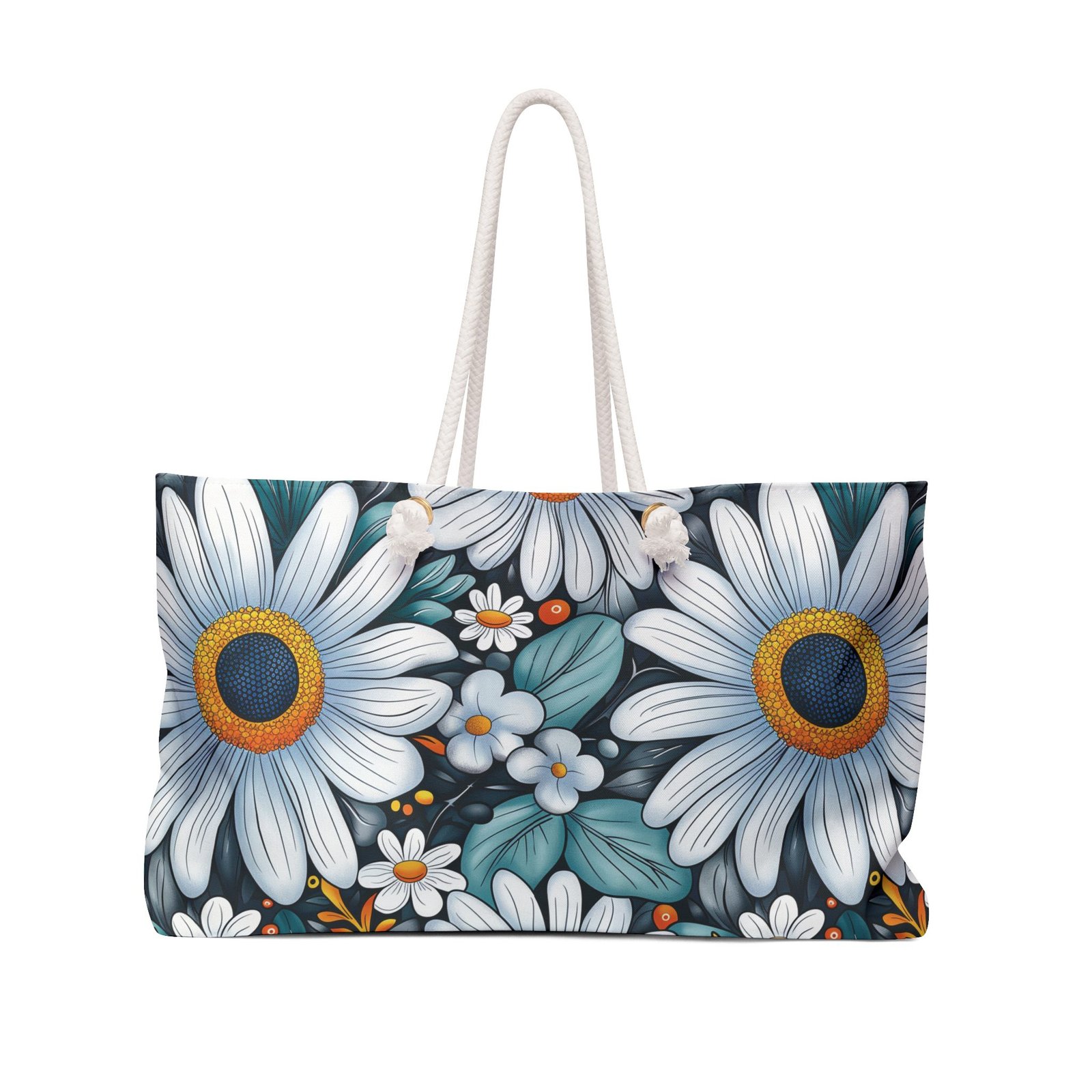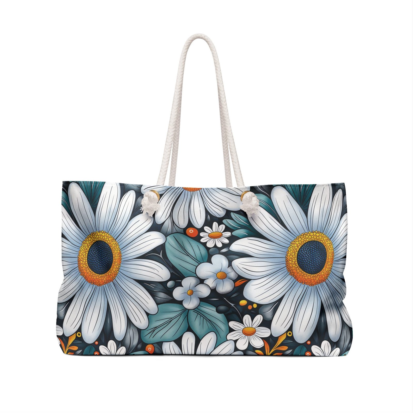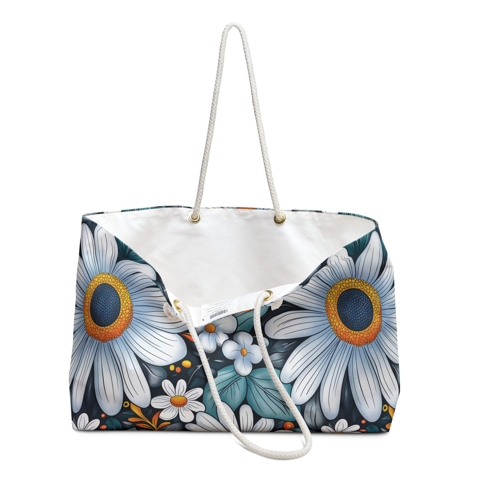 Aqua Daisies Pattern – Aqua and White on Black – Weekender Bag – Tote.