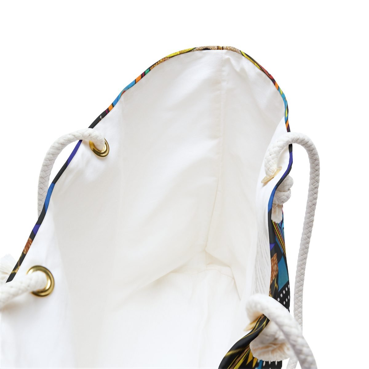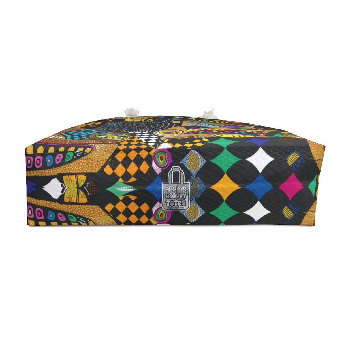 DESIGN: A black background with multiple bright colors of various elements like flowers, rainbows, dashes, dots, circles. Colors are black, yellow, gold, pink, red, orange, blue, green, etc. Hope you love it! Super cute bag.