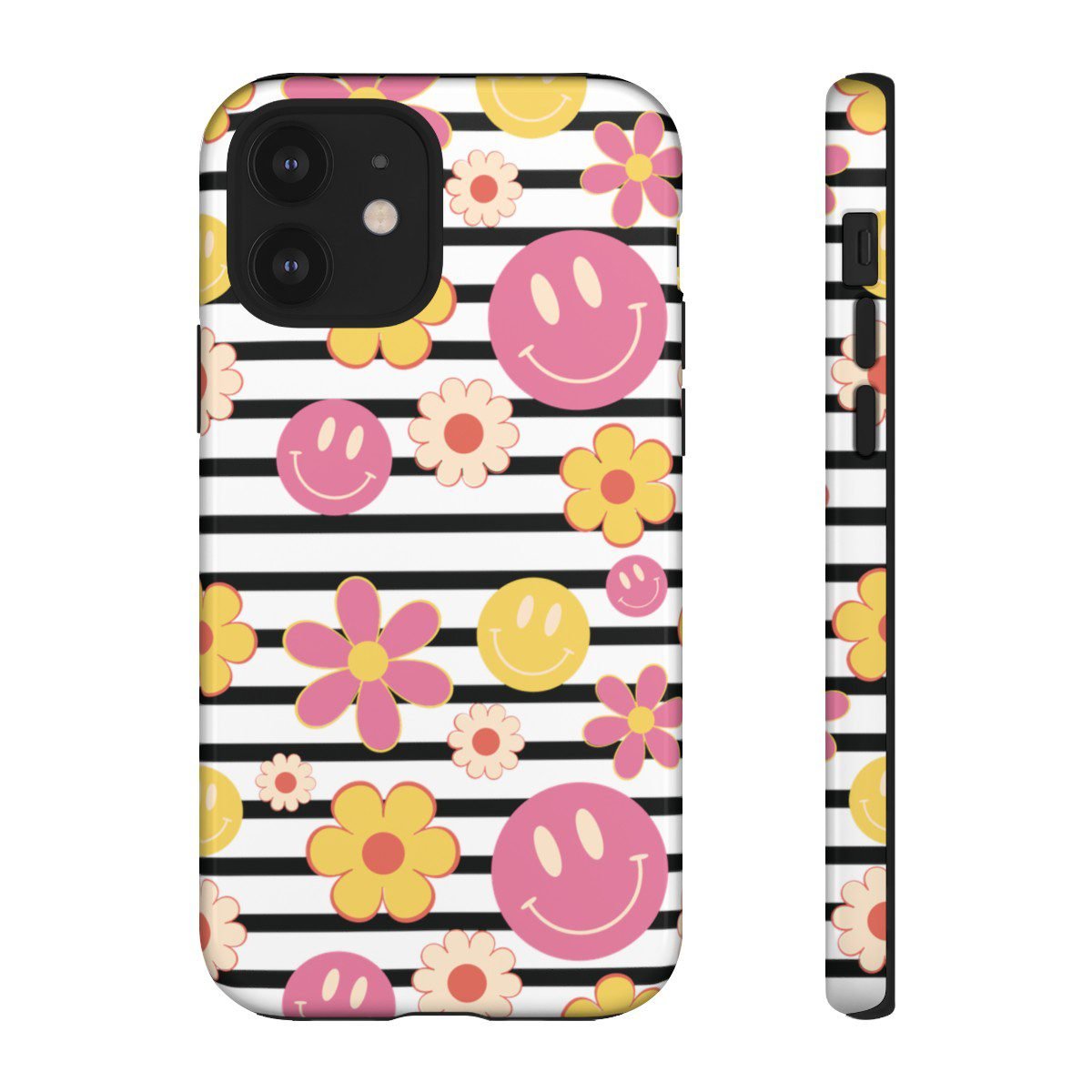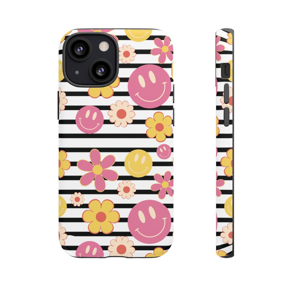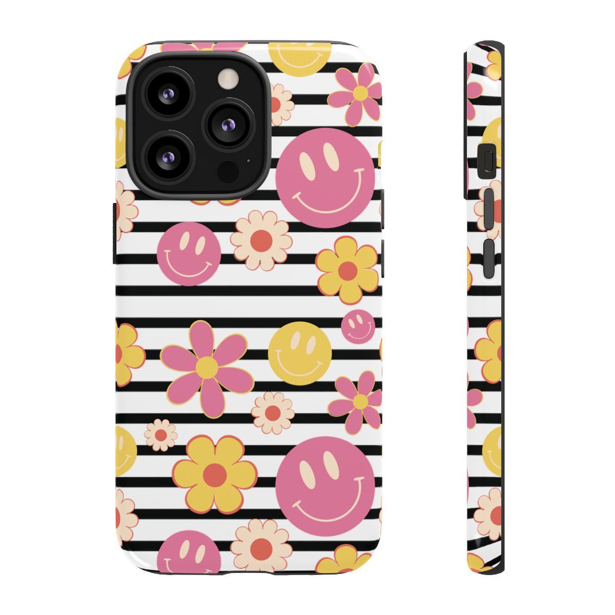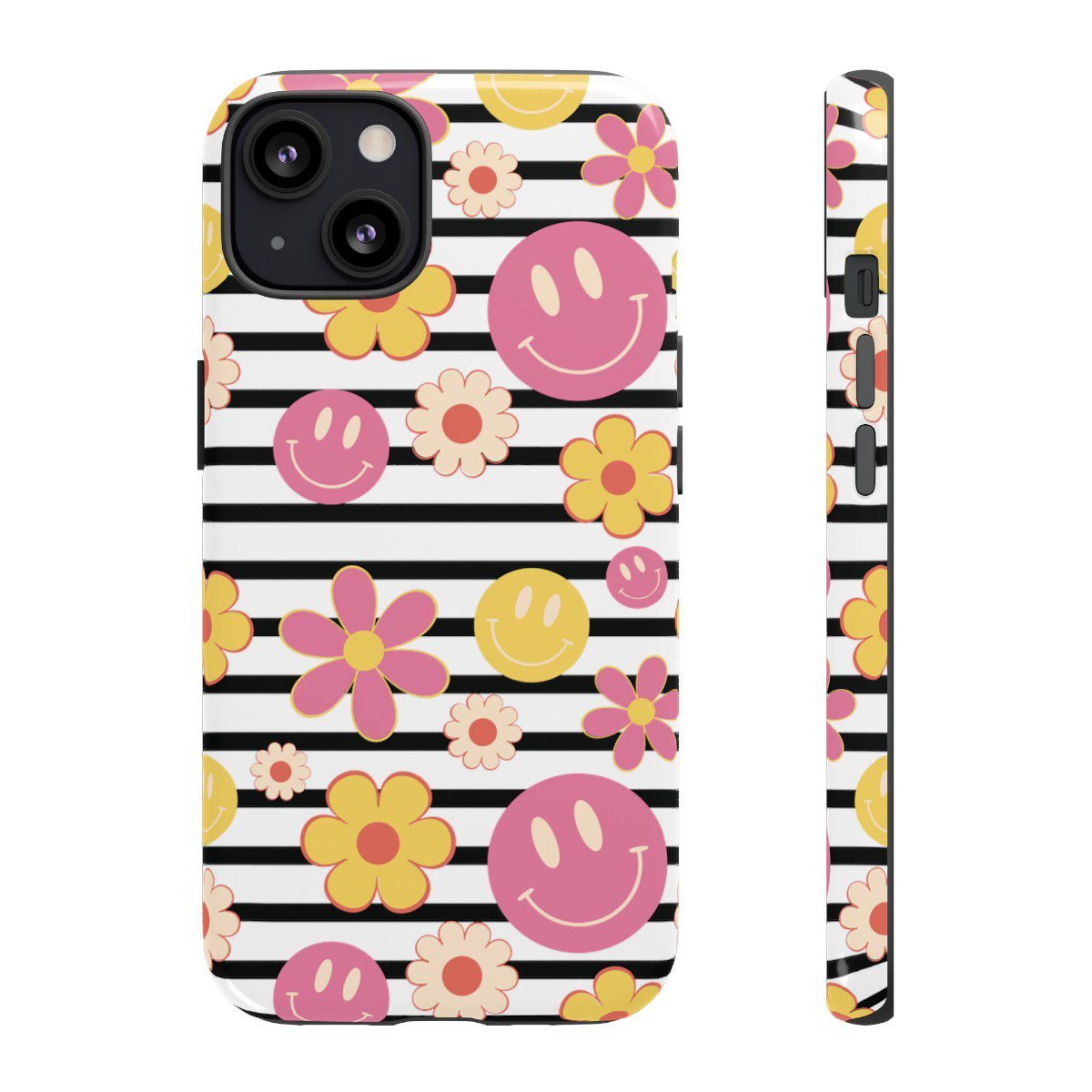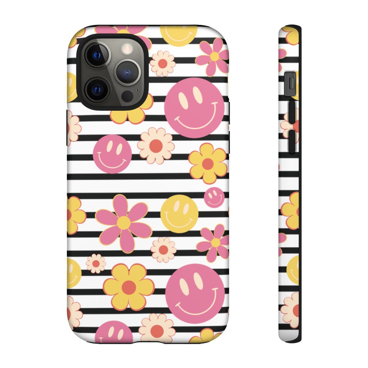 Black and White Stripes with Yellow and Pink Smileys and Retro Flowers – iPhone 12 13 – Cell Phone – Tough Cases.