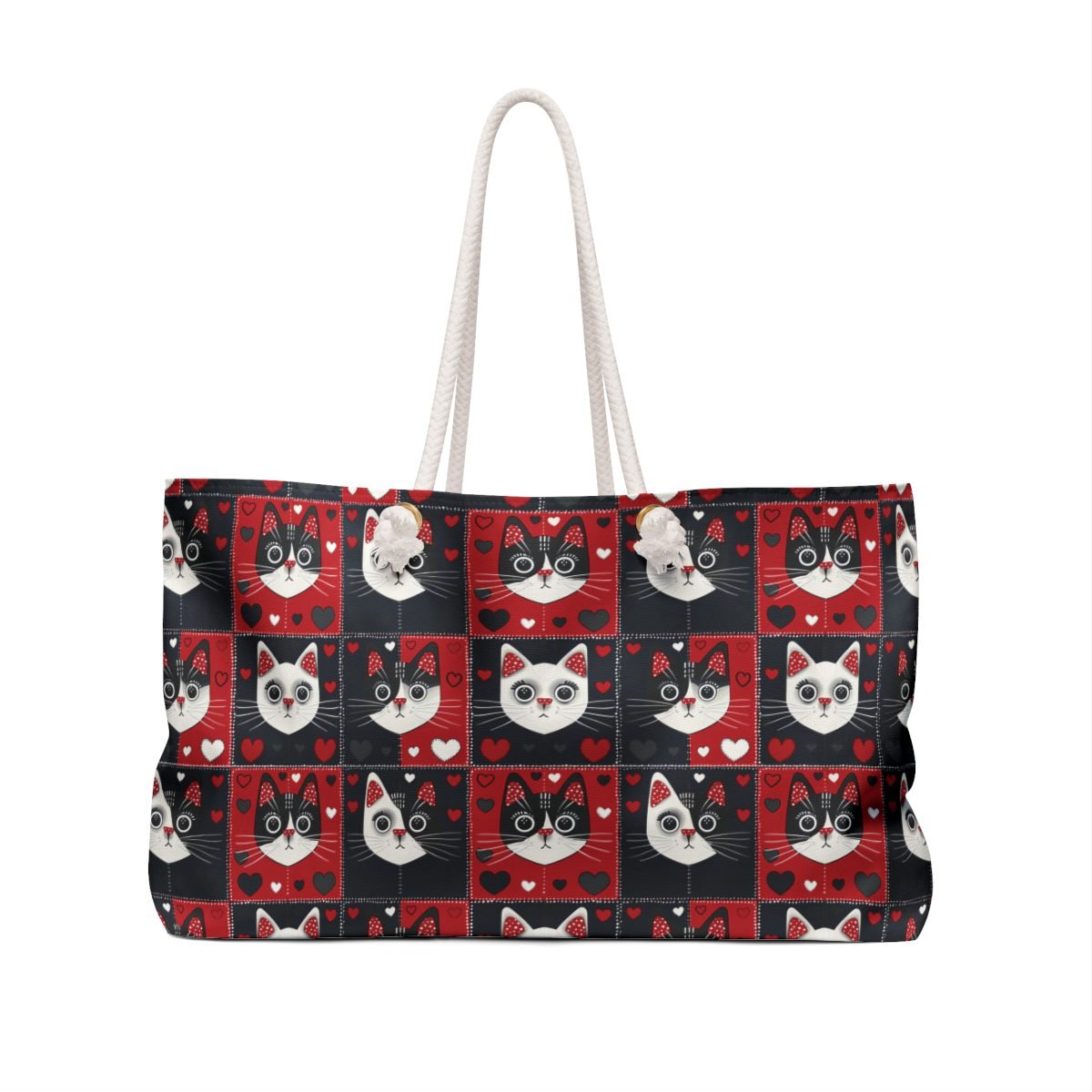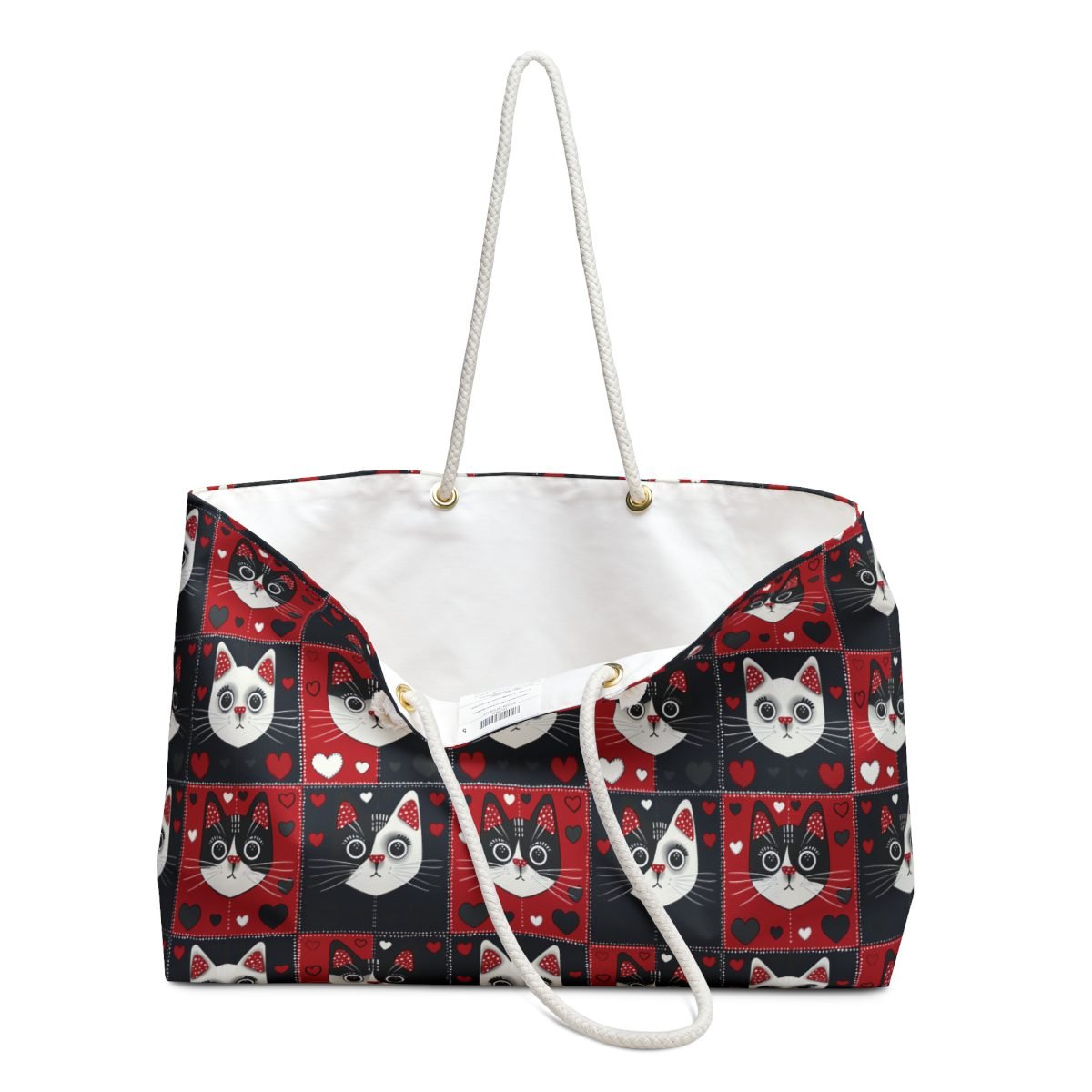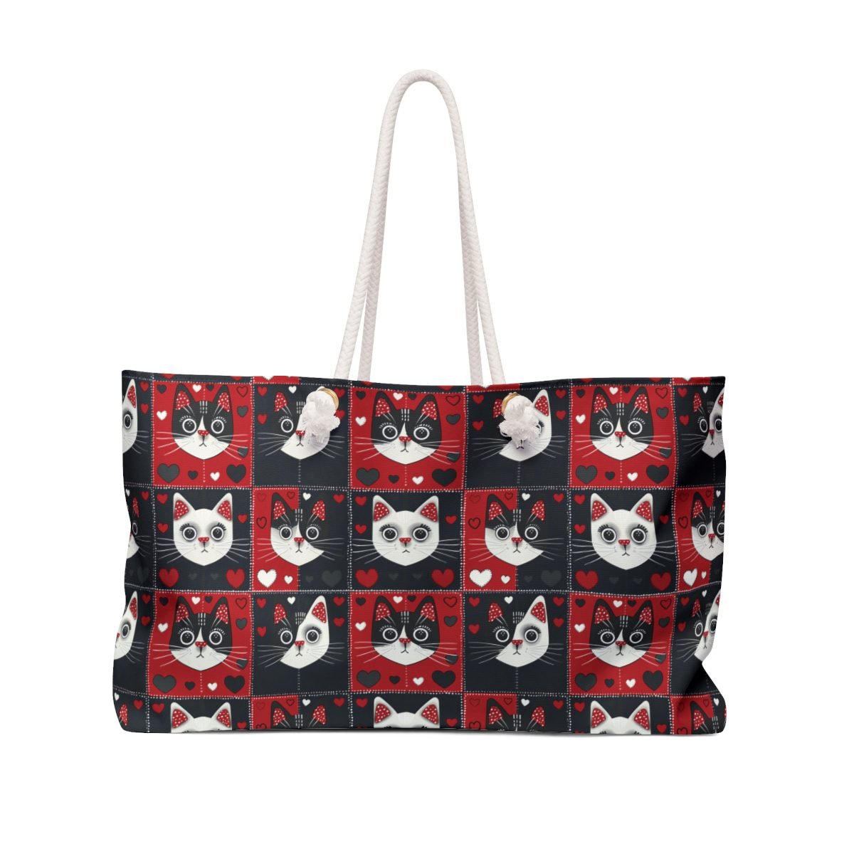 Cats and Hearts in Squares Pattern – Red White Black – Weekender Bag – Tote.