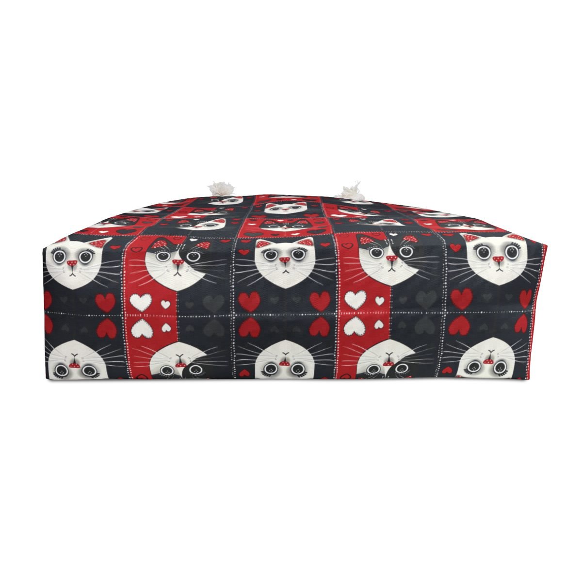 DESIGN: This design is a super cute and fun design with little cats and hearts inside of squares that are dotted. We hope you love it! The bag color is a black with white handles. Colors are black, white, and red.