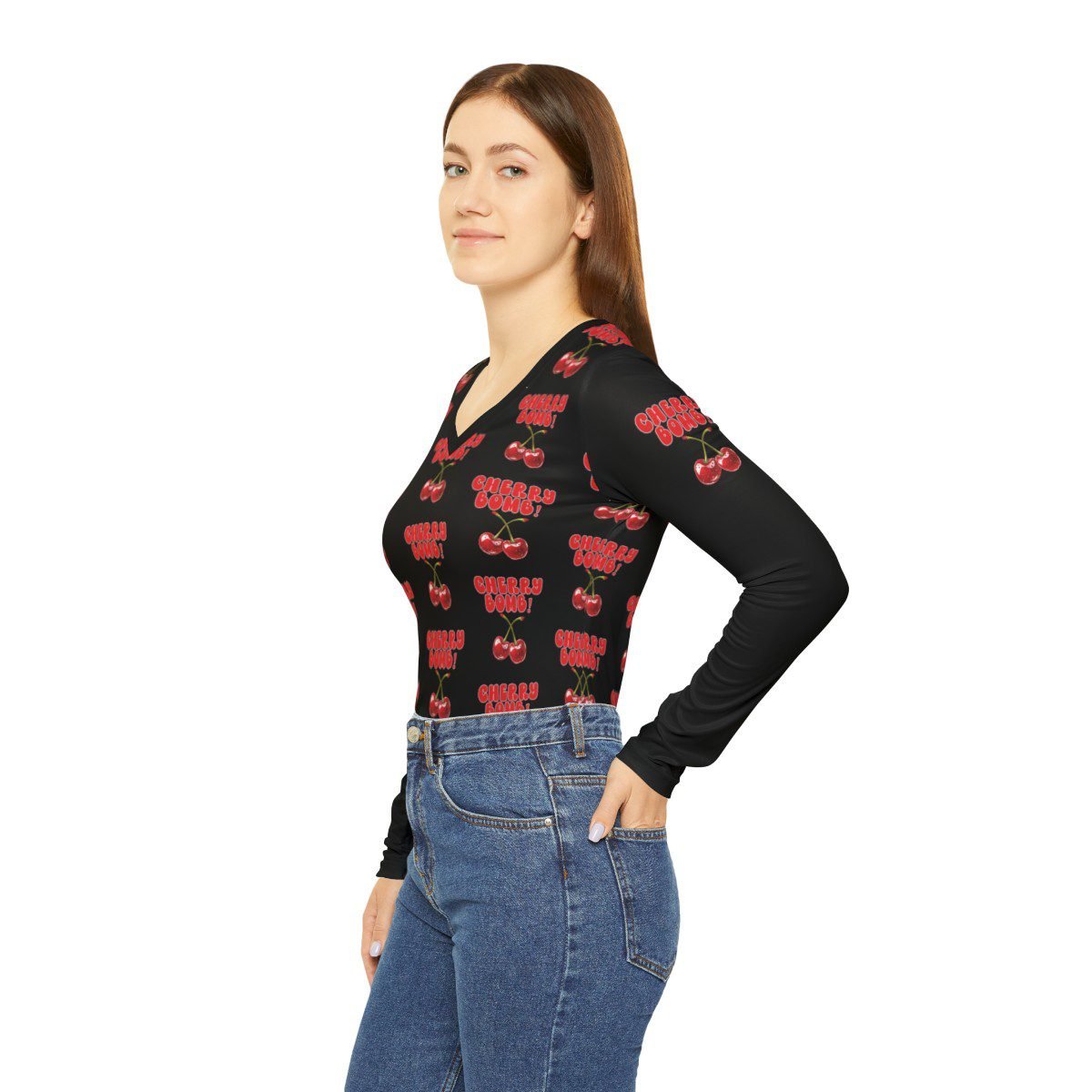 Cherry Bomb Pattern 100 – Pair of Cherries – Red on Black – Women’s Long Sleeve V-neck Shirt – Tee.