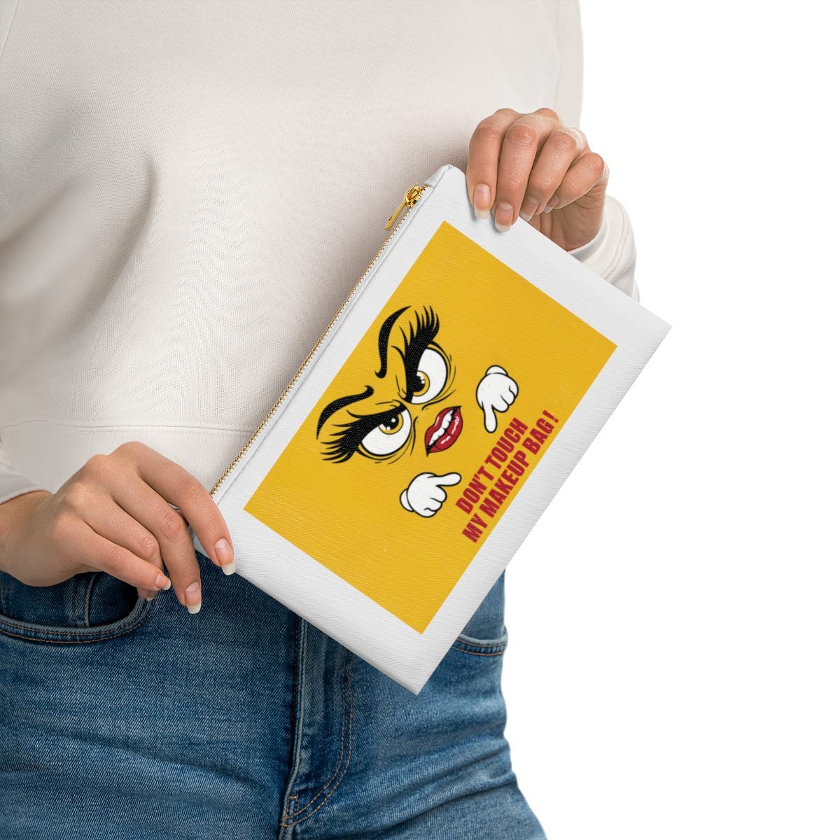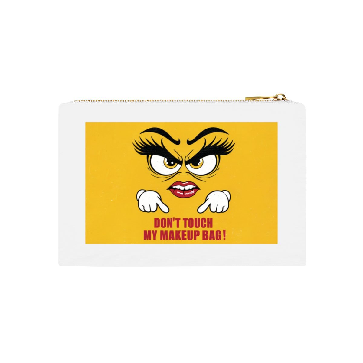 DESIGN: The design has a yellow background with an angry cartoon face in black and white and red. The text “DON’T TOUCH MY MAKEUP BAG!” is also in red. The rest of the makeup bag is white and the back side of the bag is solid white, there is no design on the back side.