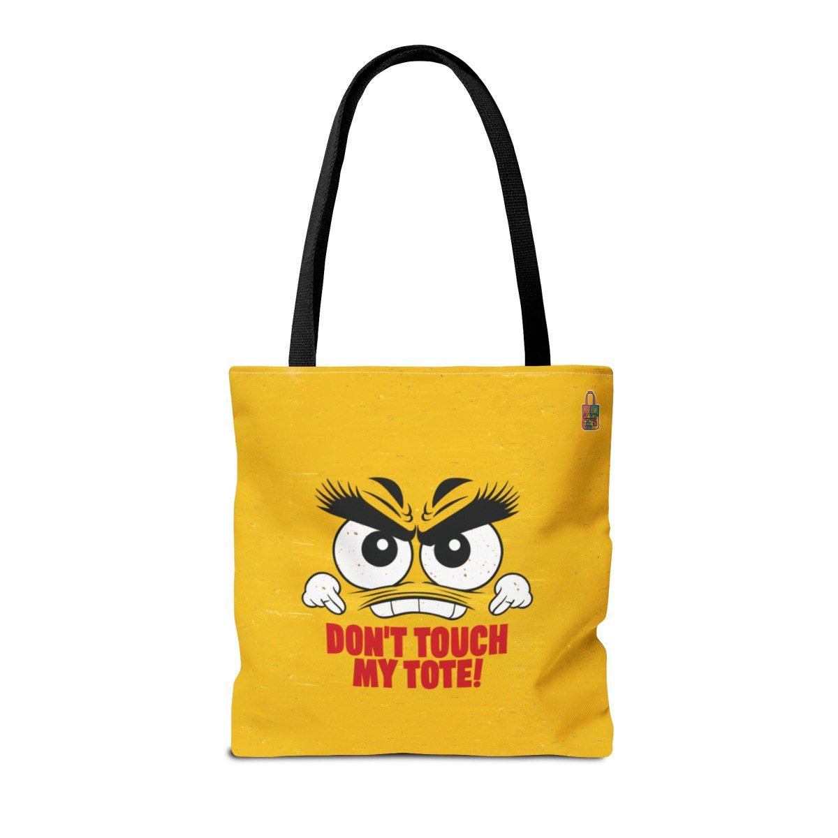 DESIGN: Yellow background with an angry black and white cartoon face with little hands pointing at the red text “DON’T TOUCH MY TOTE!” on both sides of this bag. We hope you love it! Super cute bag.