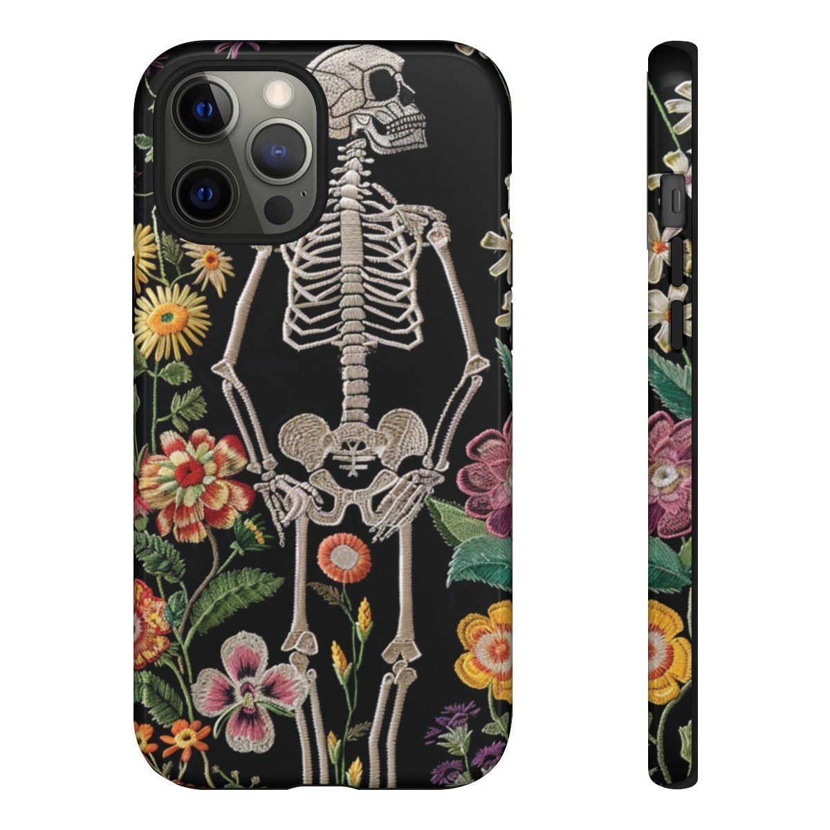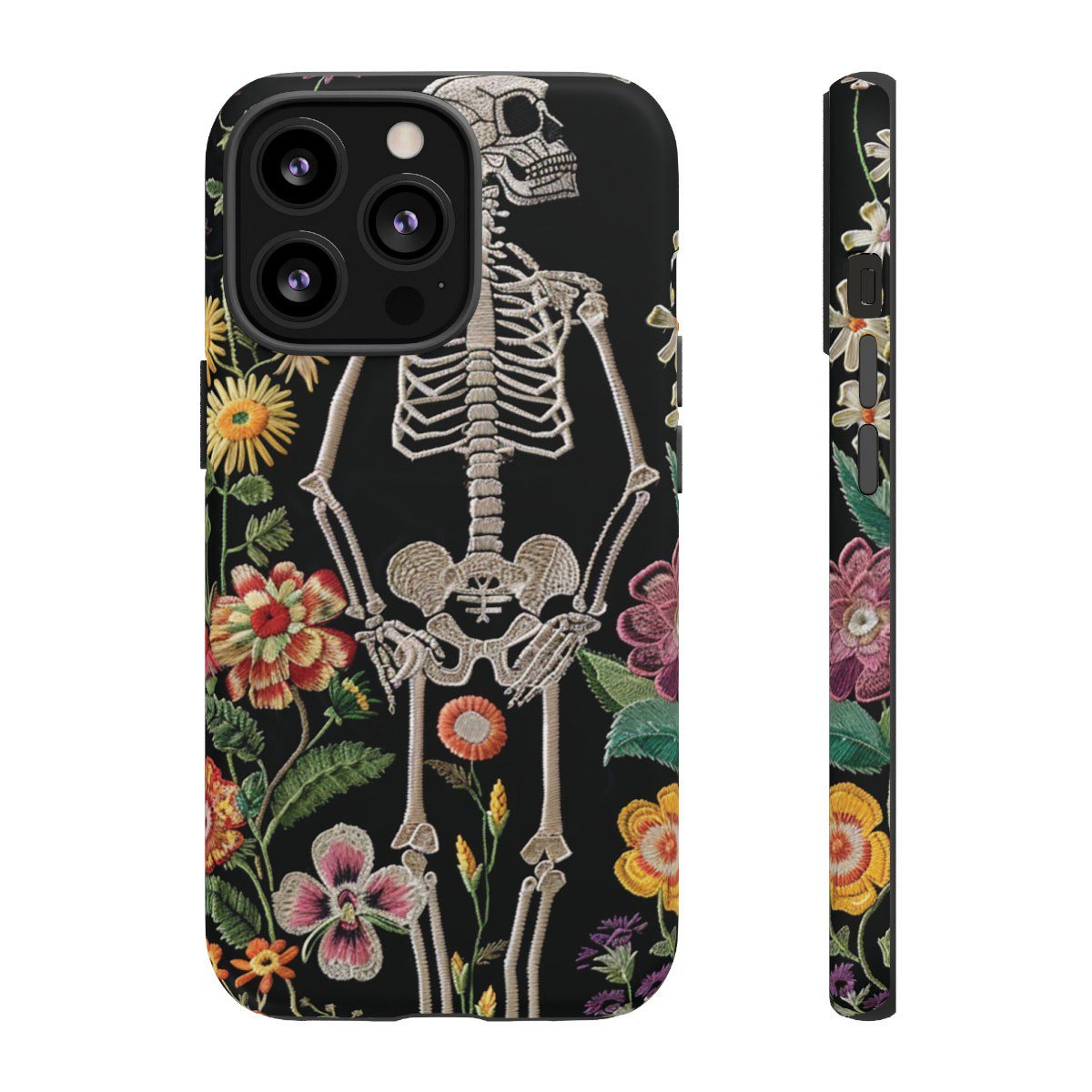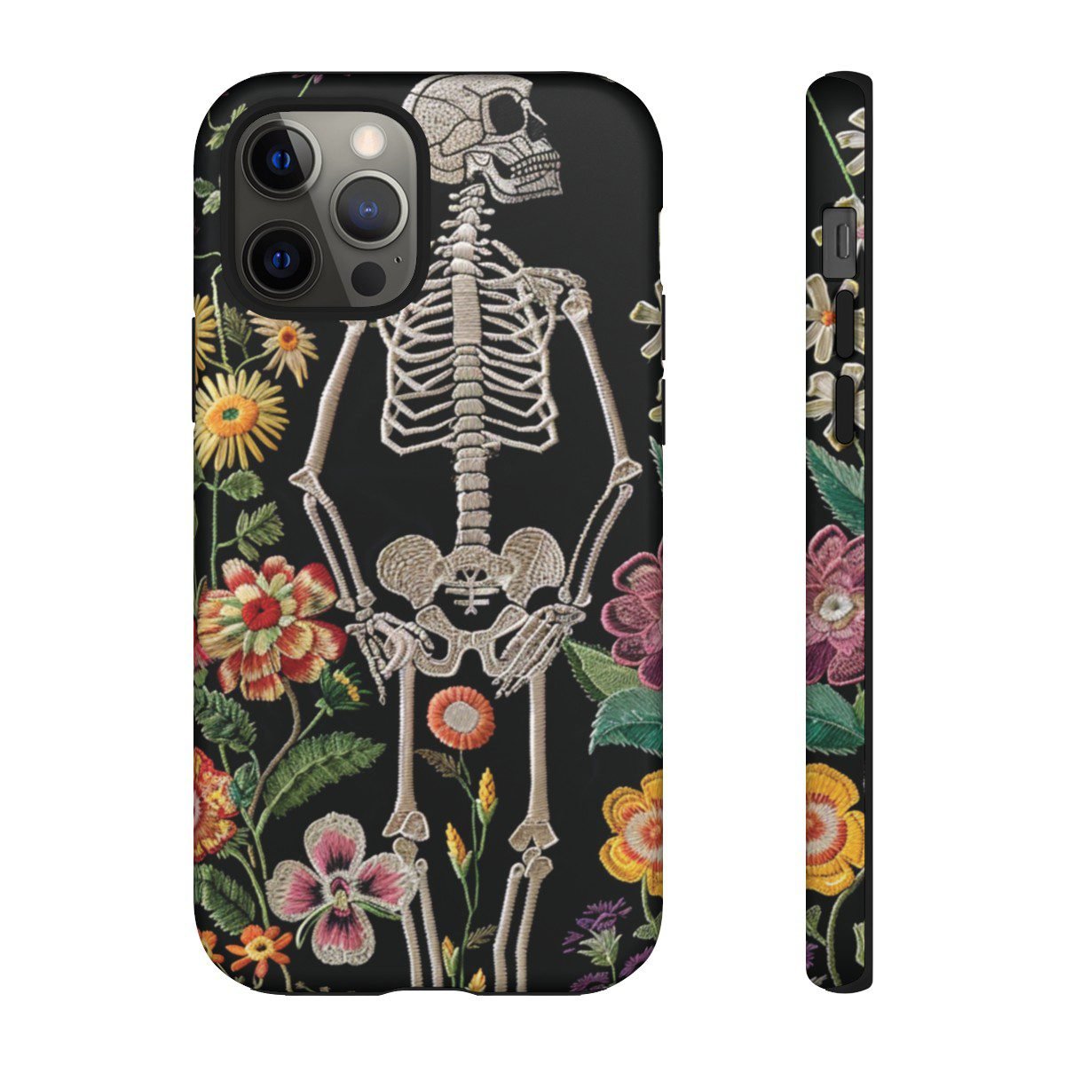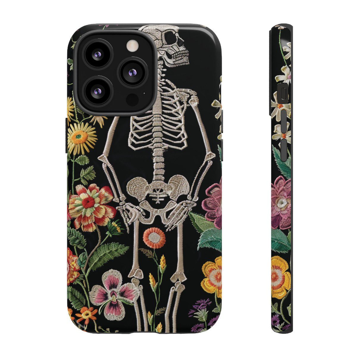 Embroidered Look Skeleton in the Garden – Multi-Colored on Black – iPhone 12 13 – Cell Phone – Tough Cases.
