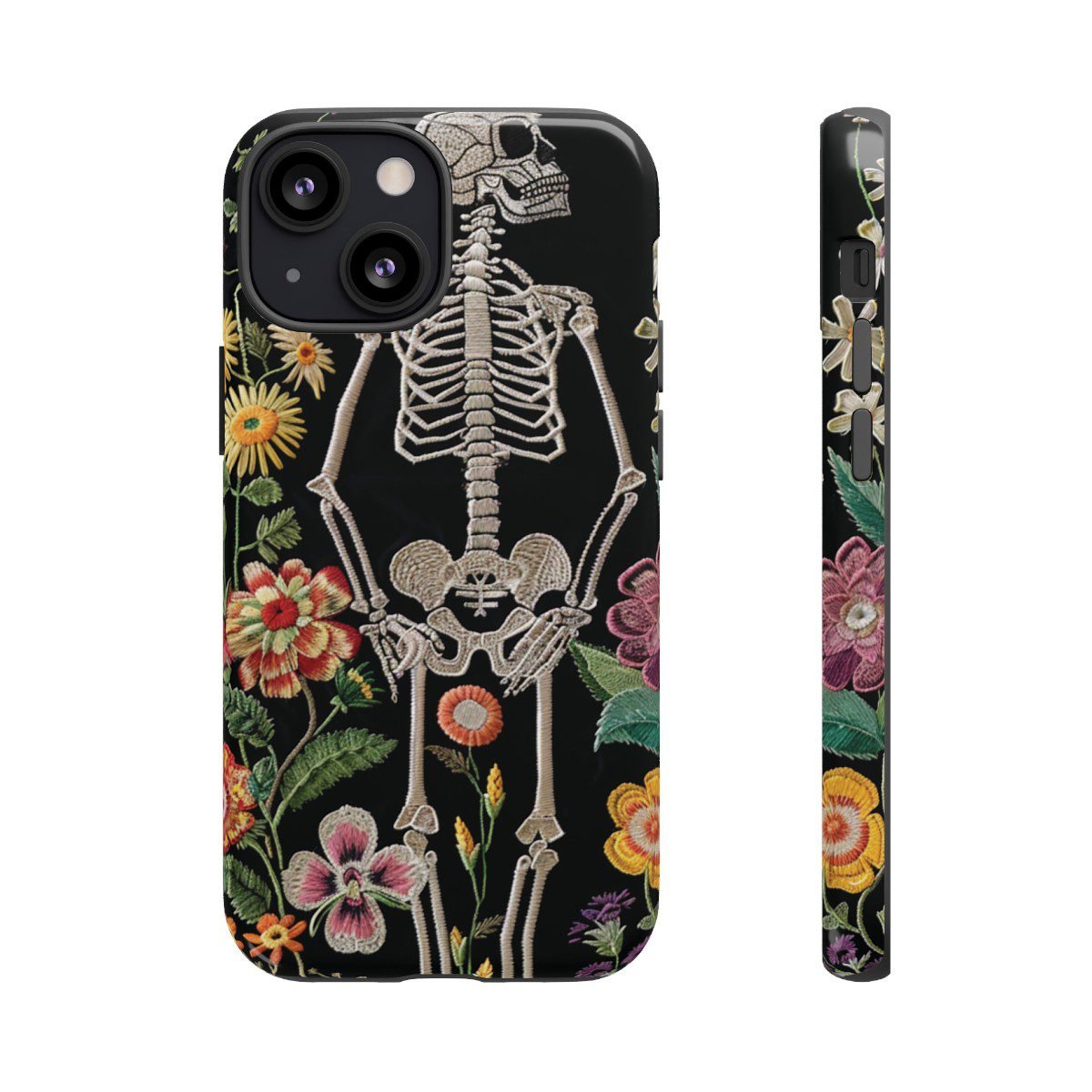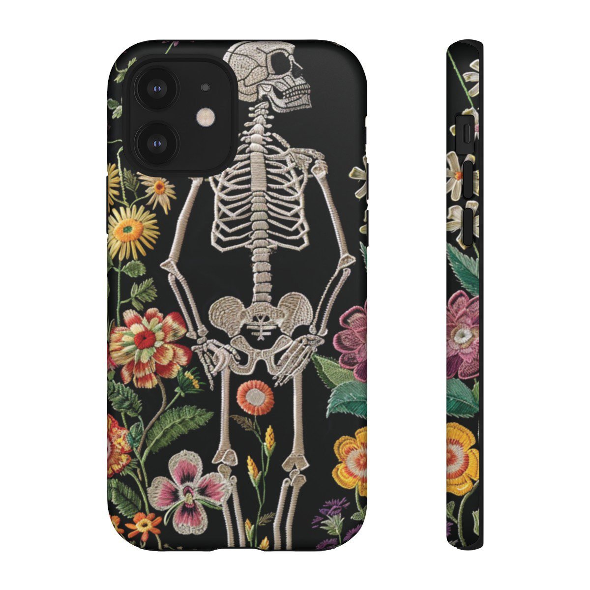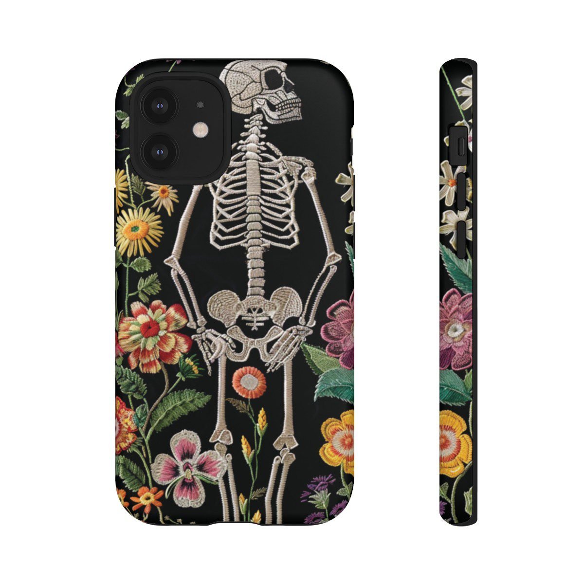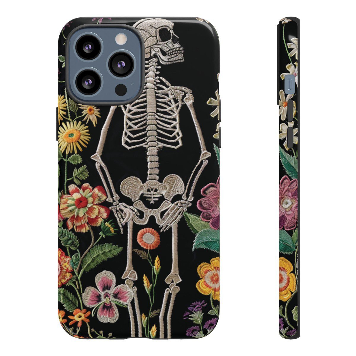 Embroidered Look Skeleton in the Garden – Multi-Colored on Black – iPhone 12 13 – Cell Phone – Tough Cases.