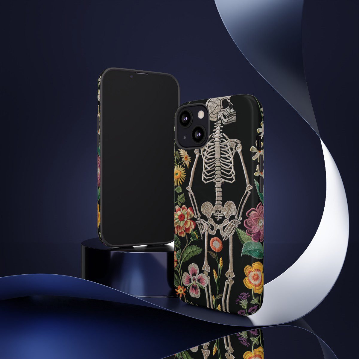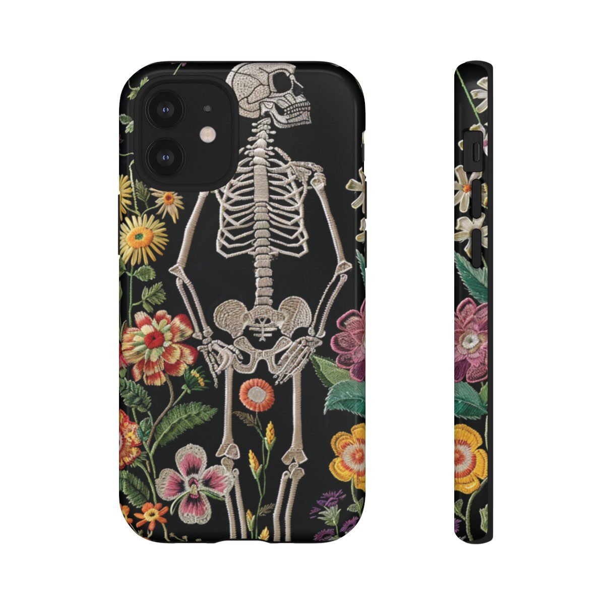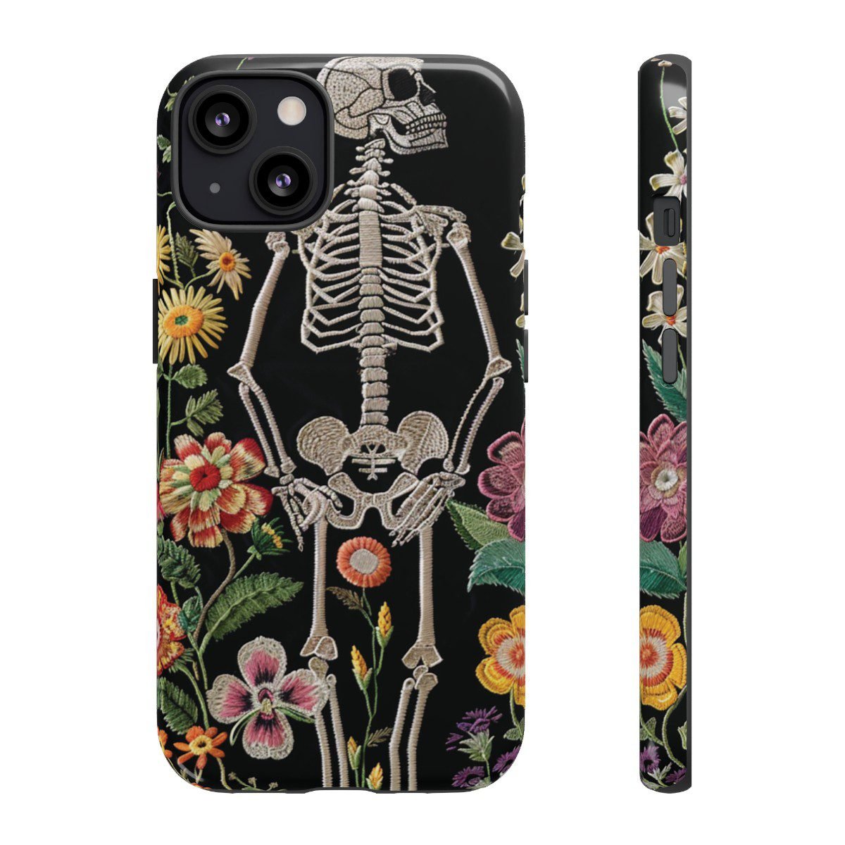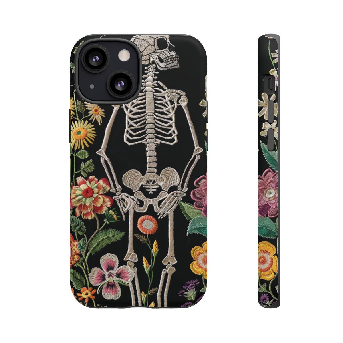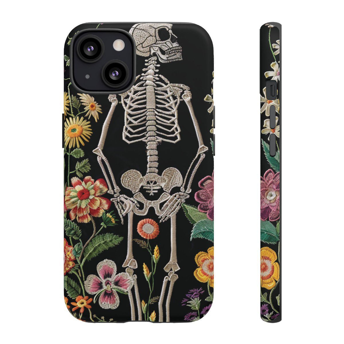 Embroidered Look Skeleton in the Garden – Multi-Colored on Black – iPhone 12 13 – Cell Phone – Tough Cases.