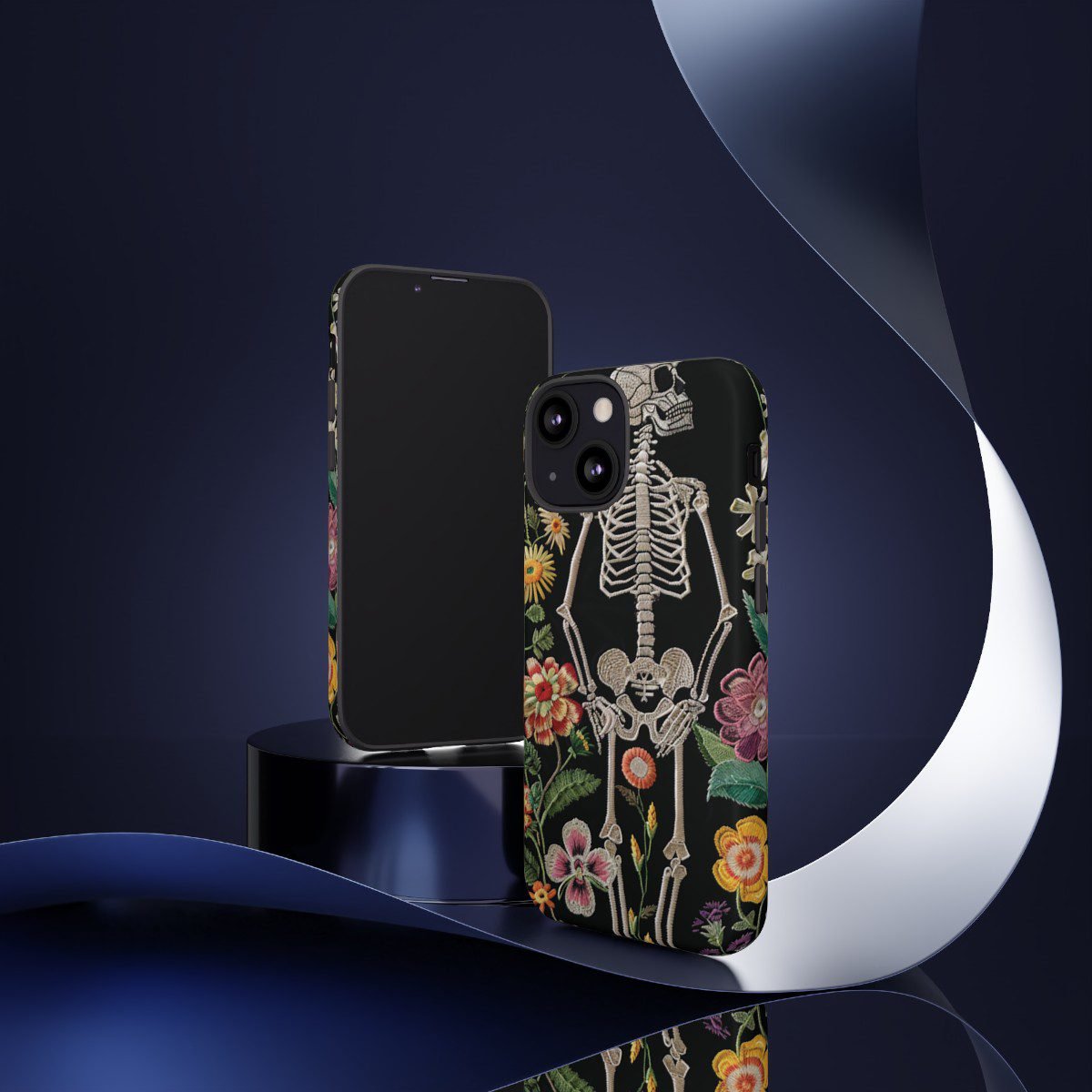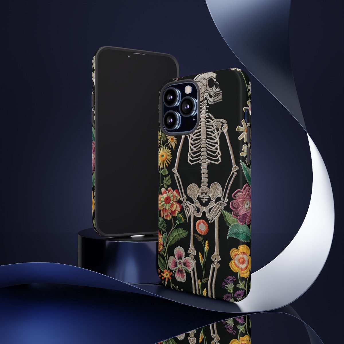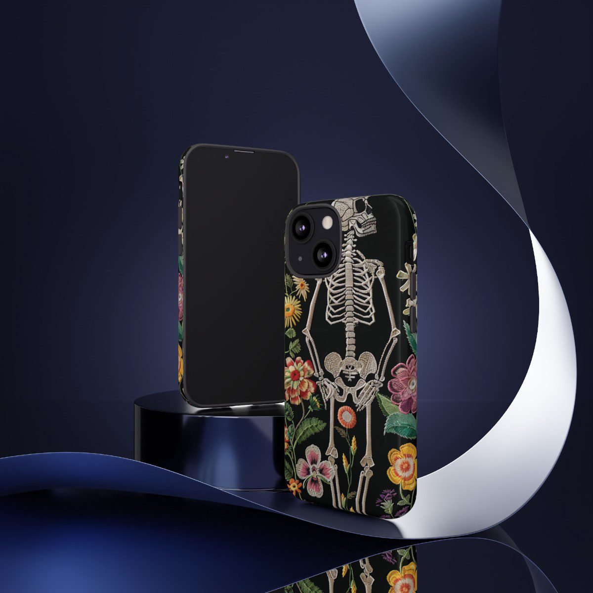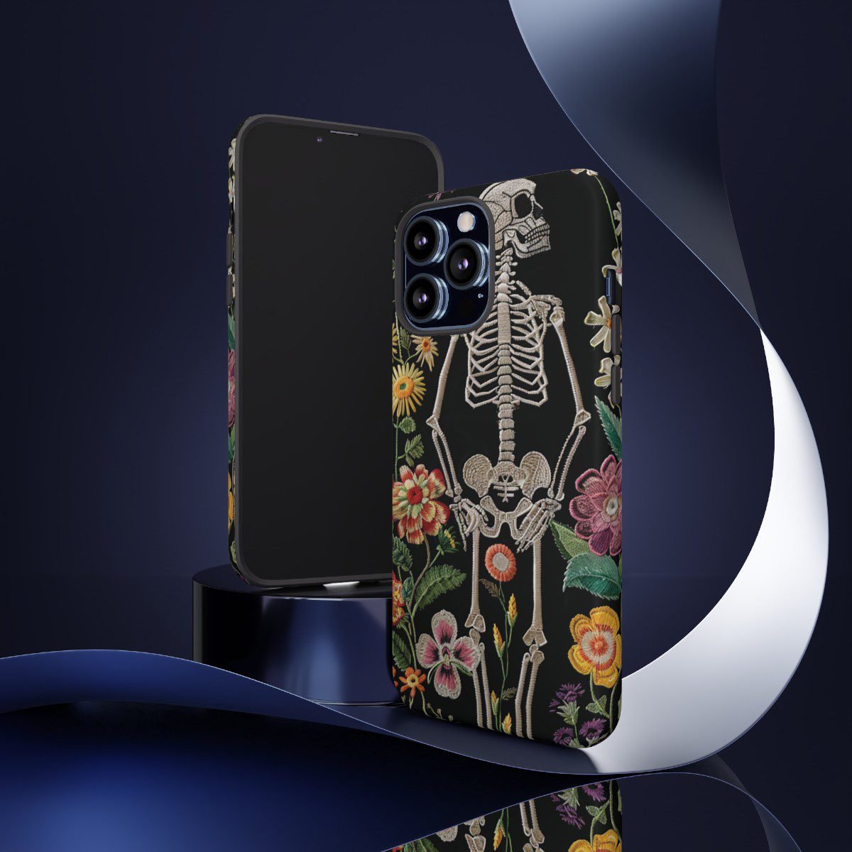 Embroidered Look Skeleton in the Garden – Multi-Colored on Black – iPhone 12 13 – Cell Phone – Tough Cases.