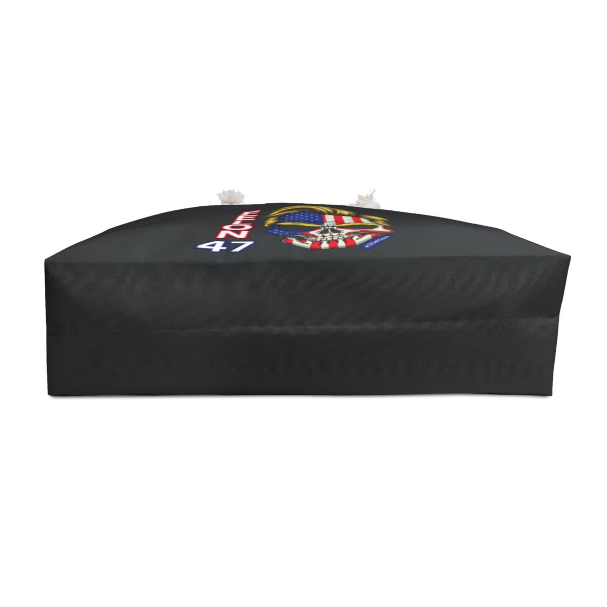 DESIGN: The text “FELON 47” and a skull with an embedded American Flag and the iconic Donald Trump hair and eyebrows. A small text “#TRUMP2024” by the skulls jaw. The bag color is a black with white handles. Colors are red, white, black, blue, and yellow.