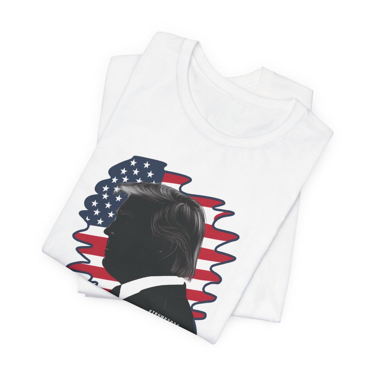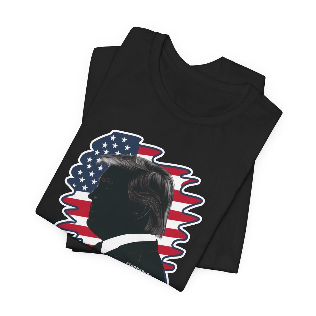 DESIGN: A great design with a side silhouette of Donald J. Trump with the backdrop of an American Flag. The text “I’M VOTING FOR FELON 47” and in a small text on the President Trump silhouette says “#TRUMP2024”. Colors of red, white, blue, and black on your choice of t-shirts of the same colors.