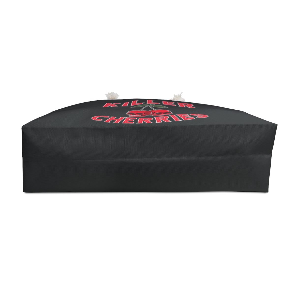 DESIGN: This super cute design is an illustration of a cute pair of red cherry skulls with green stems and leaves. Text “KILLER CHERRIES”. It’s unique and unexpected. The bag is black with white rope handles.