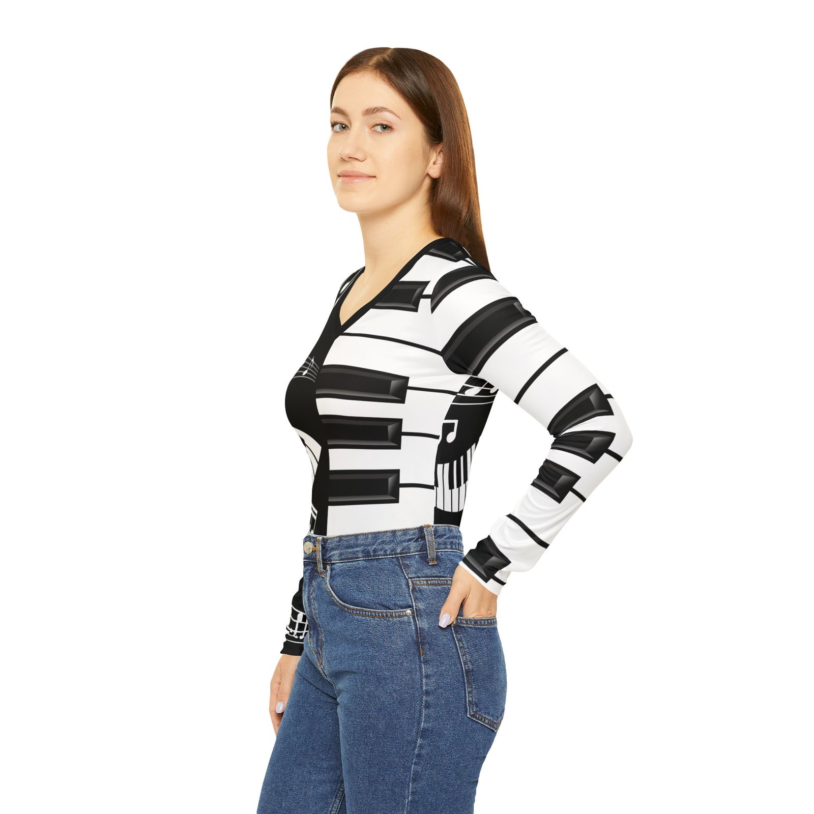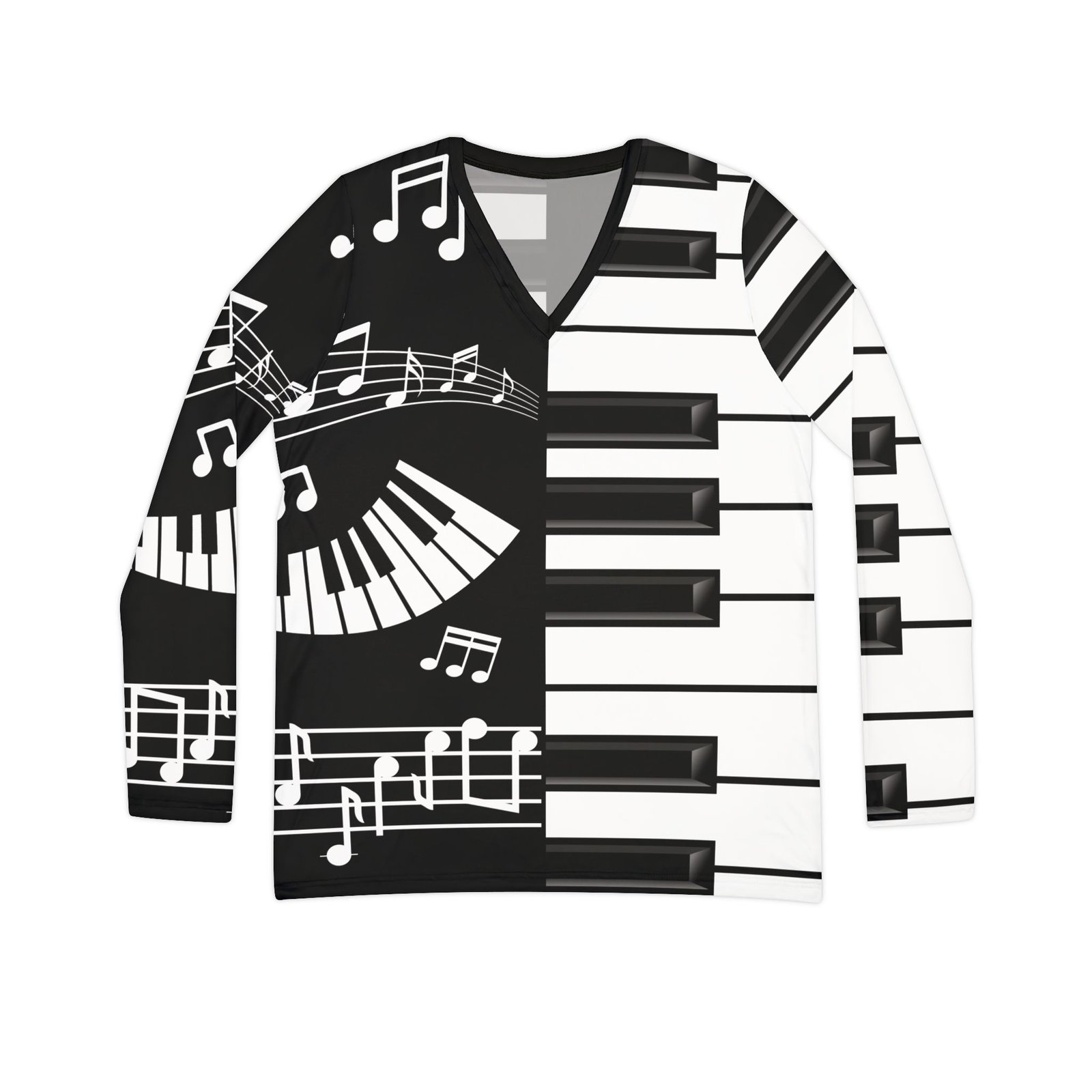 Musical Notes – Piano Keys – Black and White – Women’s Long Sleeve V-neck Shirt – Tee.