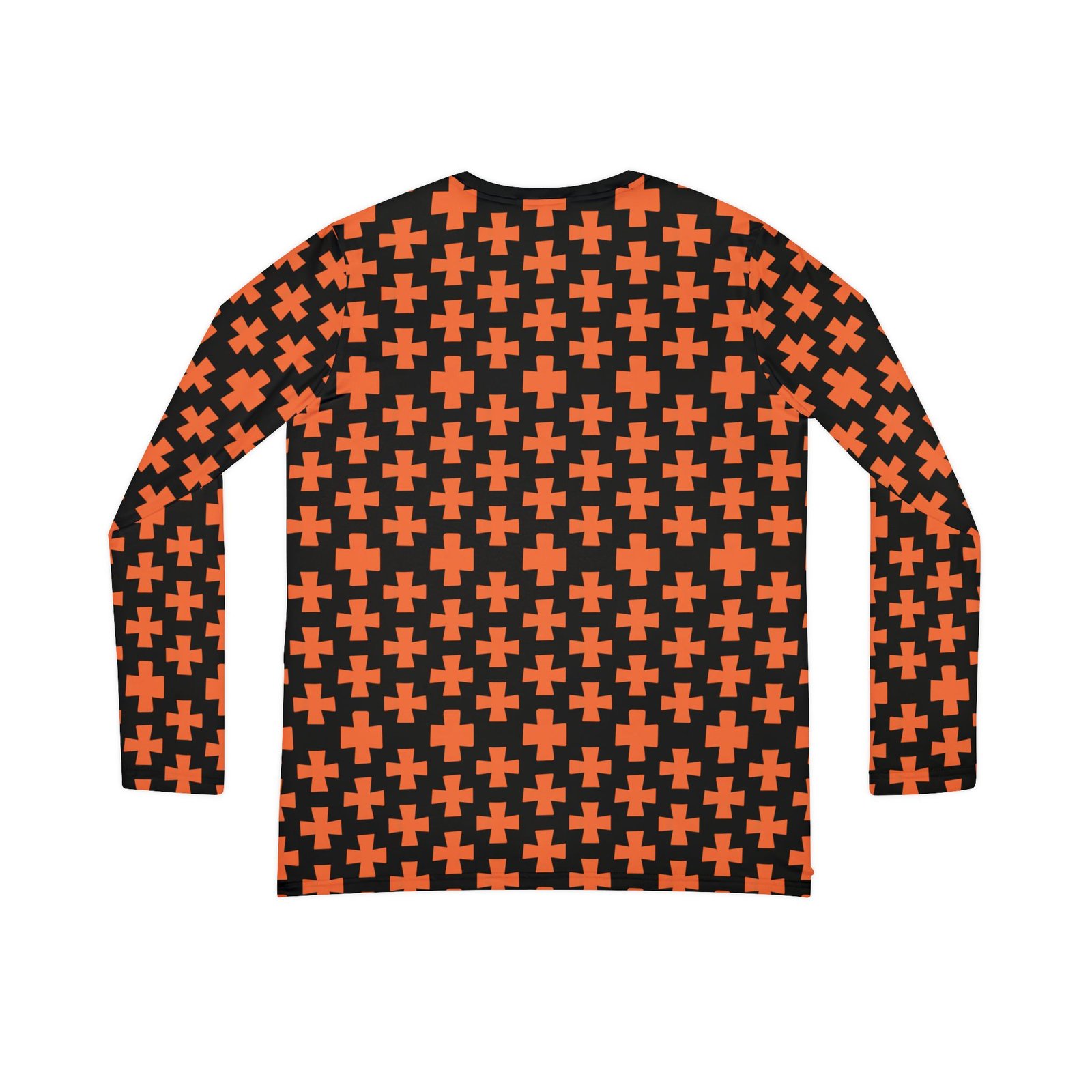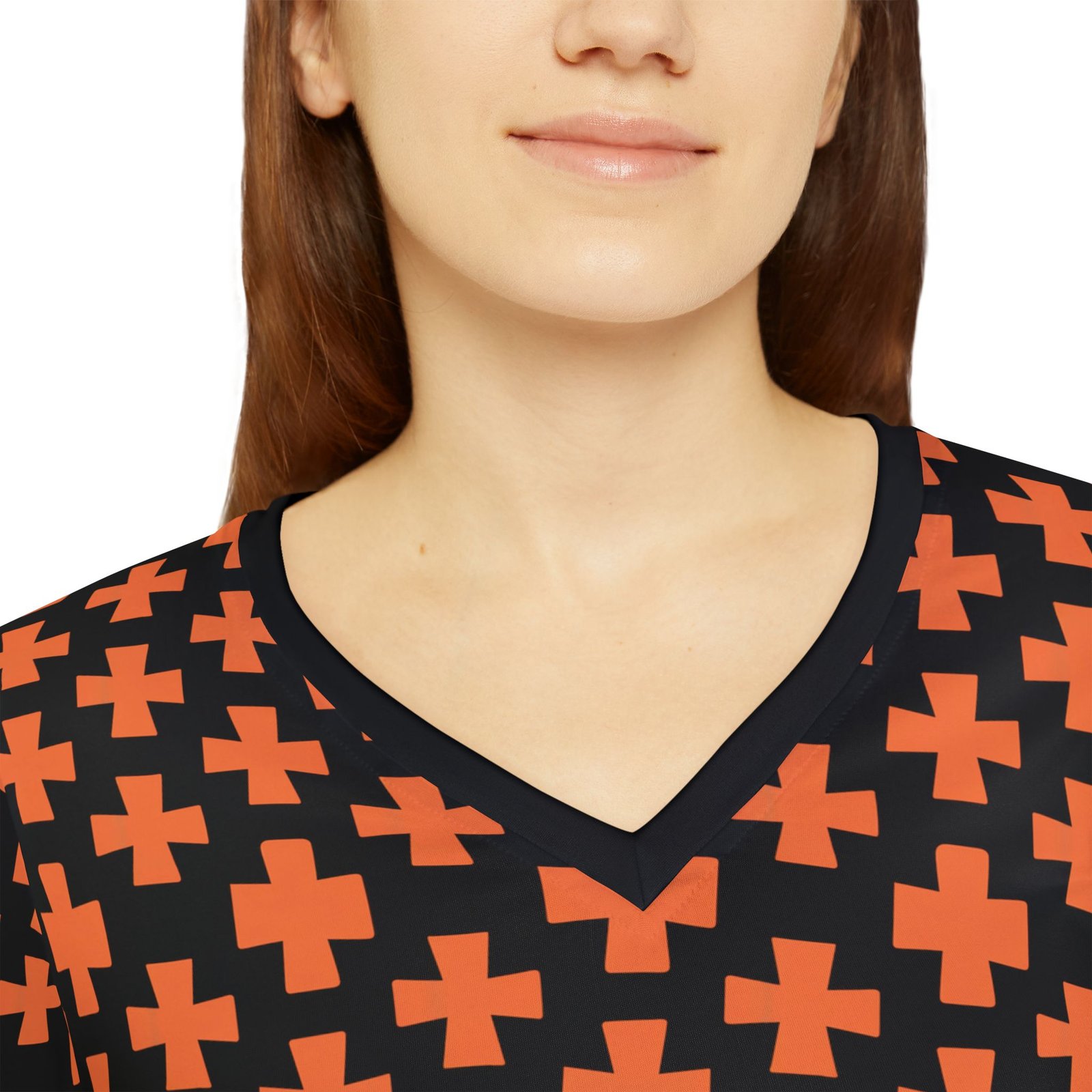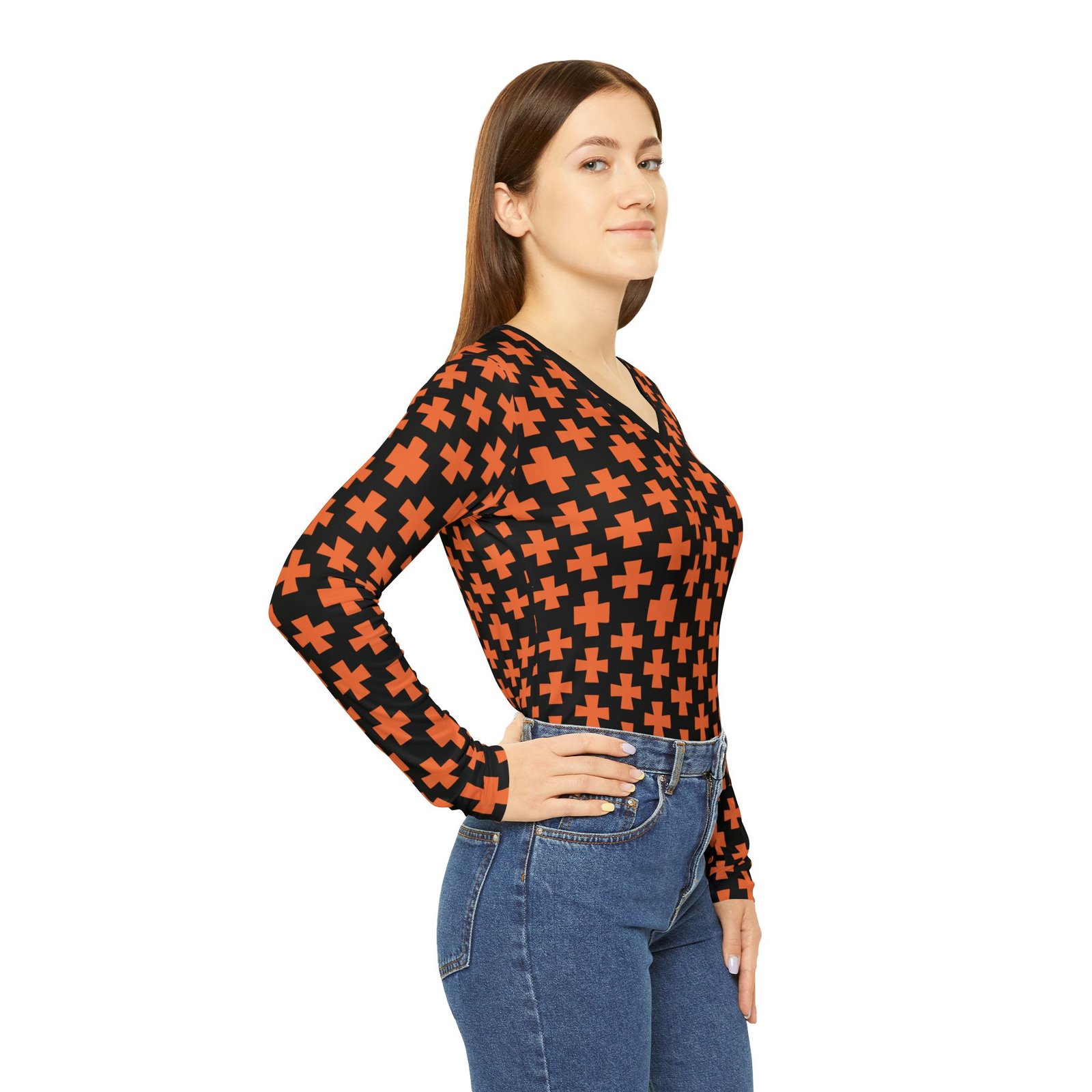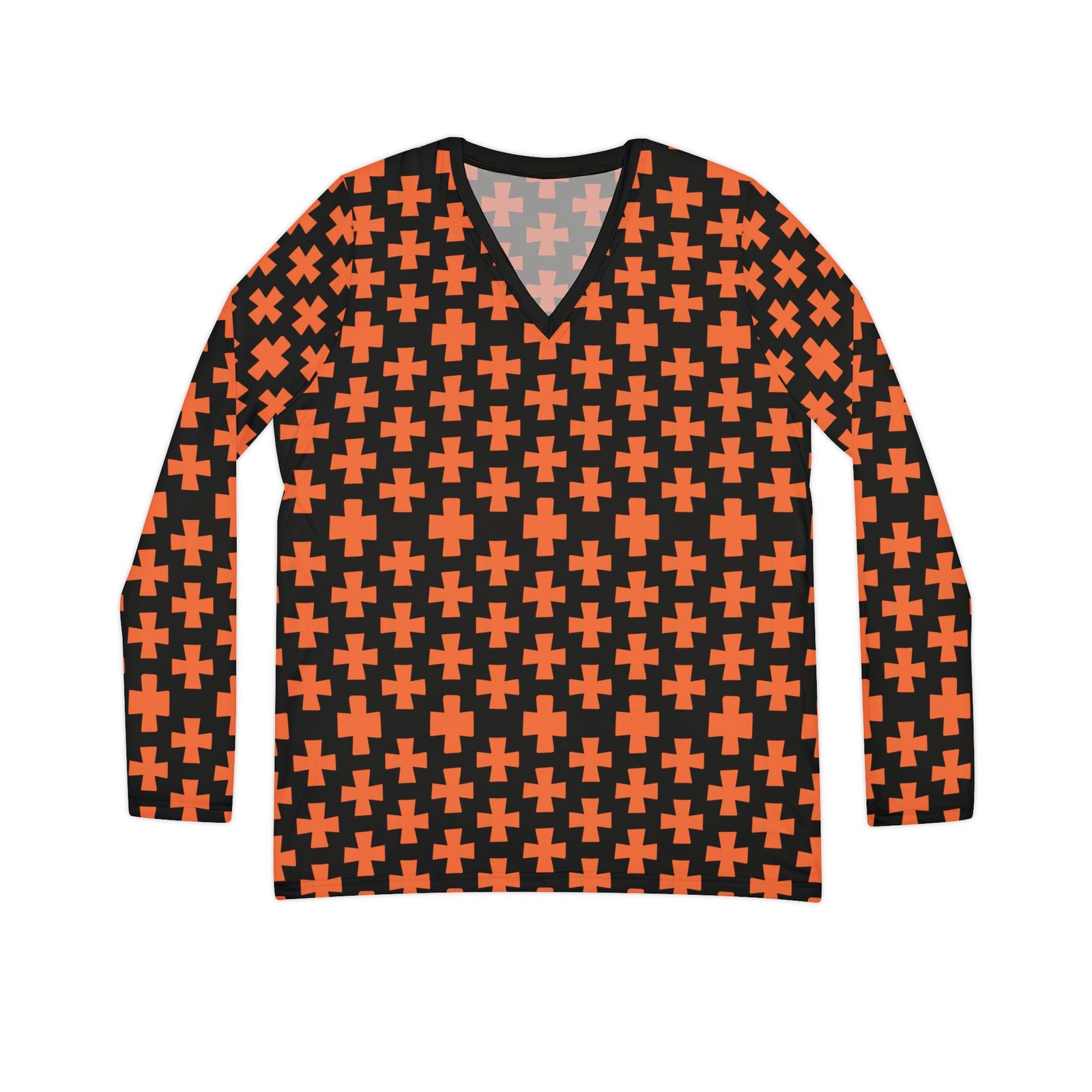 Orange Maltese Crosses Pattern – Orange on Black – Women’s Long Sleeve V-neck Shirt – Tee.
