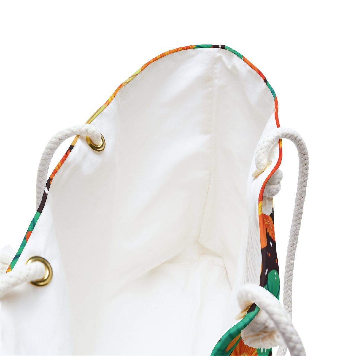 DESIGN: This super cute design is an illustration of beautiful and colorful orange and green and yellow and reddish-pink flowers on a very dark chocolate background. Colors are orange, yellow, reddish-pink, green, dark chocolate, and white. The bag is dark chocolate with white rope handles.