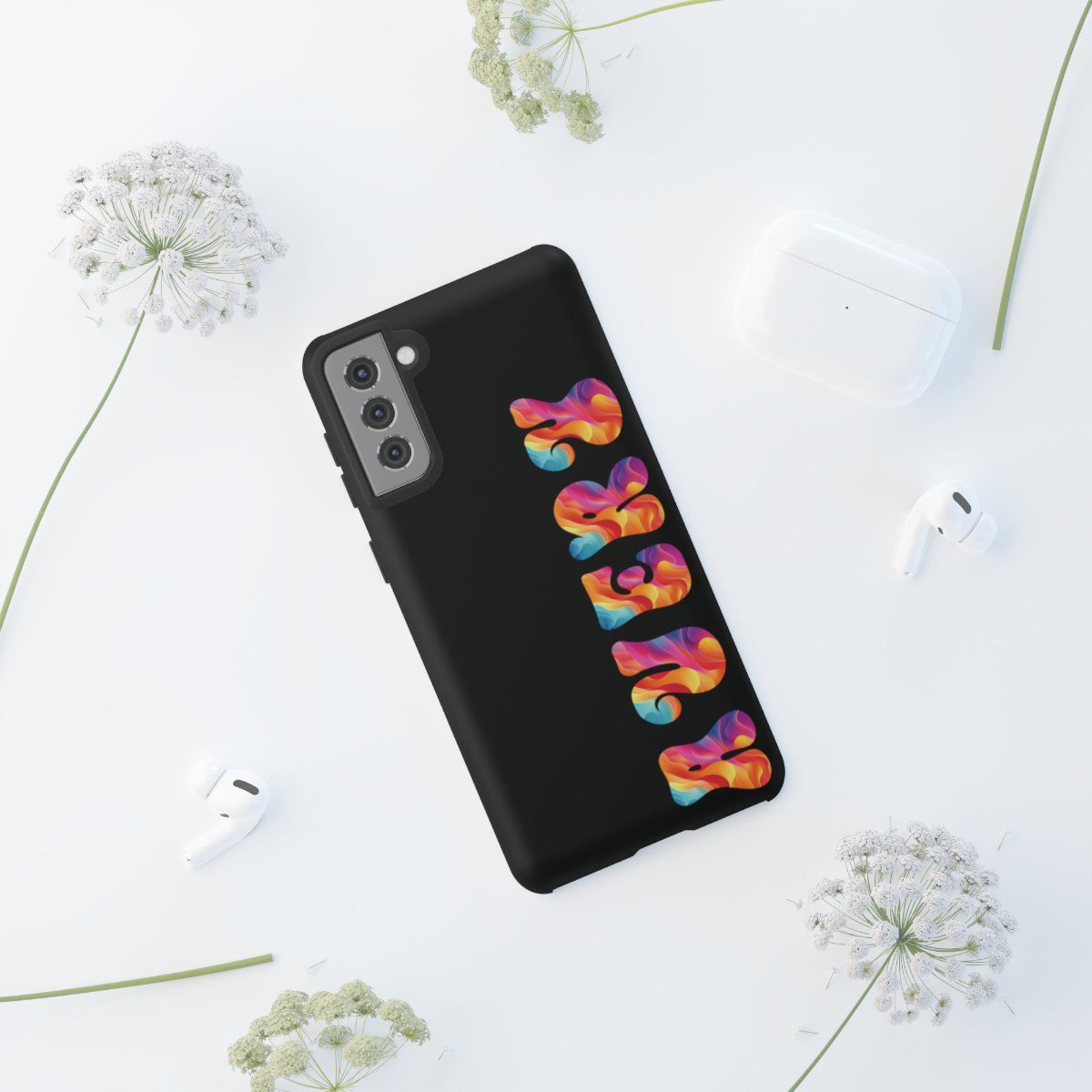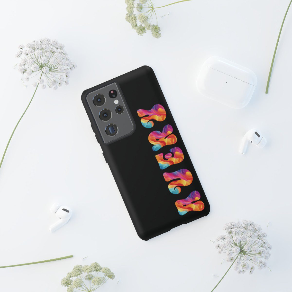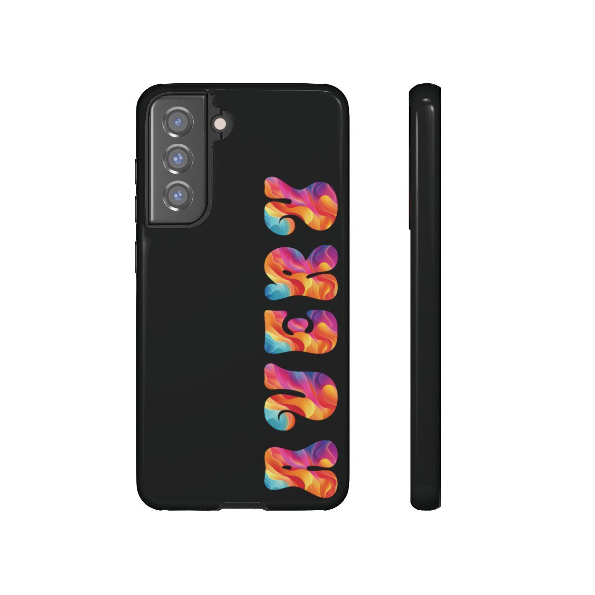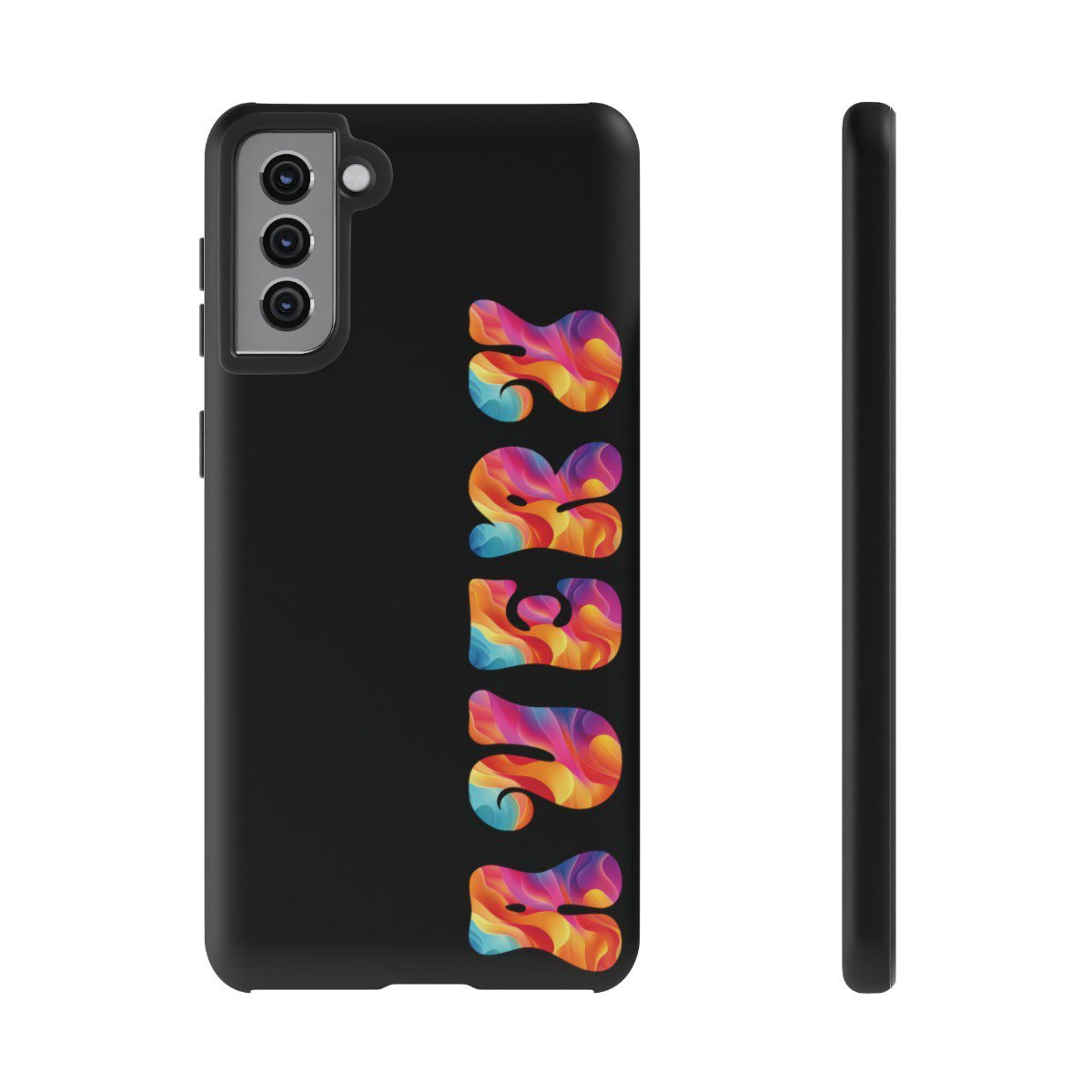 DESIGN: Personalized Name Frame – Neon Fire – Retro Font. Colors are yellow, orange, red, pink, purple, and blue on a black background. The longer your name, the smaller each letter will be. We hope you love it! Super cute design for your phone.