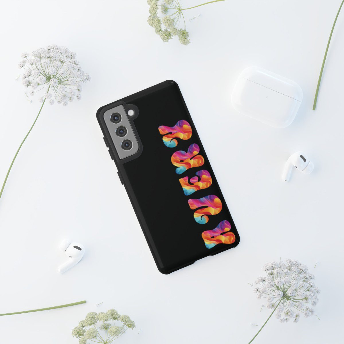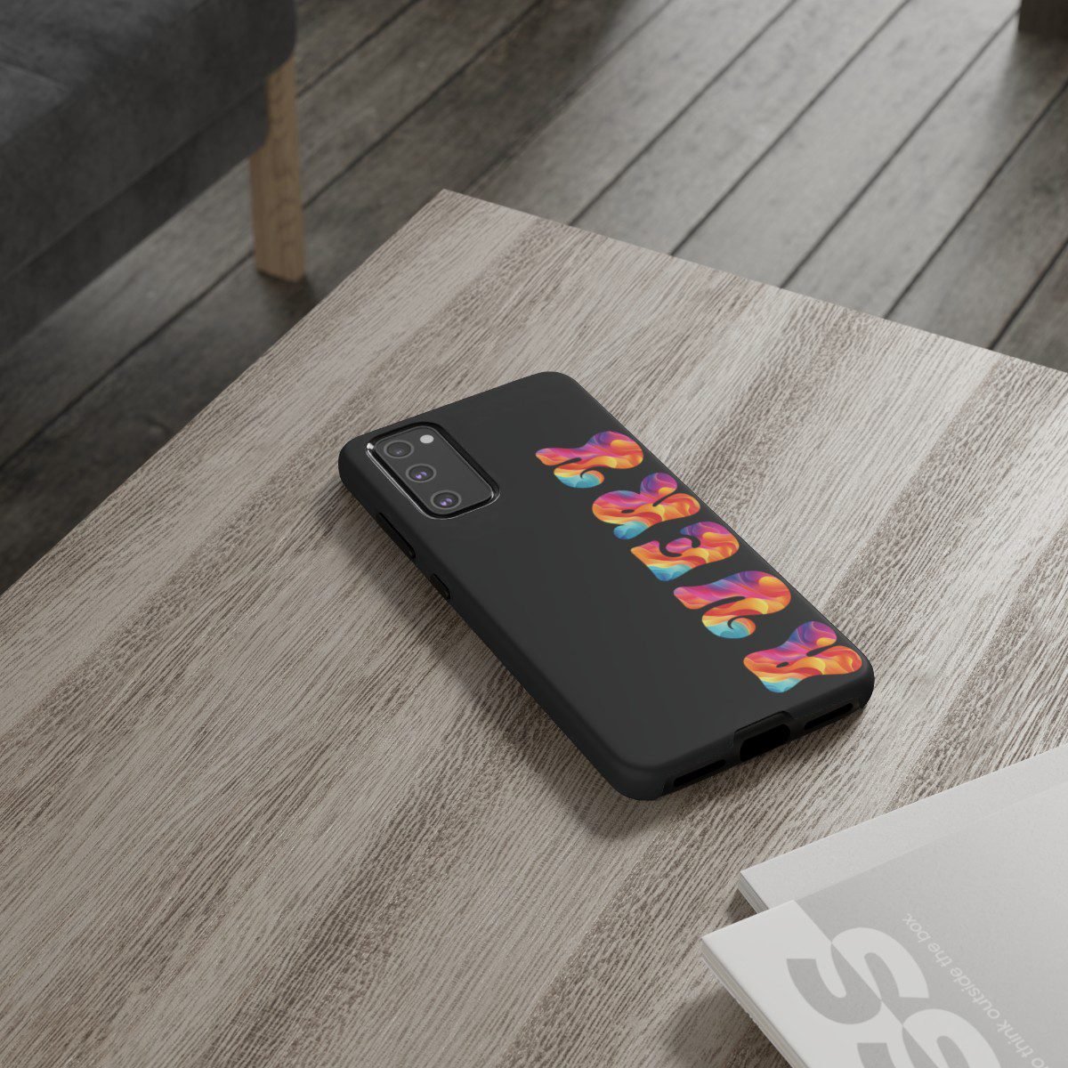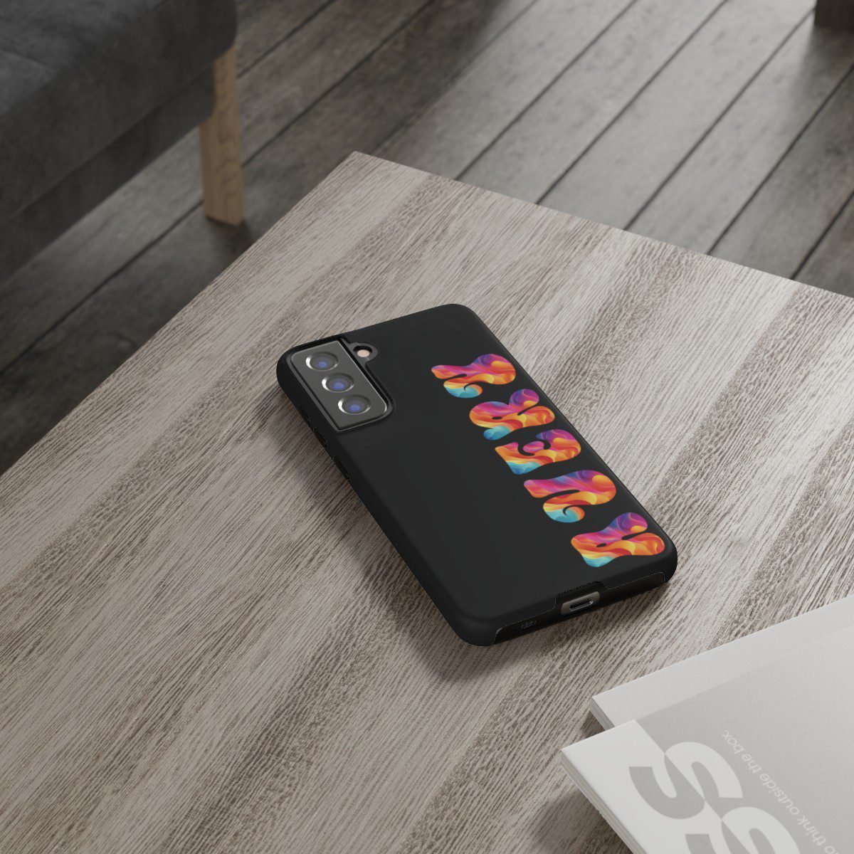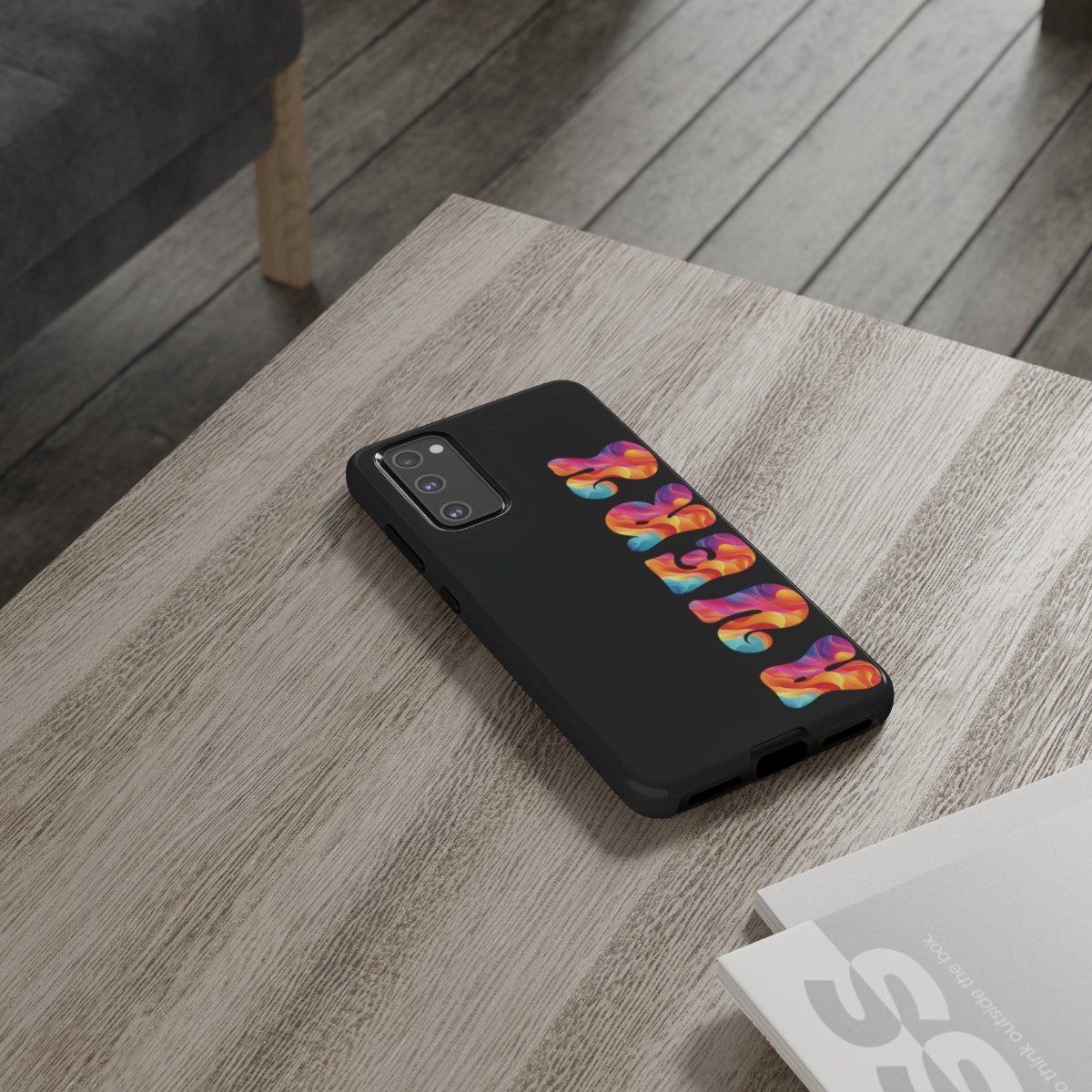 DESIGN: Personalized Name Frame – Neon Fire – Retro Font. Colors are yellow, orange, red, pink, purple, and blue on a black background. The longer your name, the smaller each letter will be. We hope you love it! Super cute design for your phone.