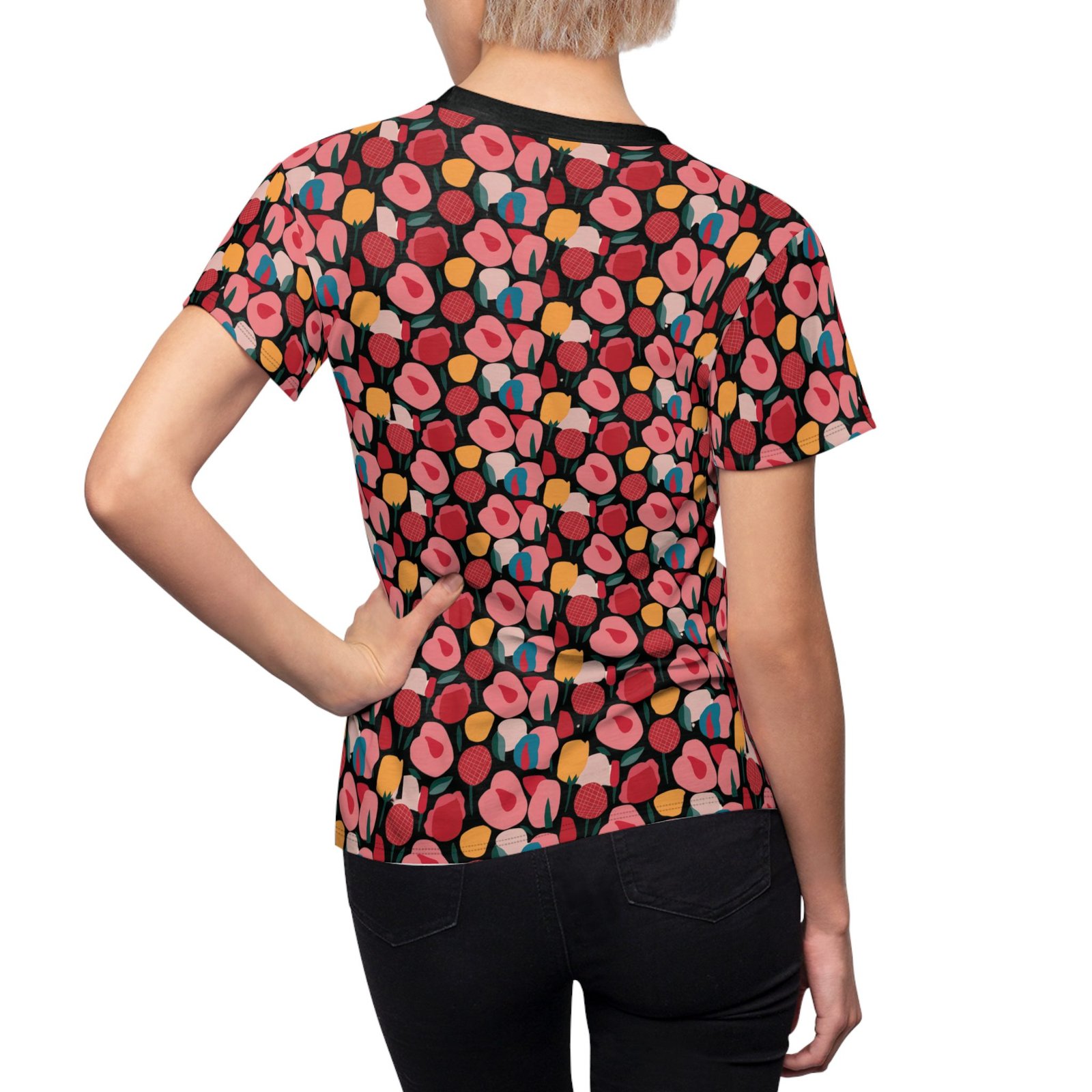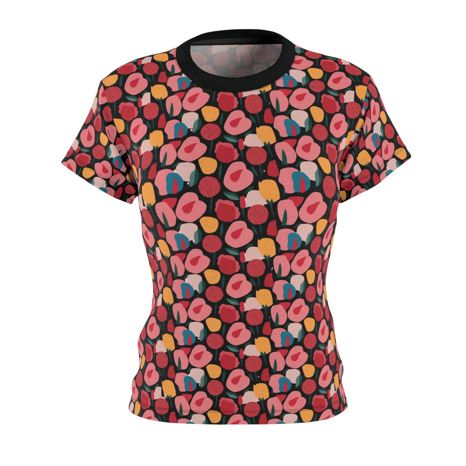 Pink Modern Stylized Roses Pattern – Pink Red Yellow on Black – Women’s Cut & Sew Tee – T-Shirt.