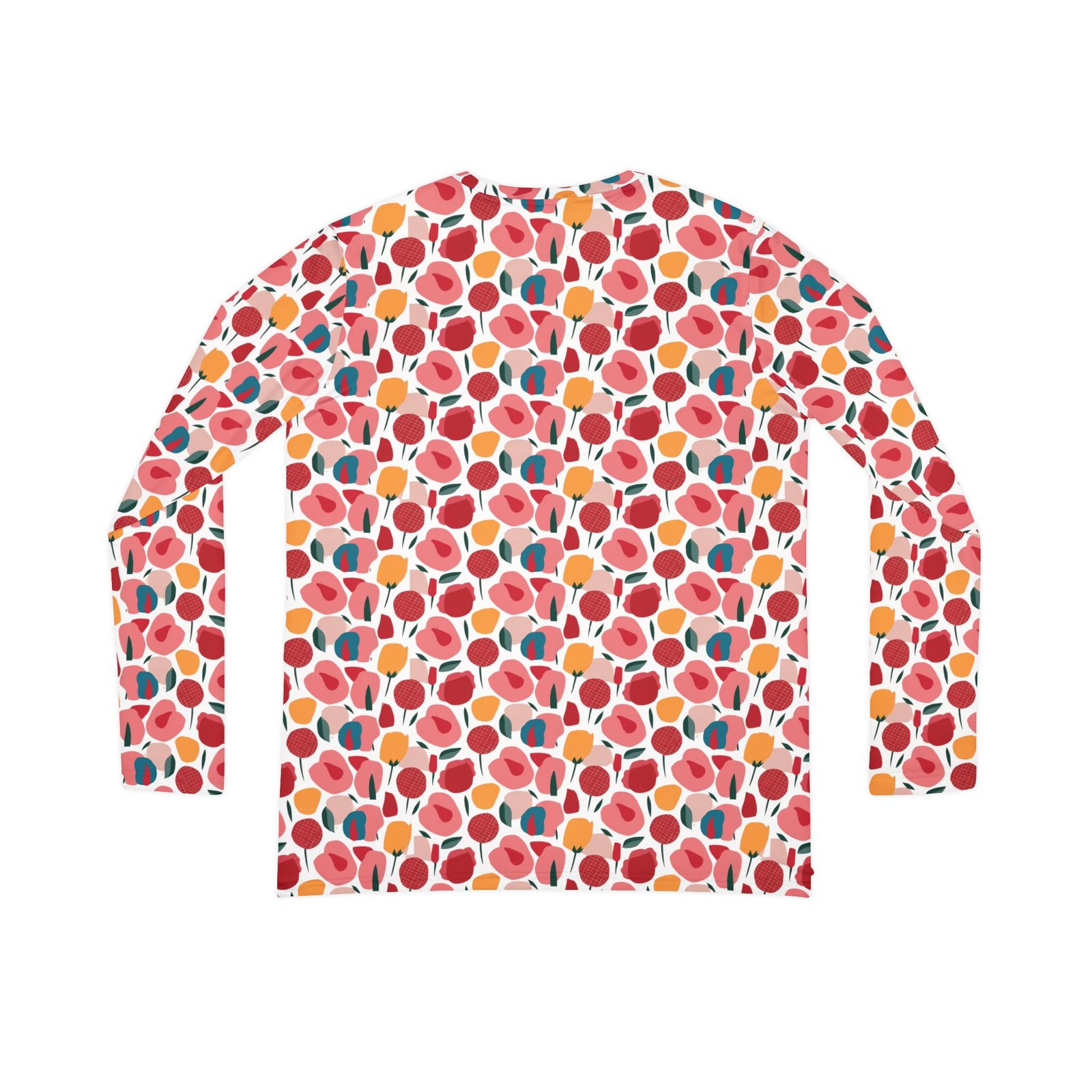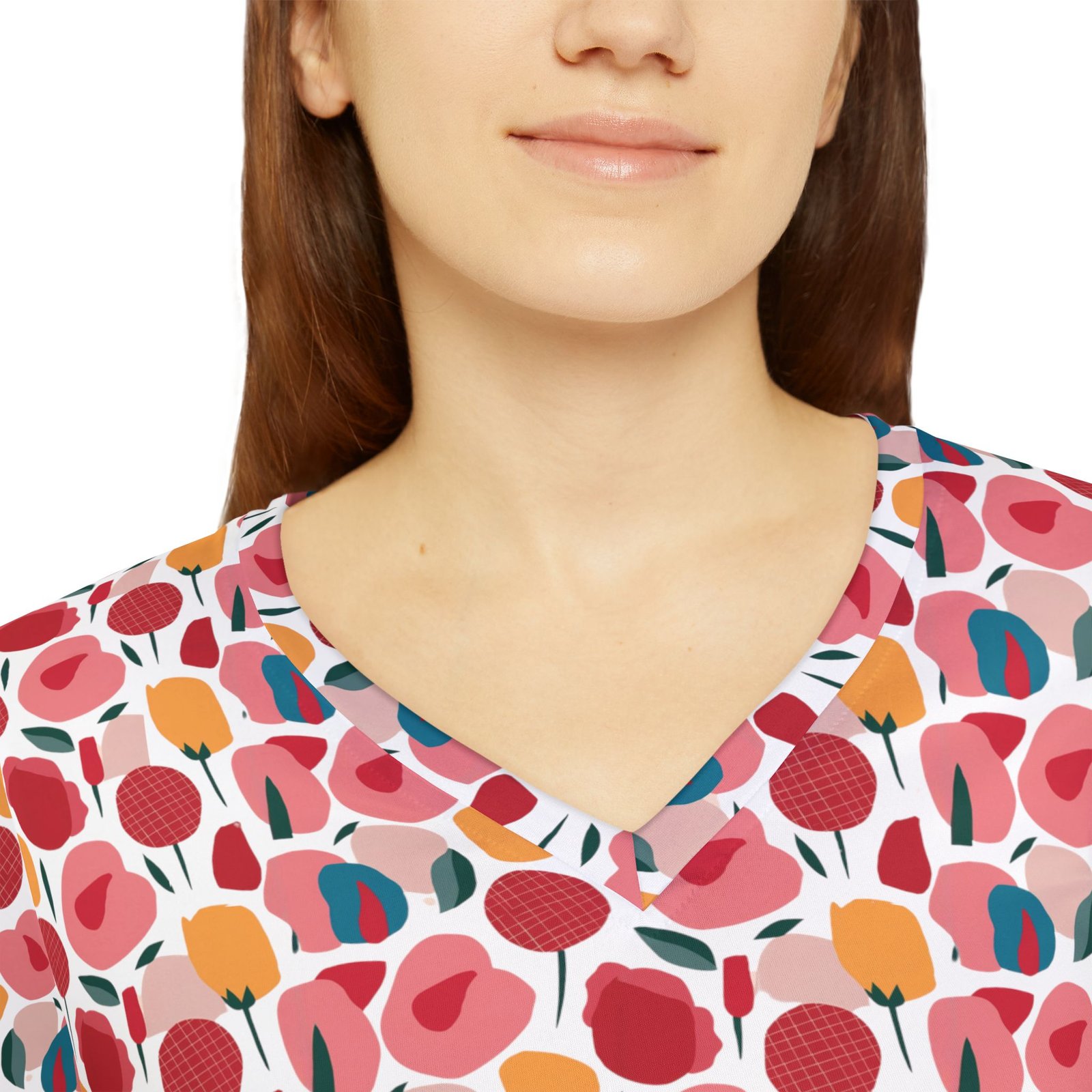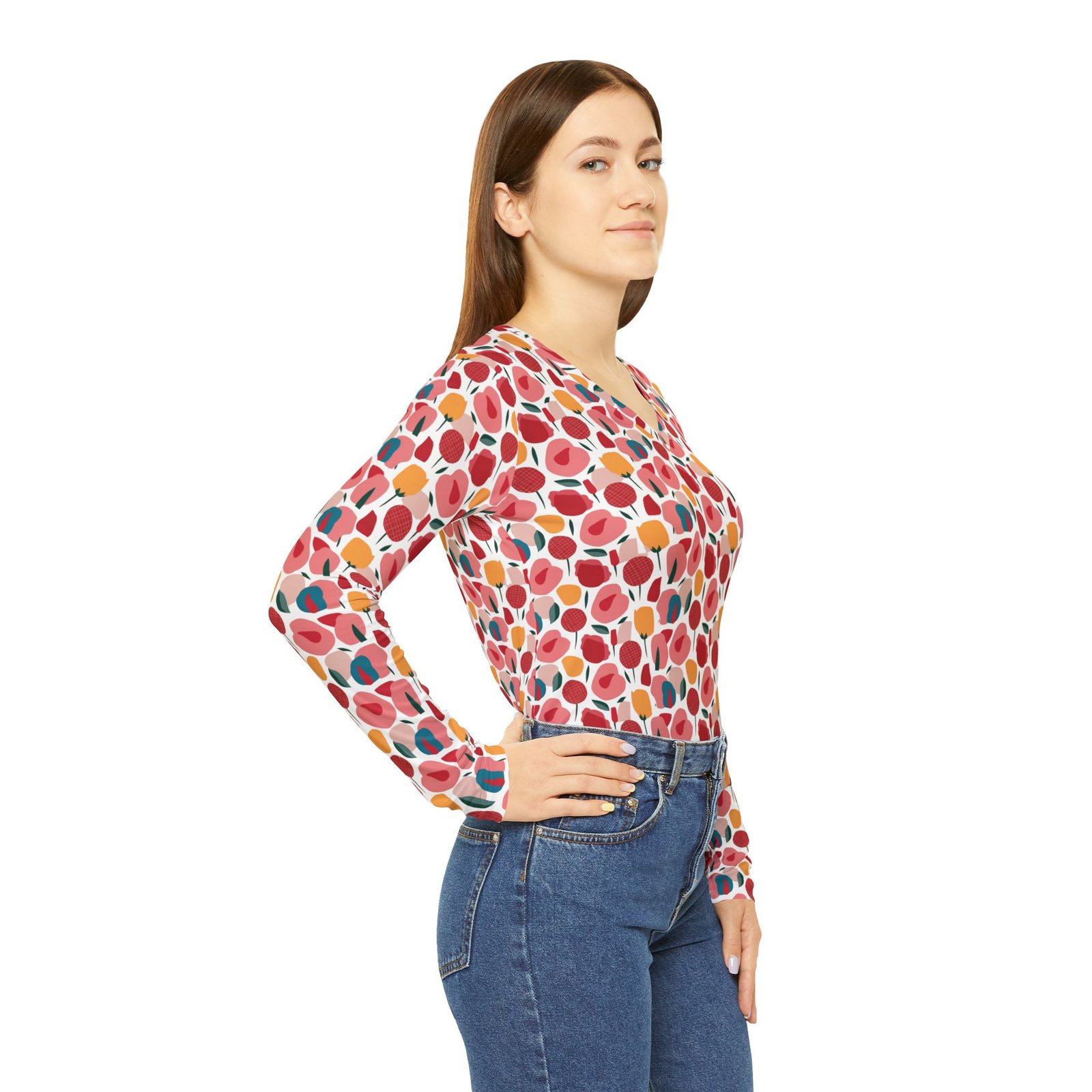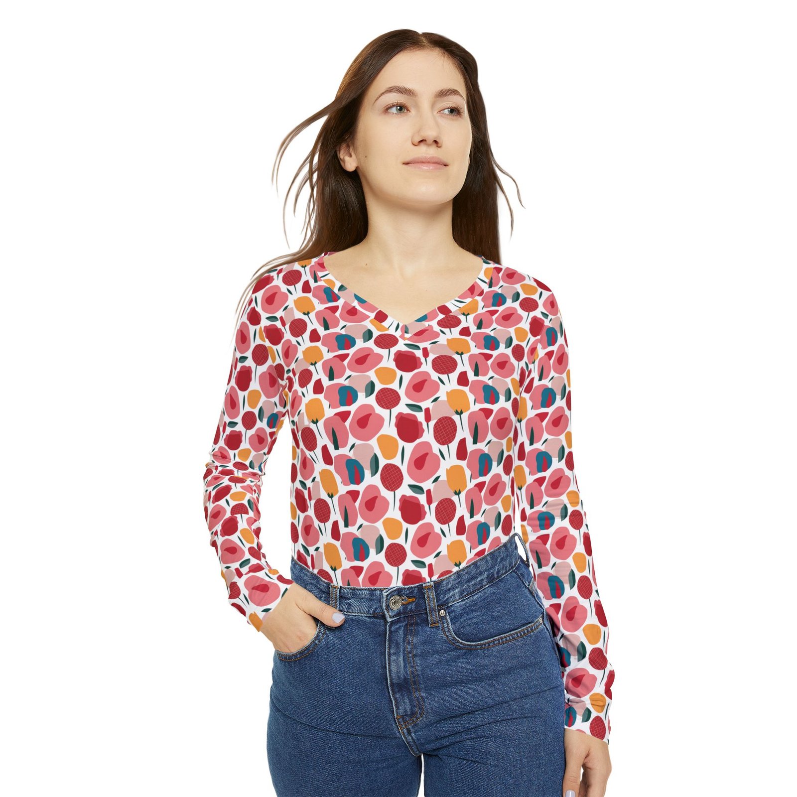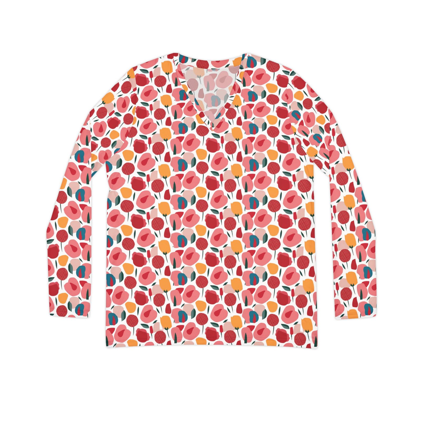 Pink Stylized Roses Pattern – Pink Red Yellow on White – Women’s Long Sleeve V-neck Shirt – Tee.