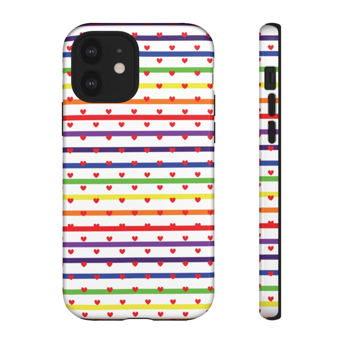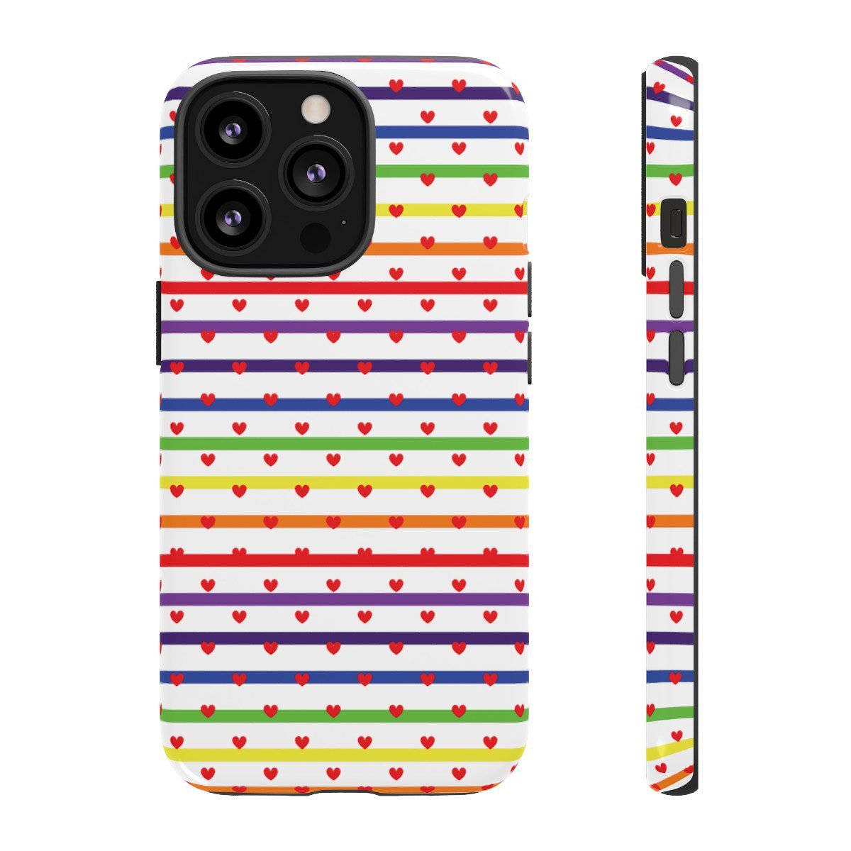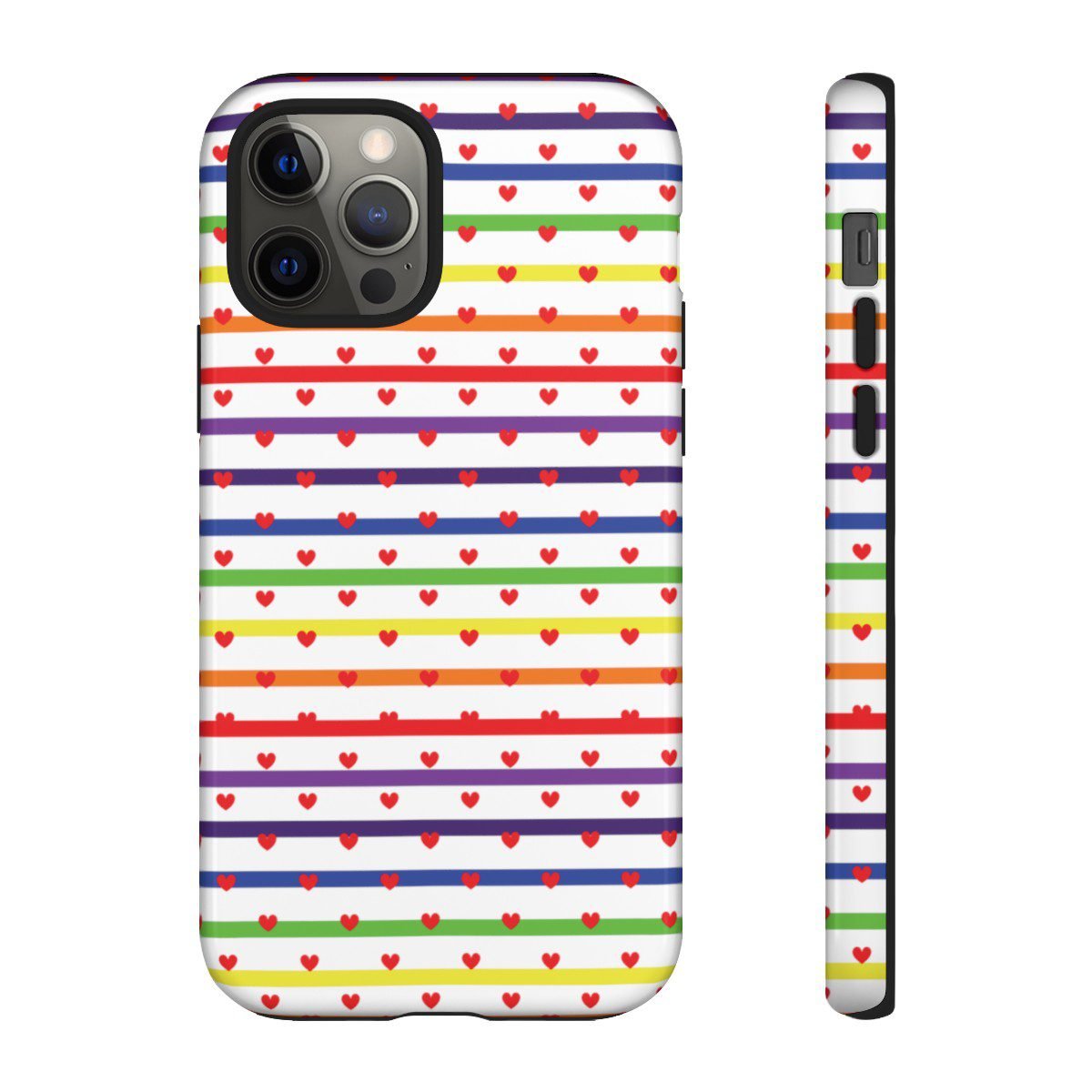 Rainbow and White Stripes With Hearts – iPhone 12 13 – Cell Phone – Tough Cases.