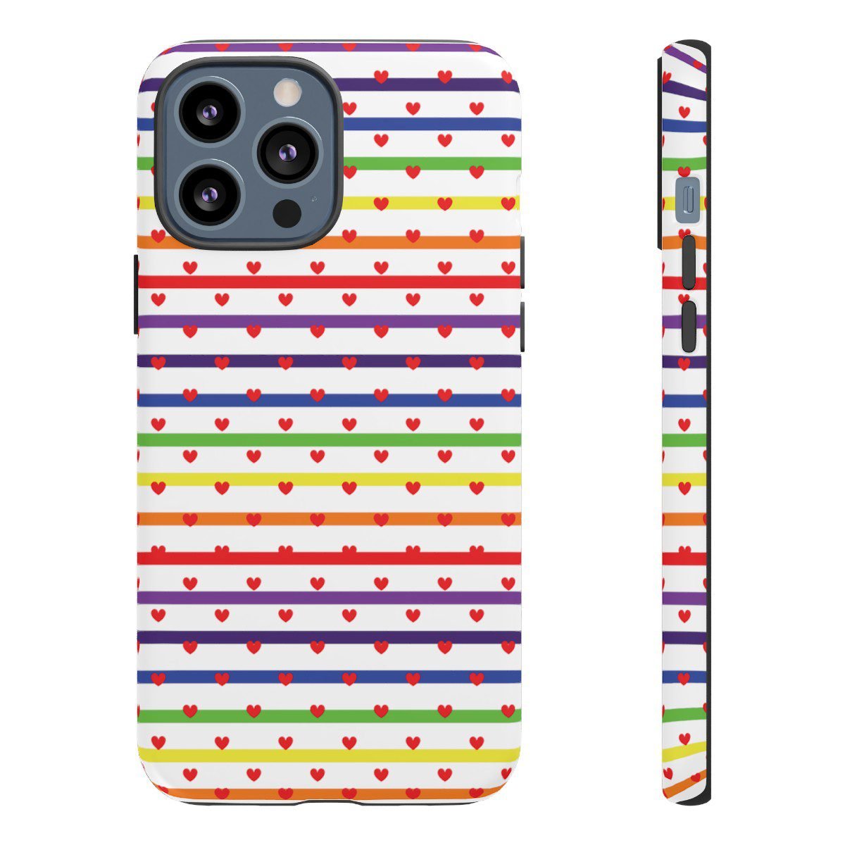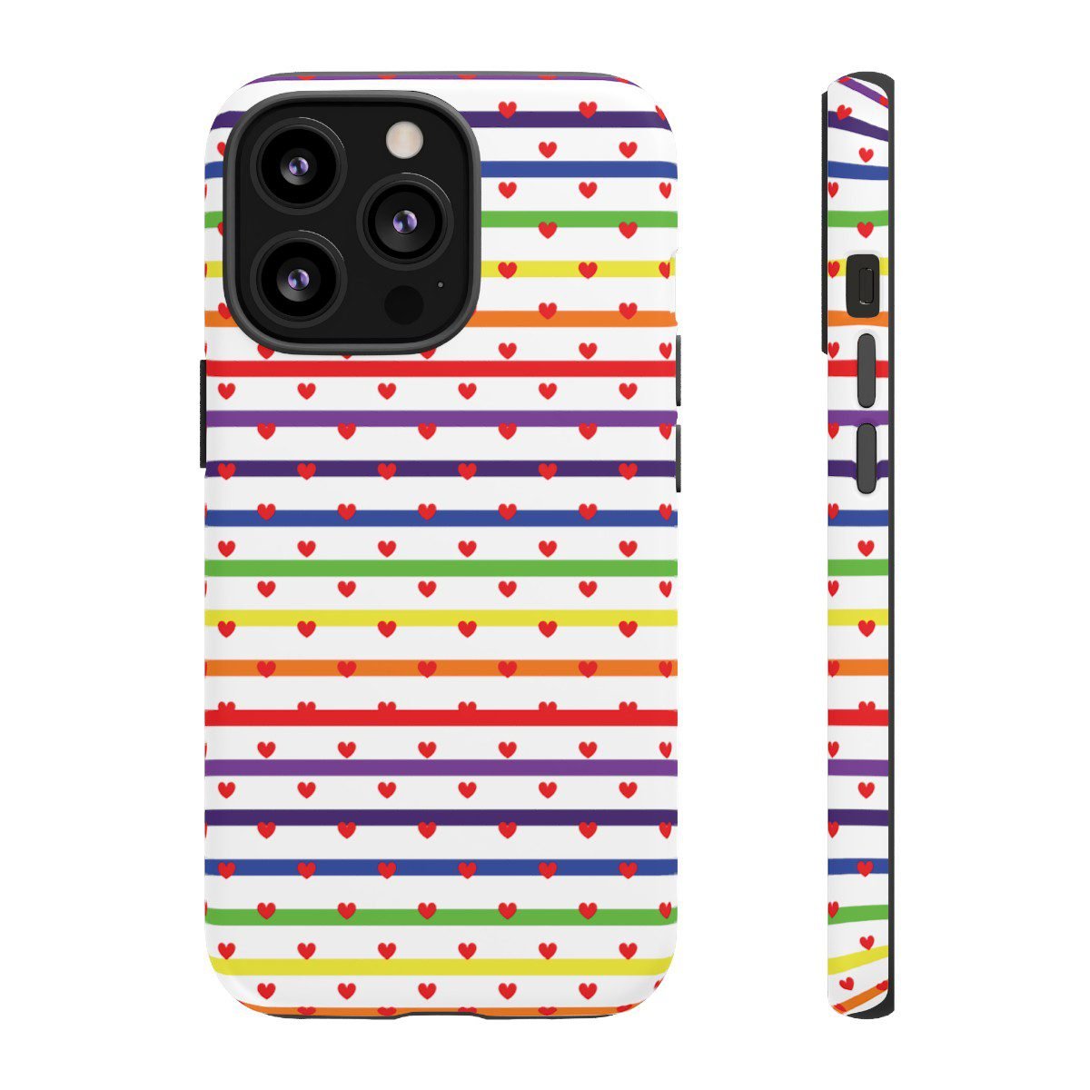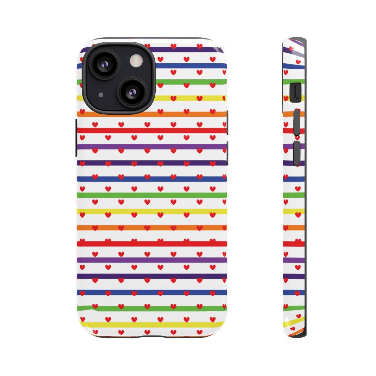 Rainbow and White Stripes With Hearts – iPhone 12 13 – Cell Phone – Tough Cases.