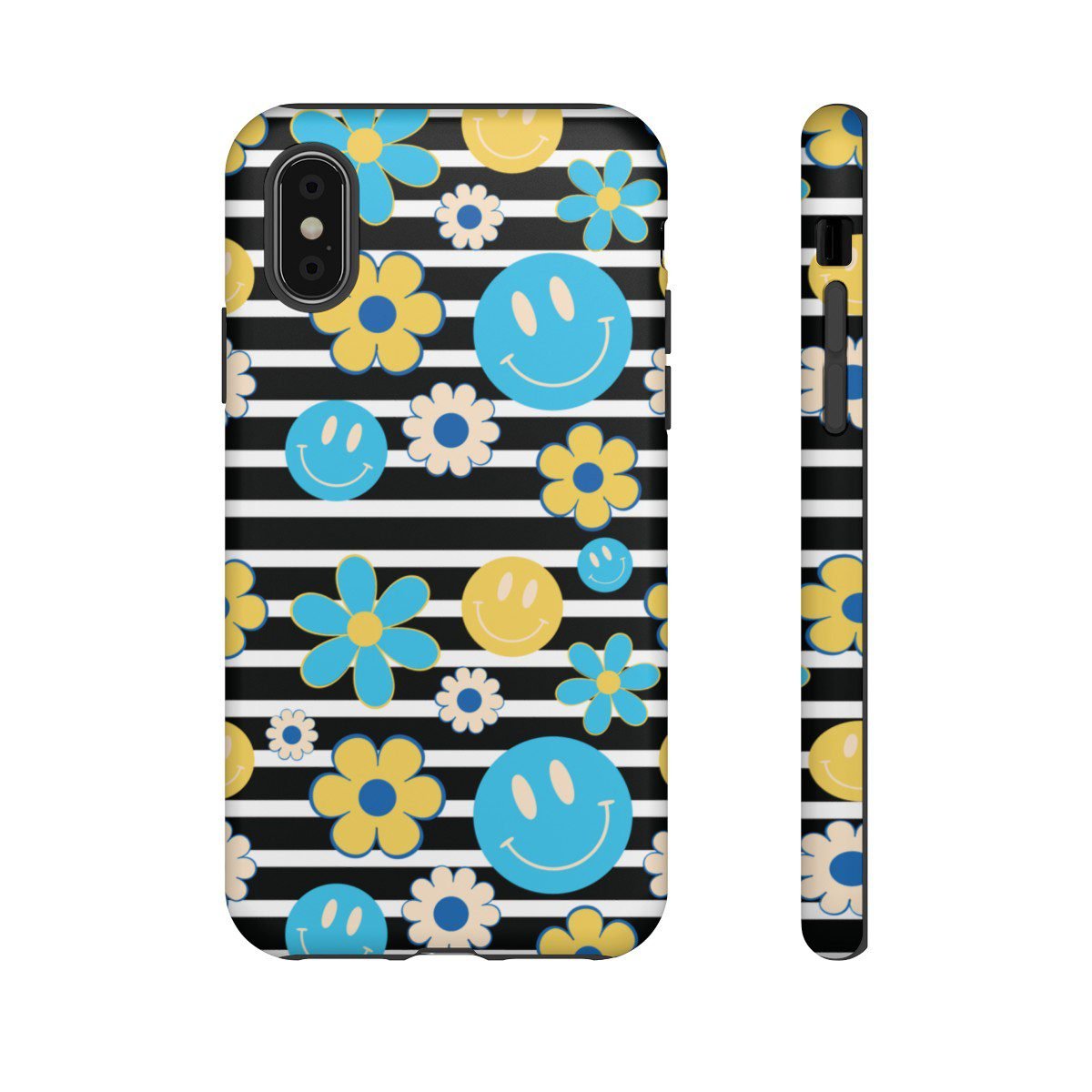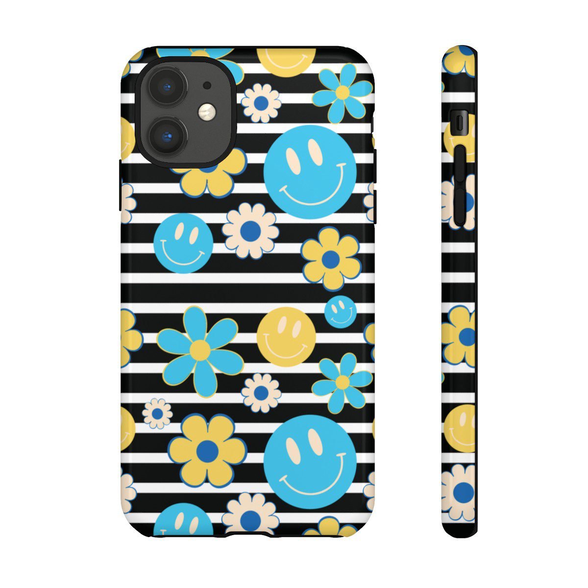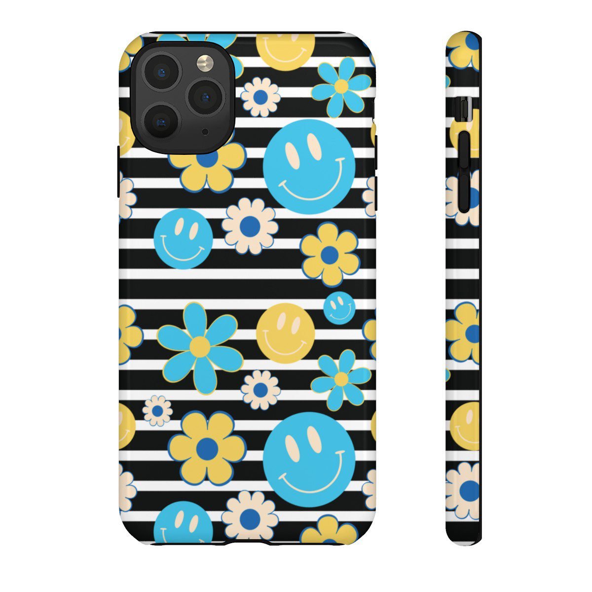 Retro Aqua Yellow Flowers and Stripes – iPhone 8 X 11 – Cell Phone – Tough Cases.