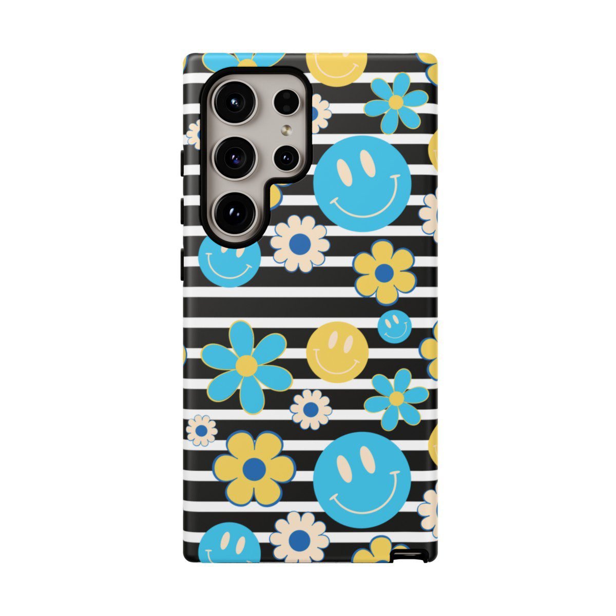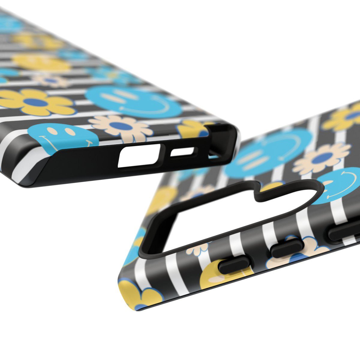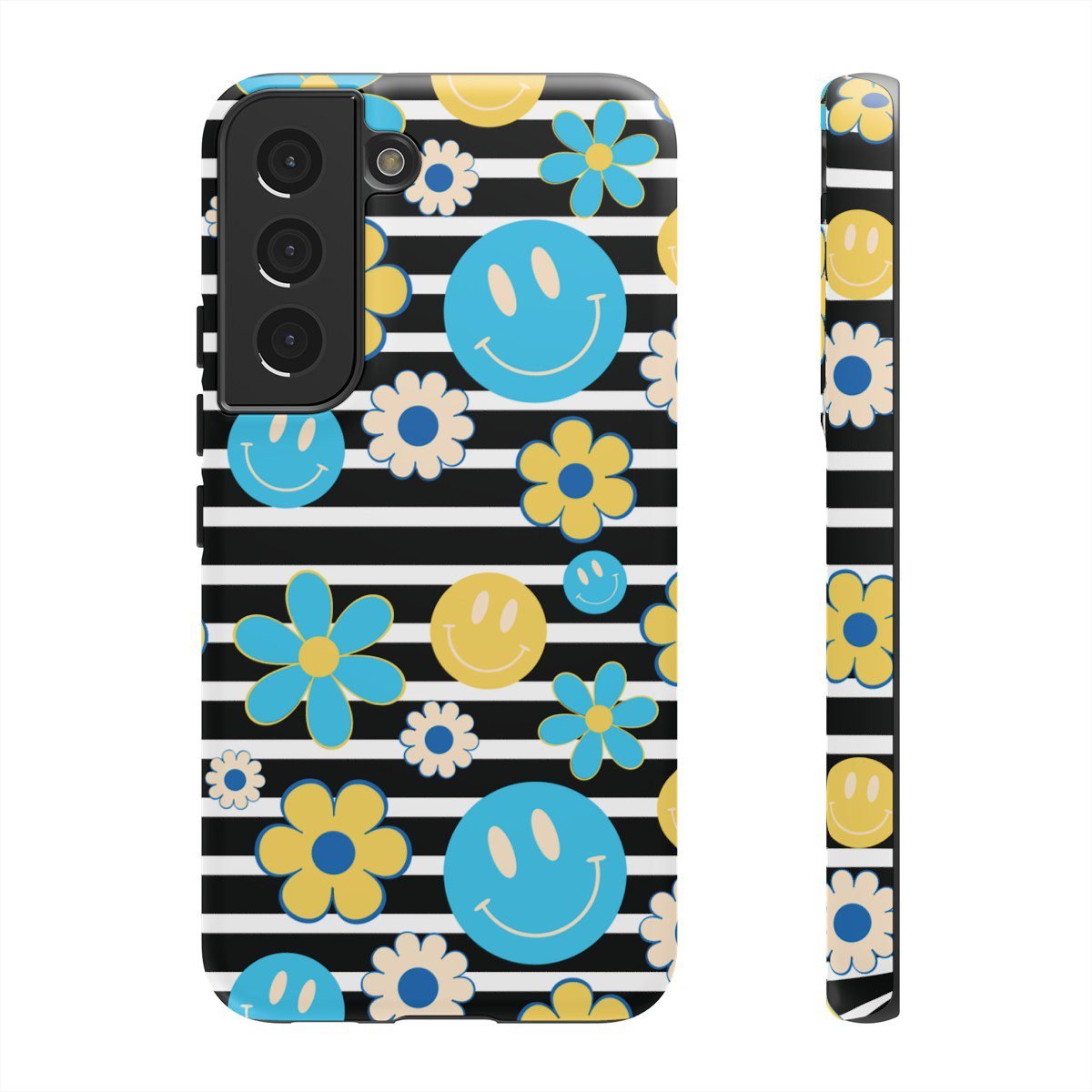 Retro Aqua Yellow Flowers and Stripes – Samsung Galaxy S22 S23 S24 – Cell Phone – Tough Cases.