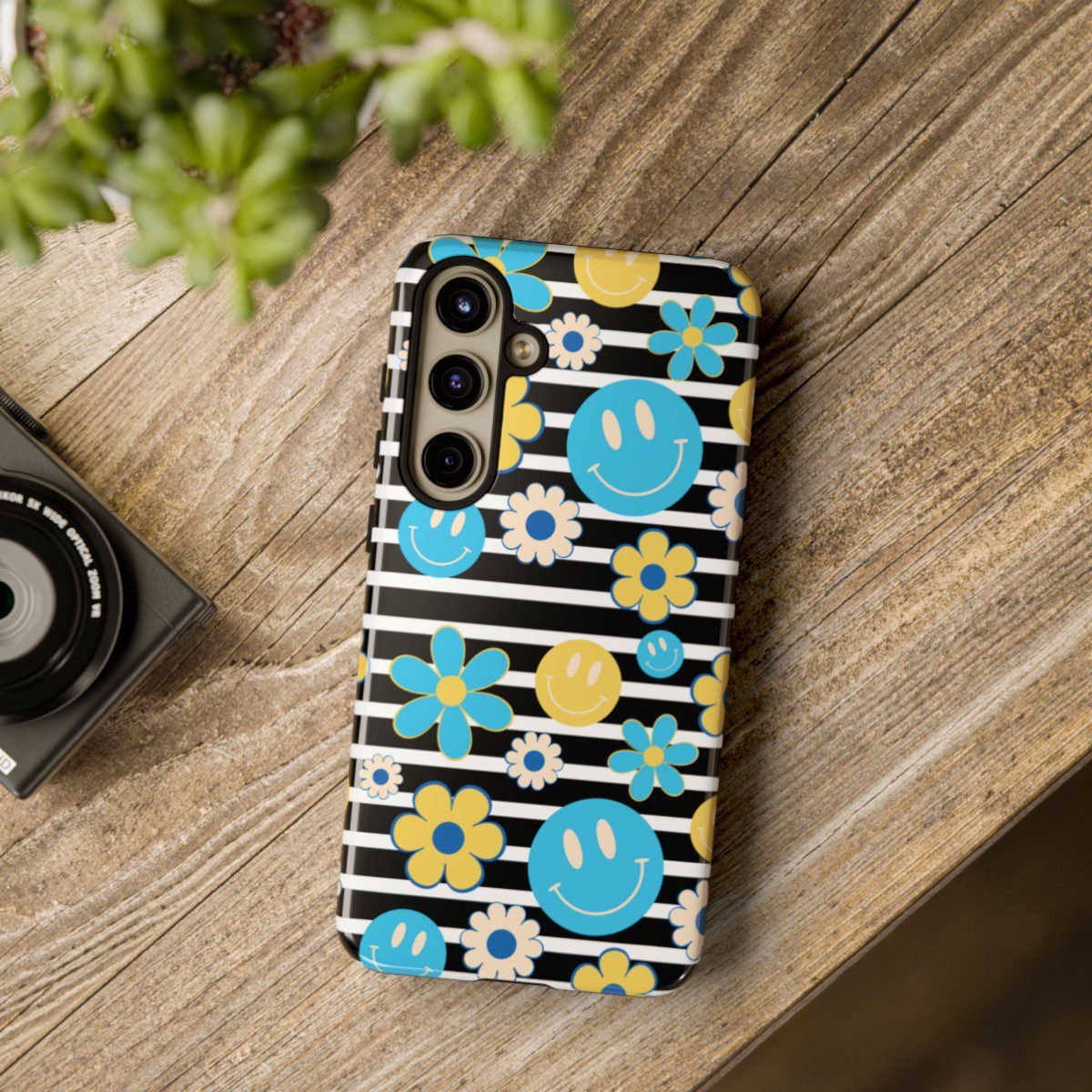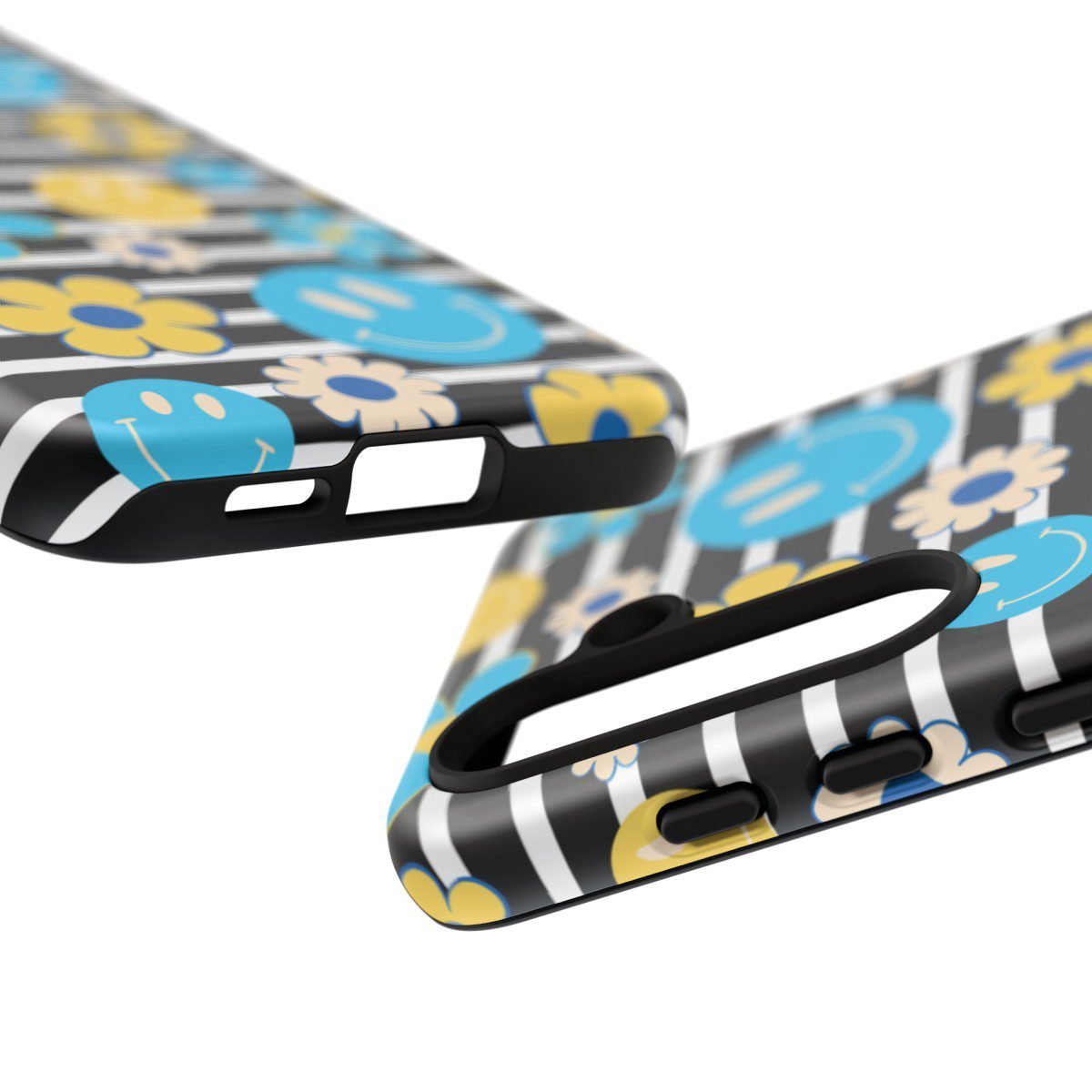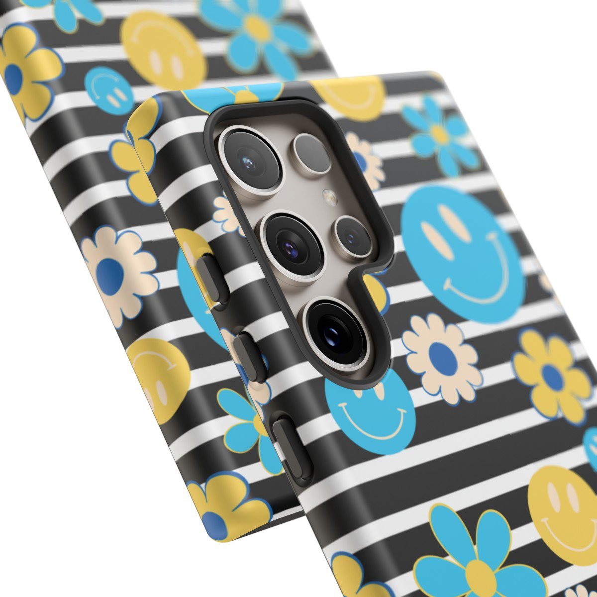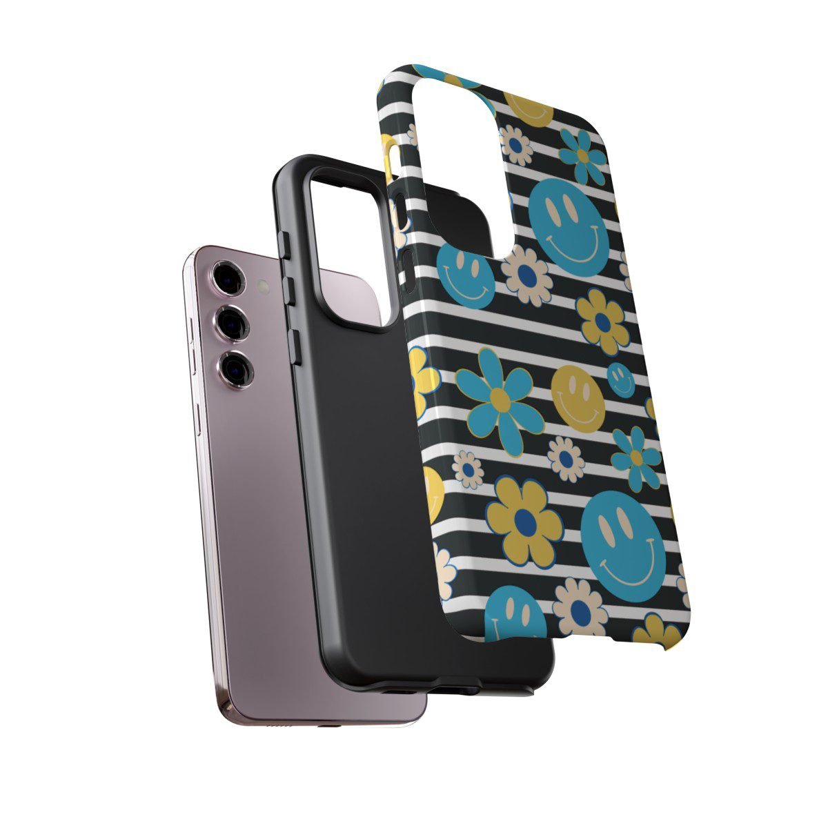 Retro Aqua Yellow Flowers and Stripes – Samsung Galaxy S22 S23 S24 – Cell Phone – Tough Cases.