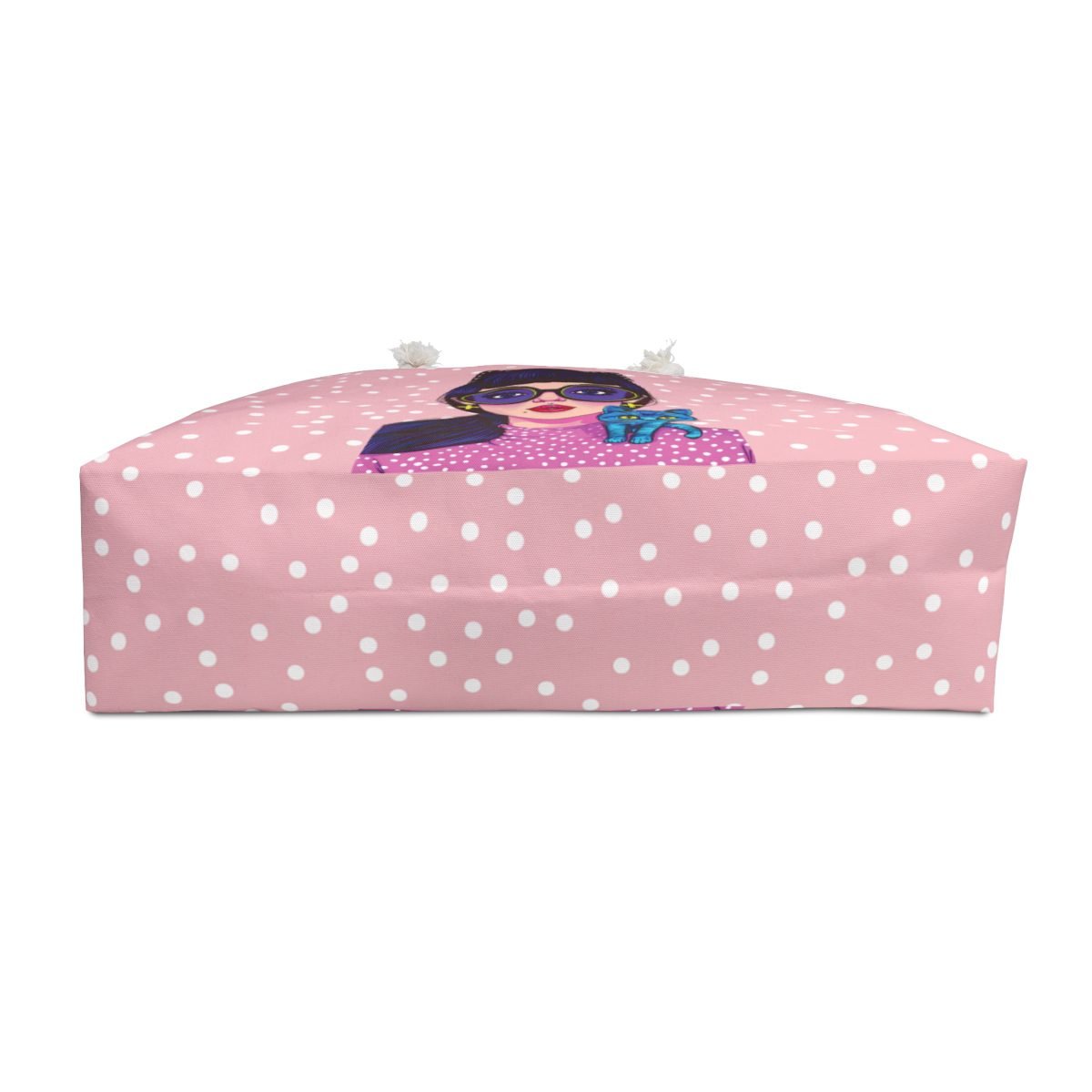 DESIGN: This super cute design is an illustration of a cute retro yet modern fashion model. Retro rockabilly hair with bangs, little cat ears on top of her head, with retro sunglasses, with gold cross earrings, and polka dot turtleneck top. Her little shades of blue kitten is on her shoulder. The background ir a light orange with bokeh lights. Colors are green, orange, white, red, yellow, and black. The bag is orange with white rope handles.