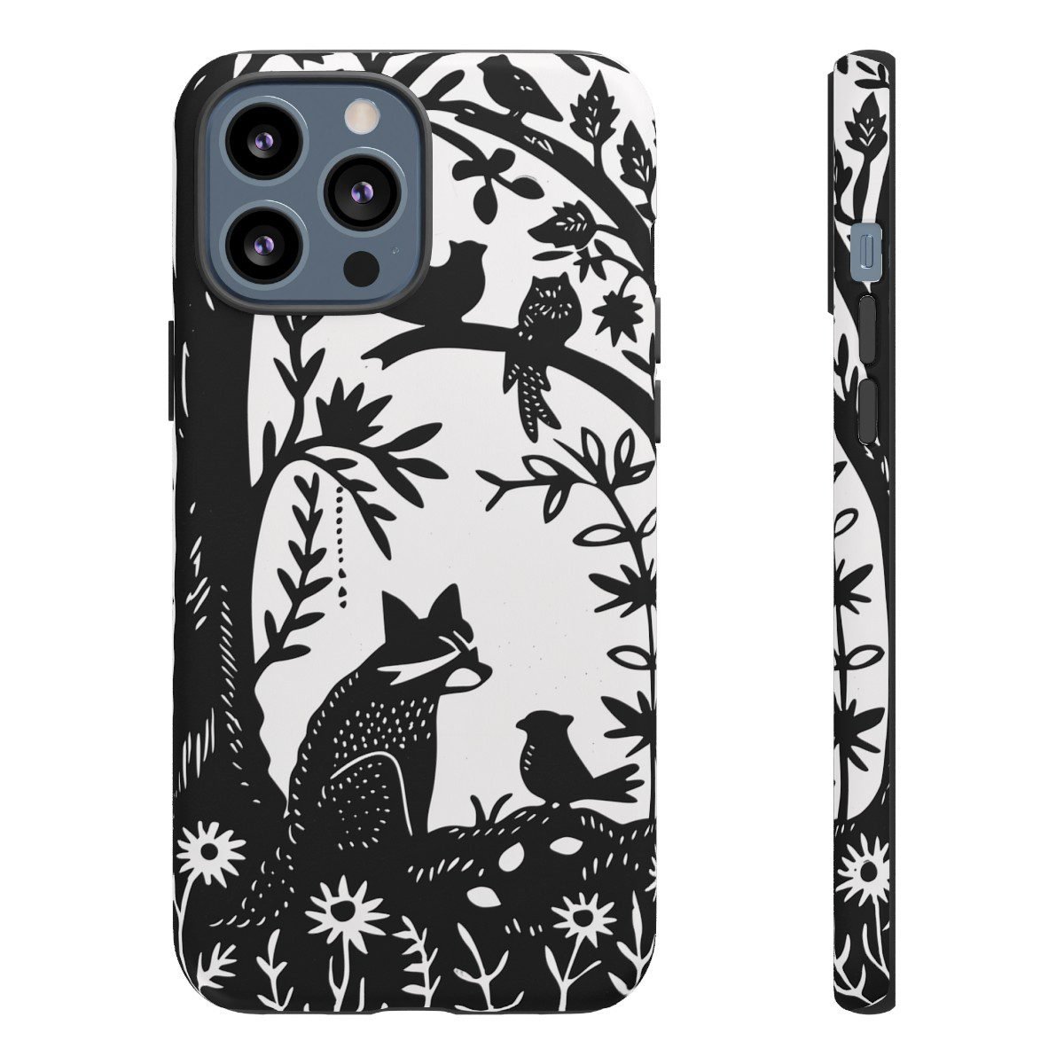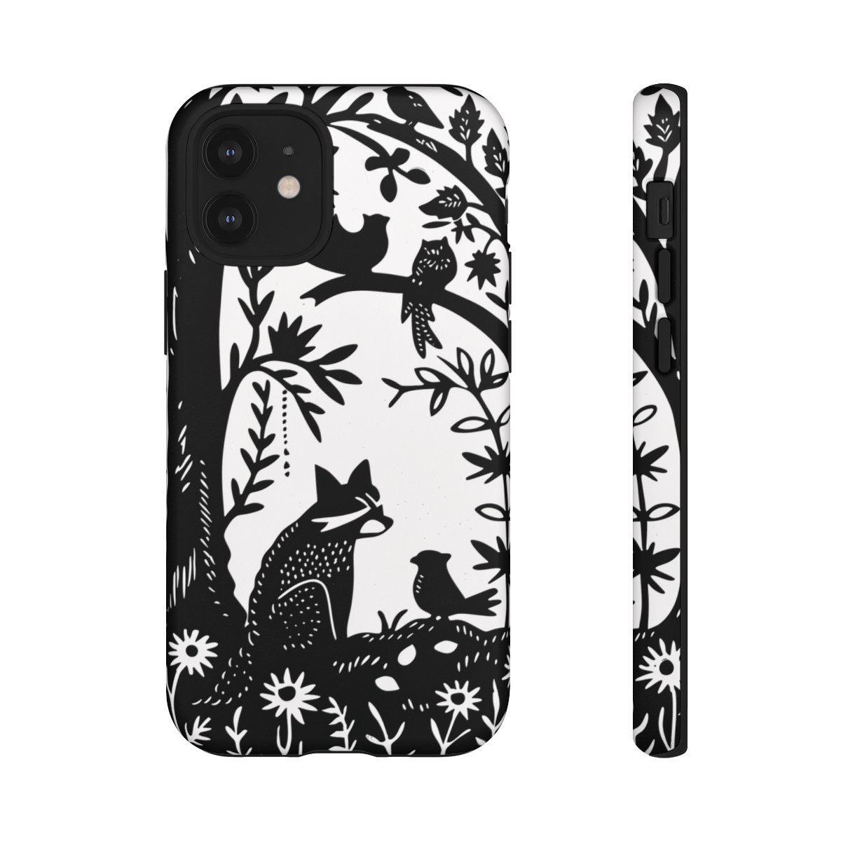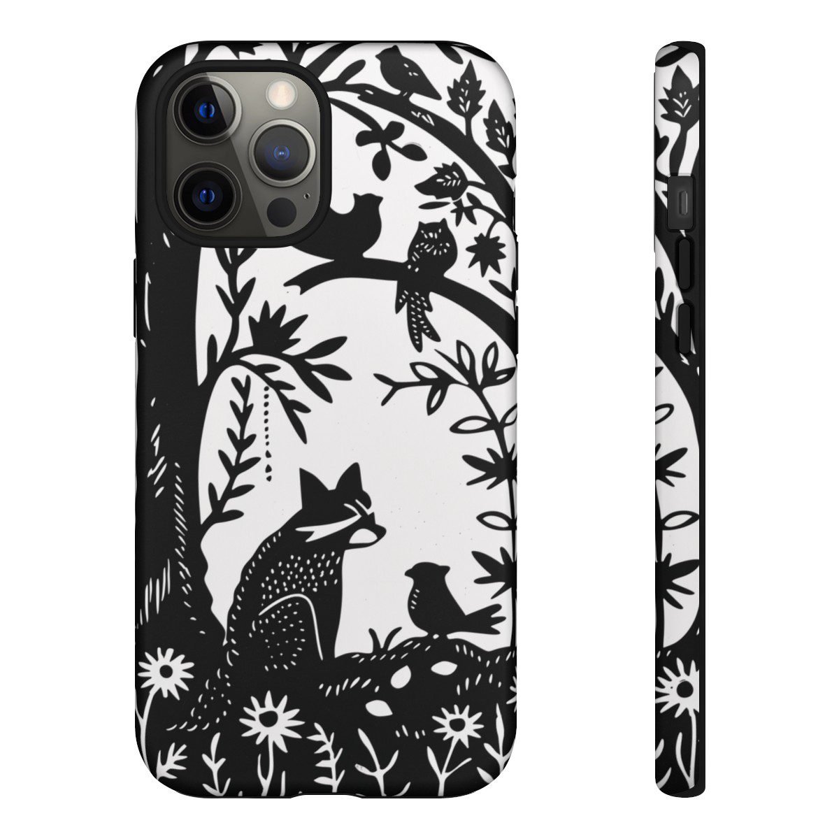 Retro Linocut Raccoon Birds Tree Flowers – iPhone 12 13 – Cell Phone – Tough Cases.