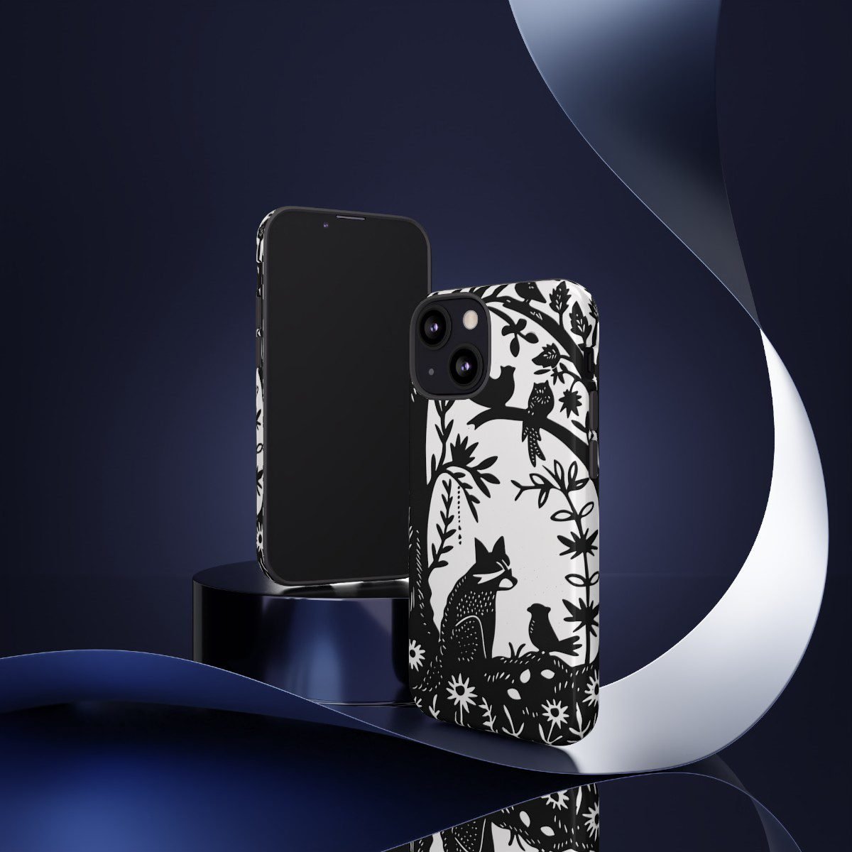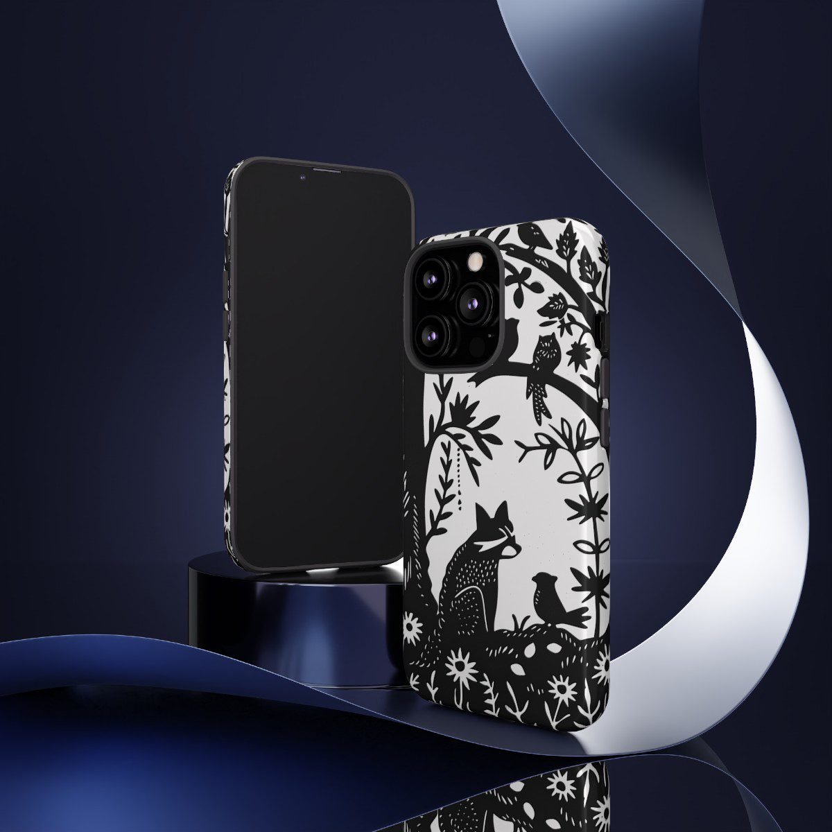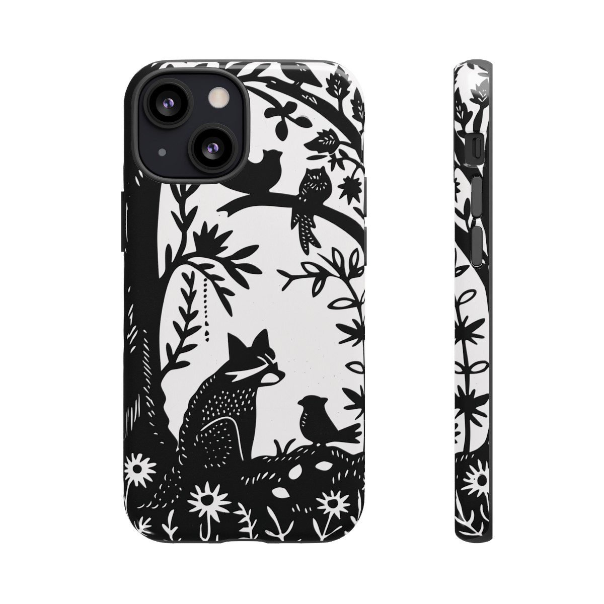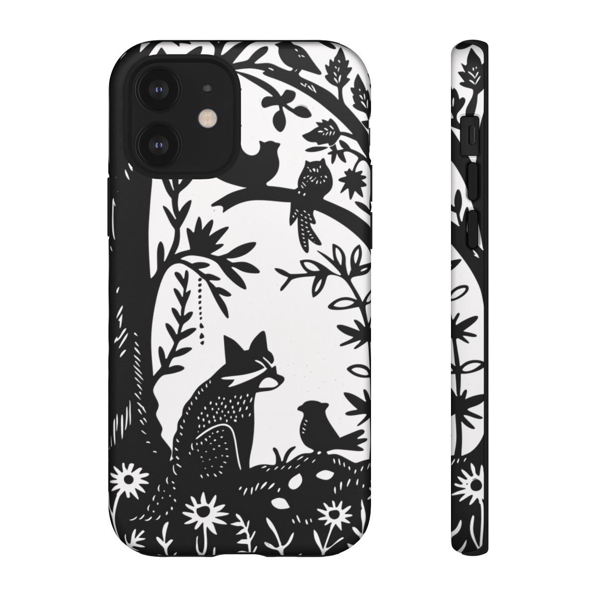 Retro Linocut Raccoon Birds Tree Flowers – iPhone 12 13 – Cell Phone – Tough Cases.