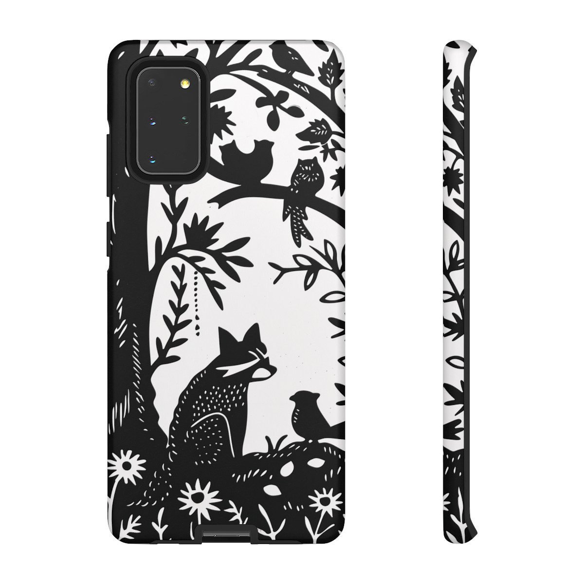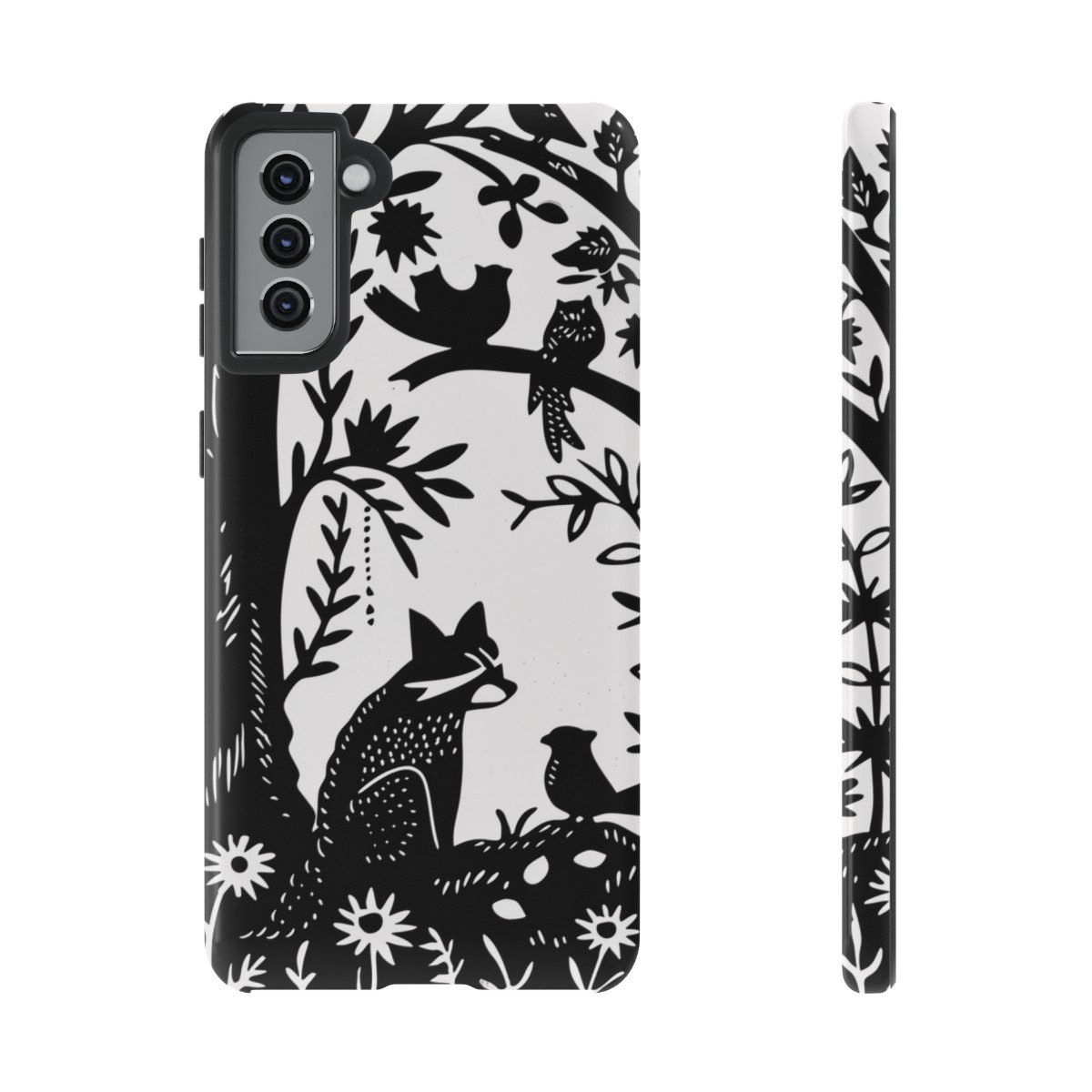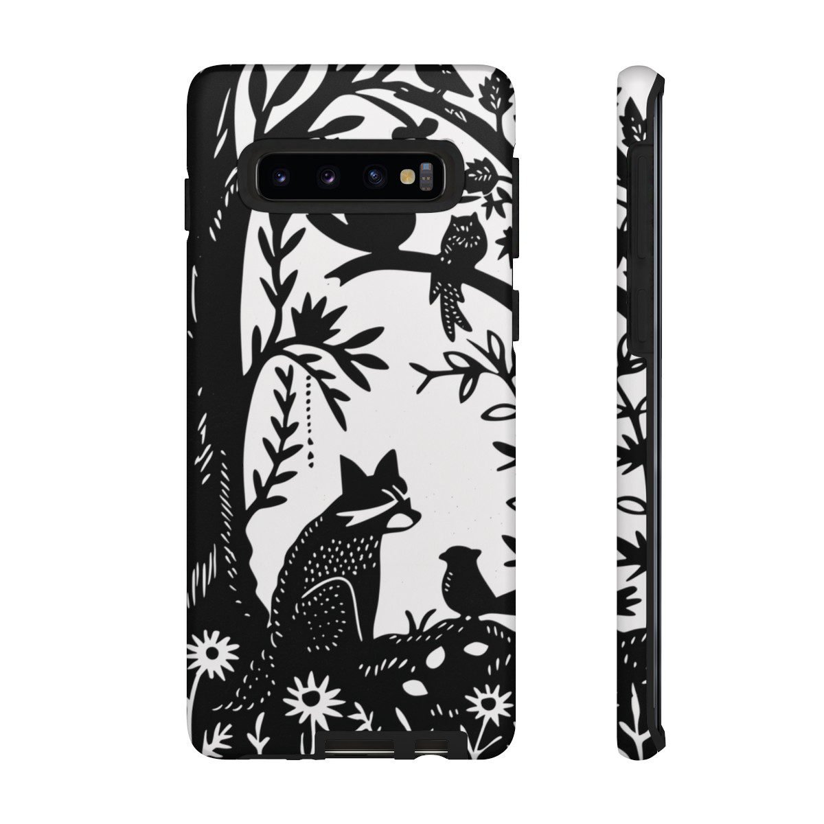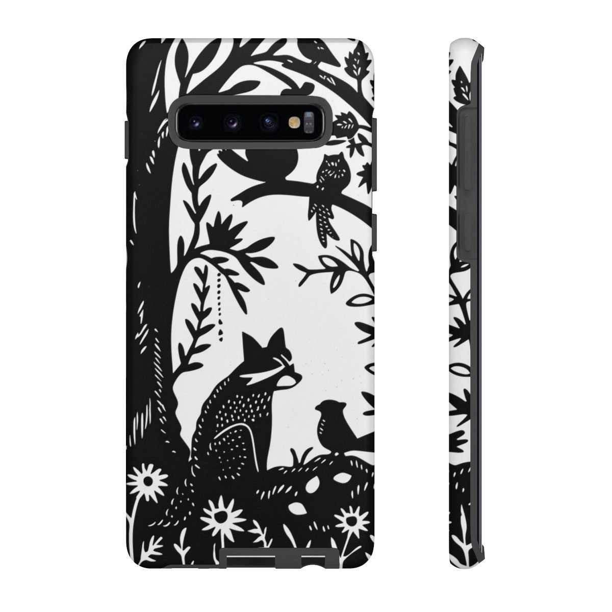Retro Linocut Raccoon Birds Tree Flowers – Samsung Galaxy S10 S20 S21 – Cell Phone – Tough Cases.