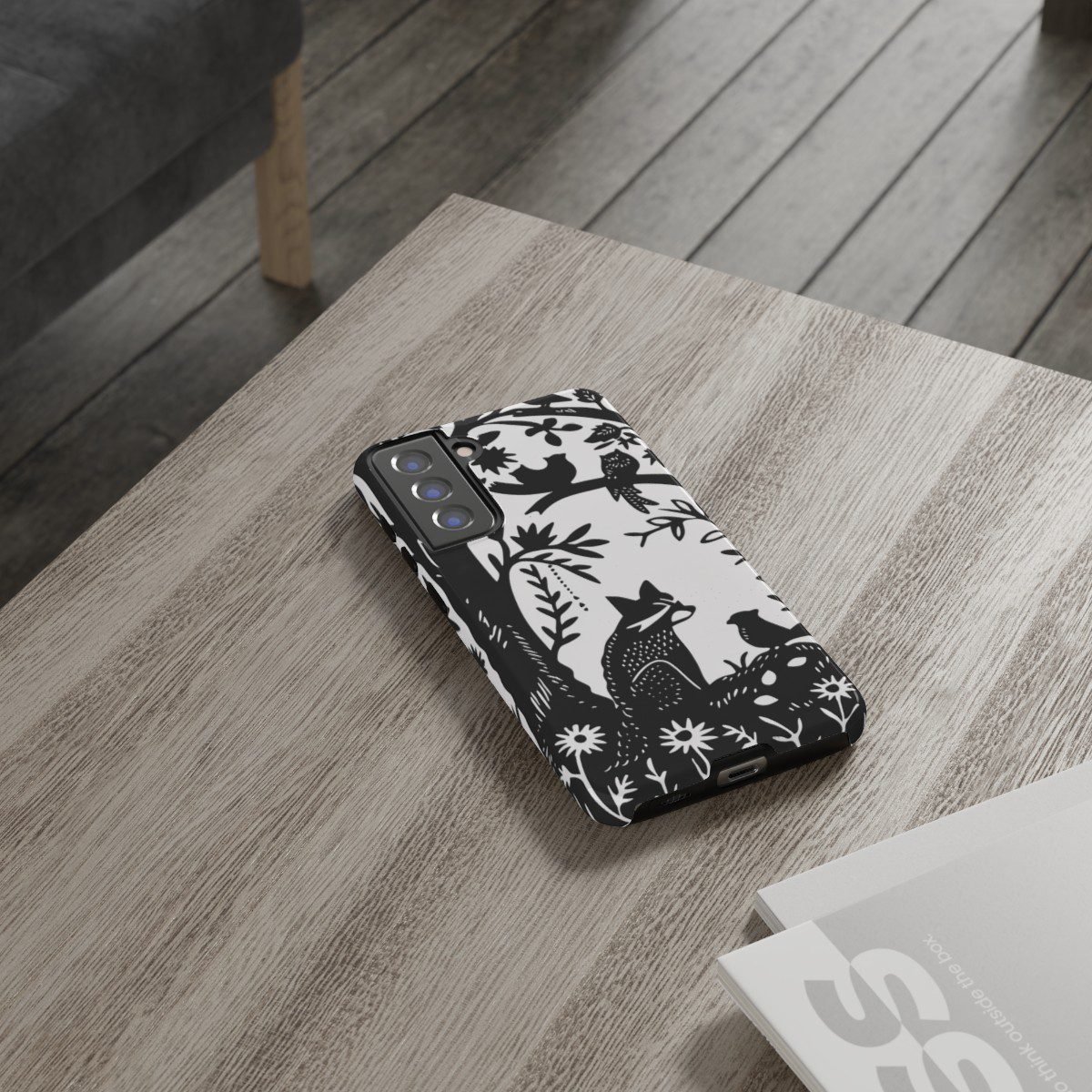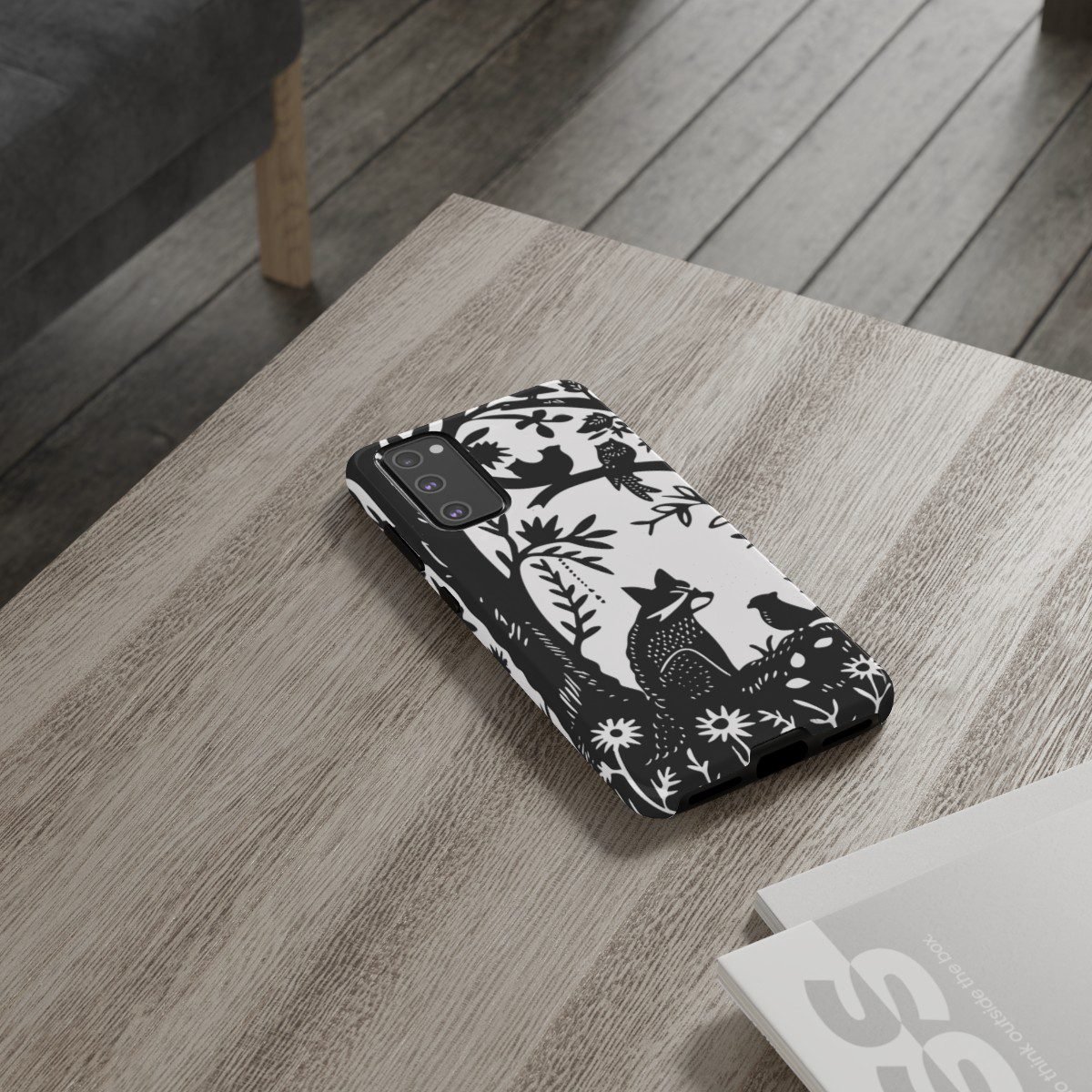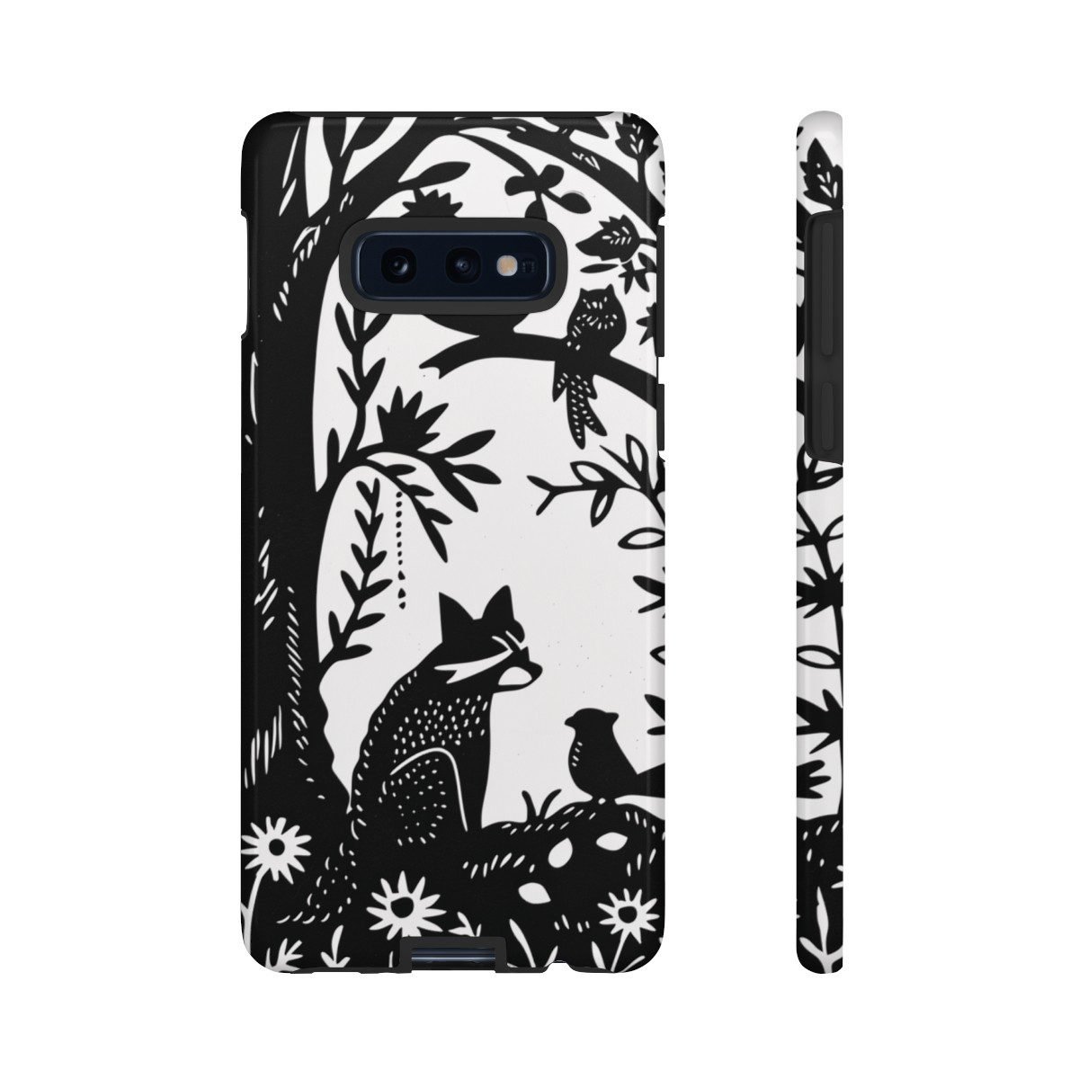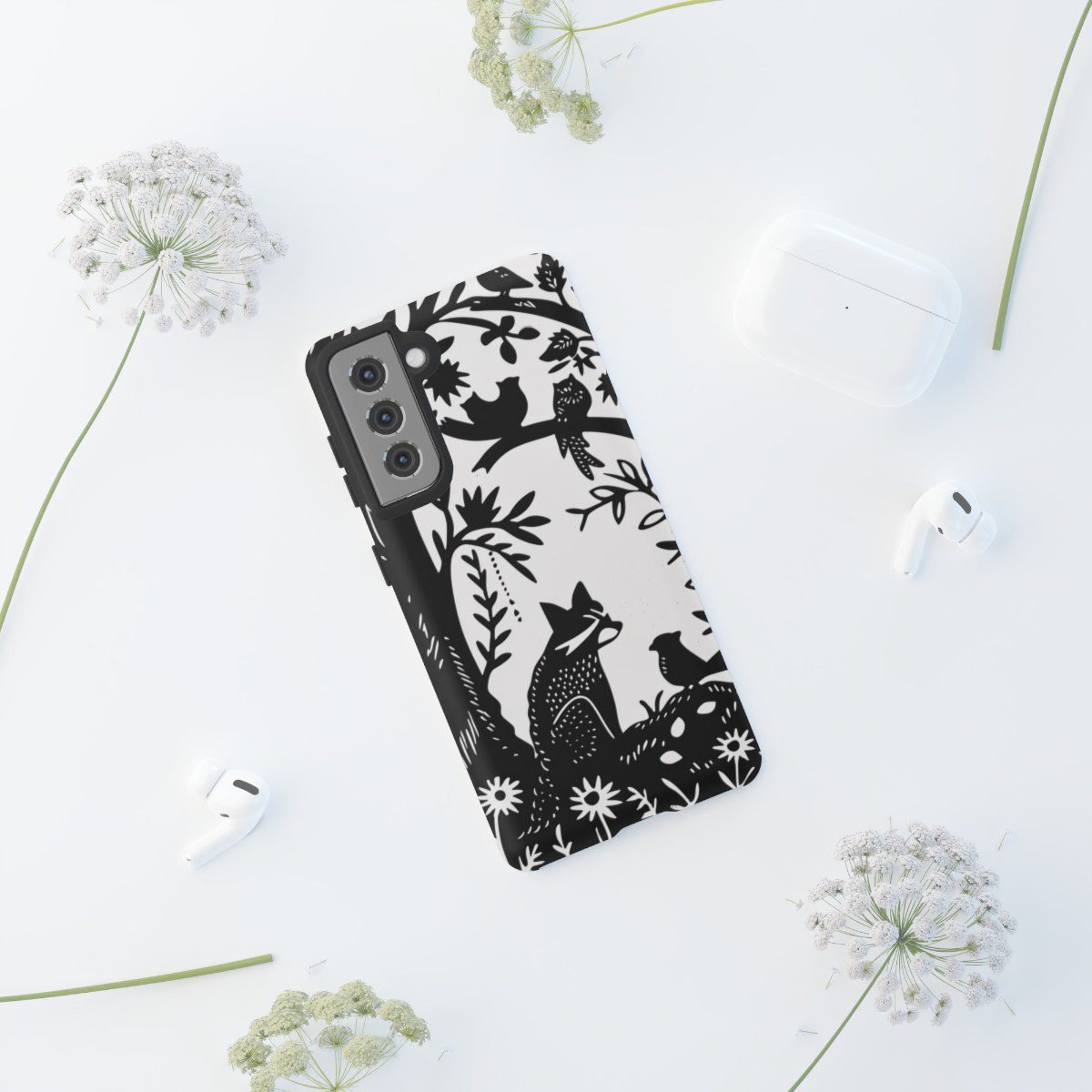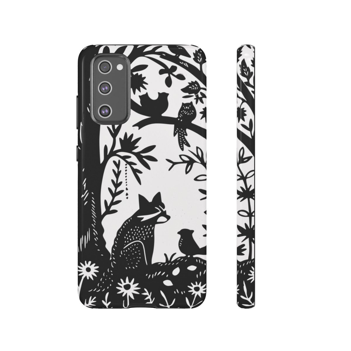 Retro Linocut Raccoon Birds Tree Flowers – Samsung Galaxy S10 S20 S21 – Cell Phone – Tough Cases.