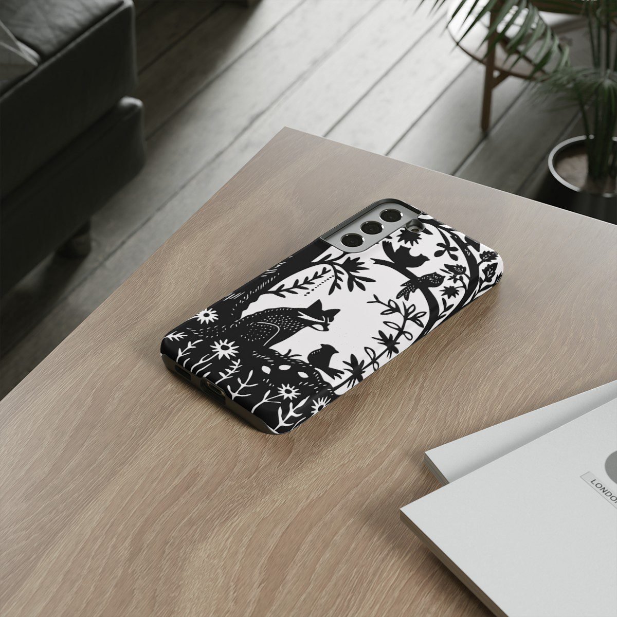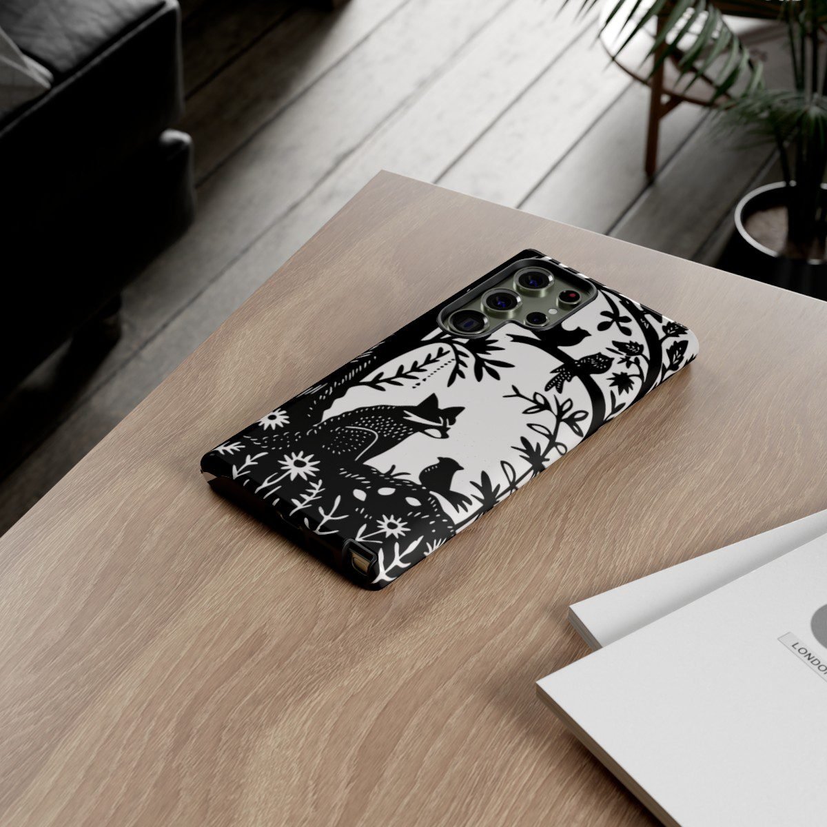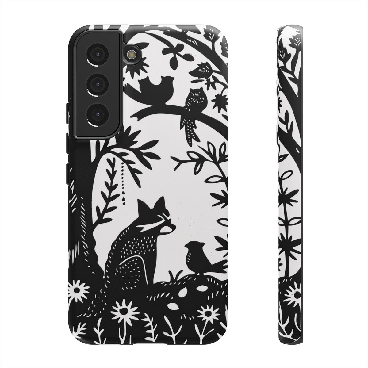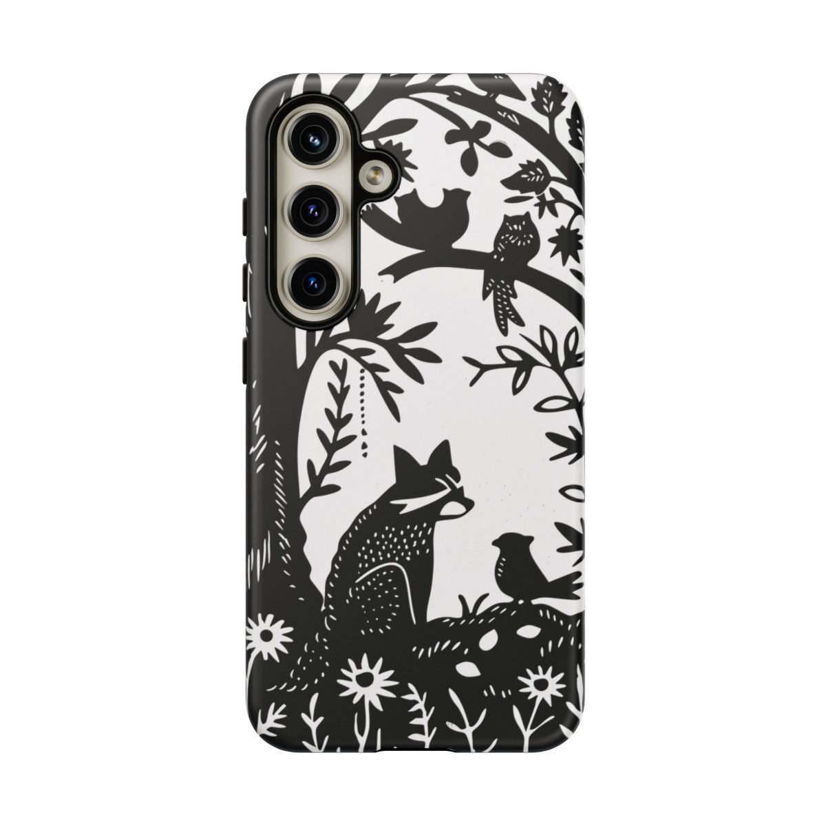 Retro Linocut Raccoon Birds Tree Flowers – Samsung Galaxy S22 S23 S24 – Cell Phone – Tough Cases.