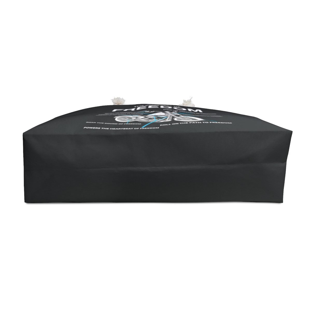 DESIGN: The text “The Anatomy of Freedom” in white. Various sentences pointing to various parts of a motorcycle and how it corresponds with freedom. The bag color is a black with white handles. Colors are black, white, and blue.
