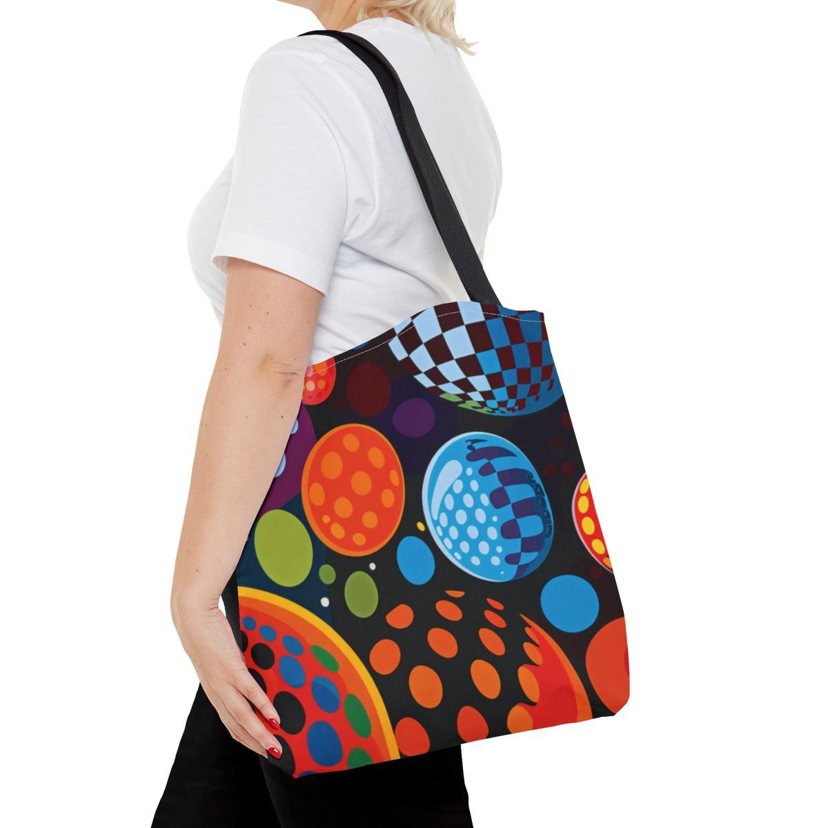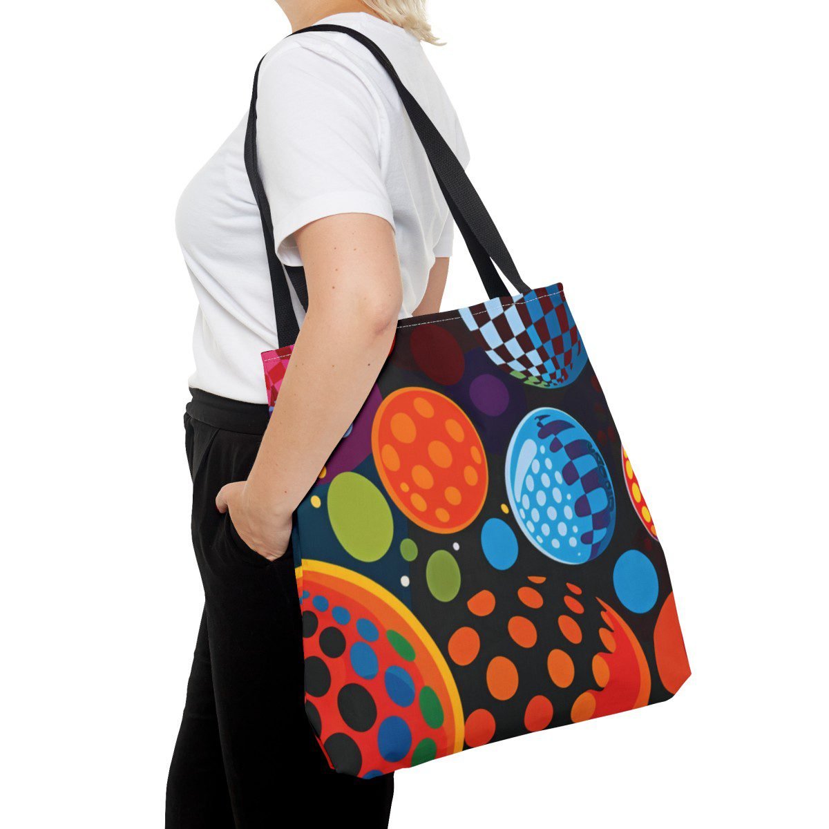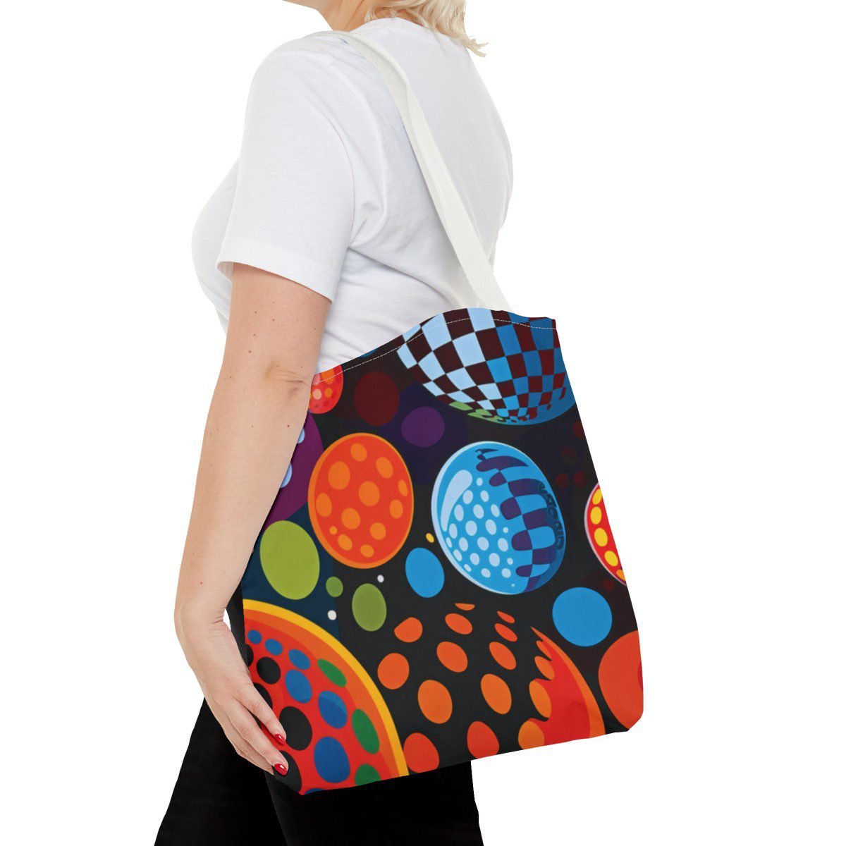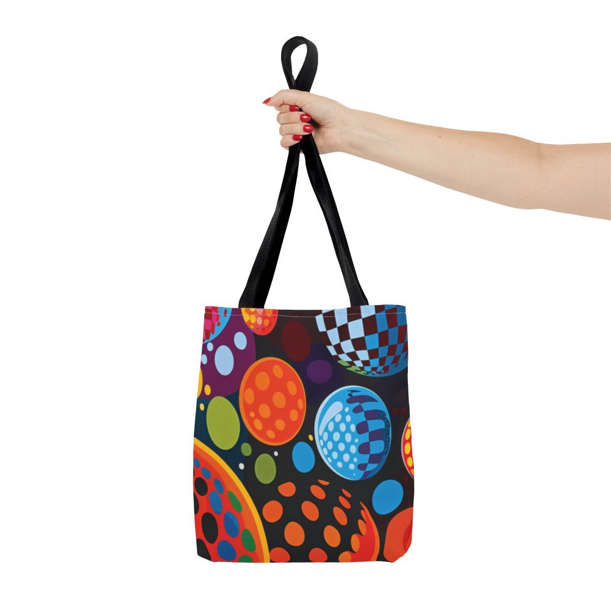 Tote Bag – Popart Abstract Disco Balls – Retro – Black Background – Choice of Handle Color.