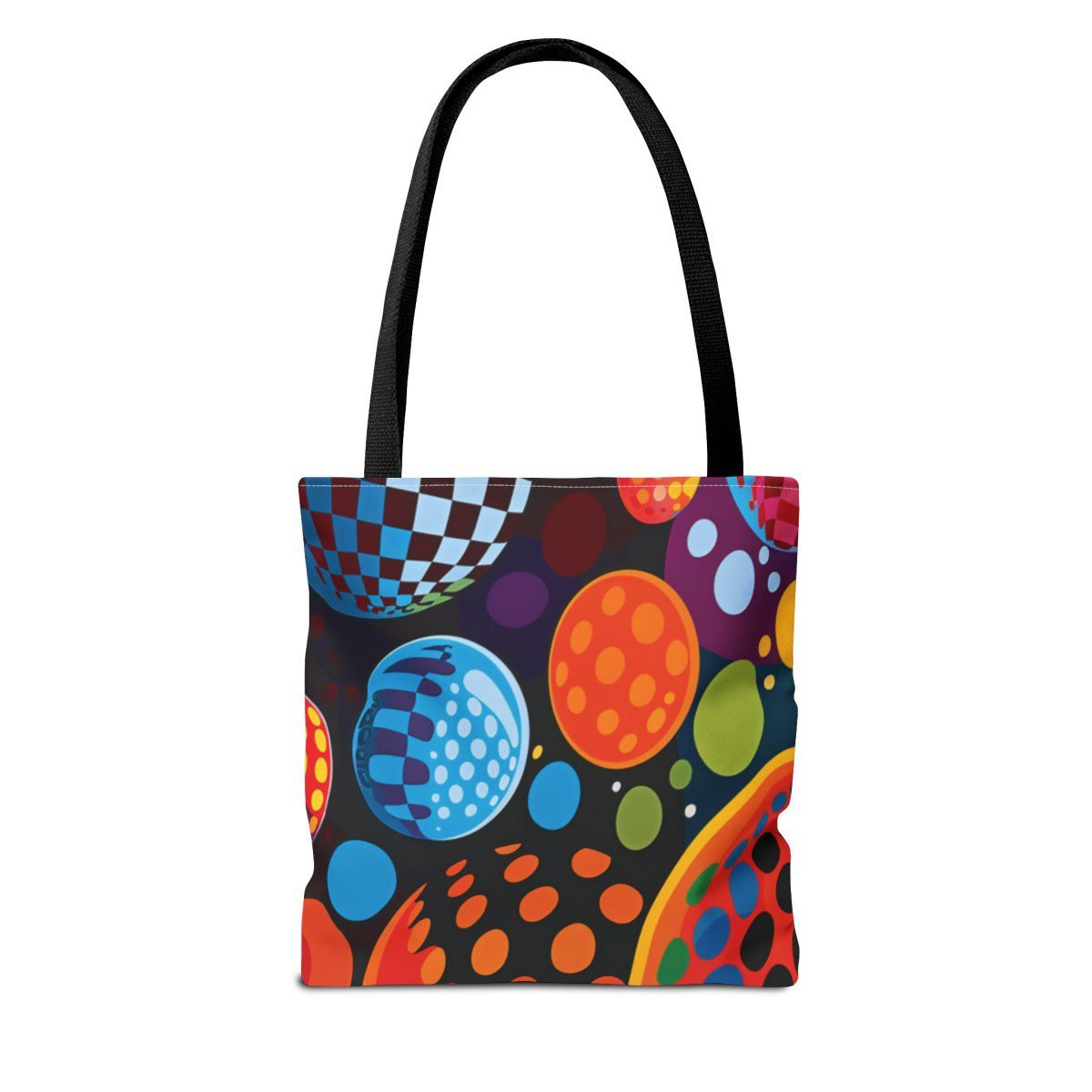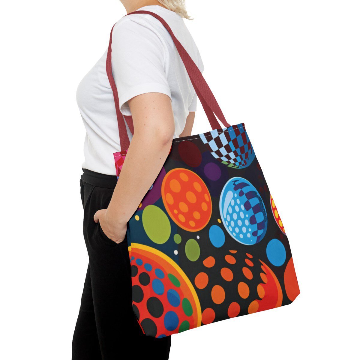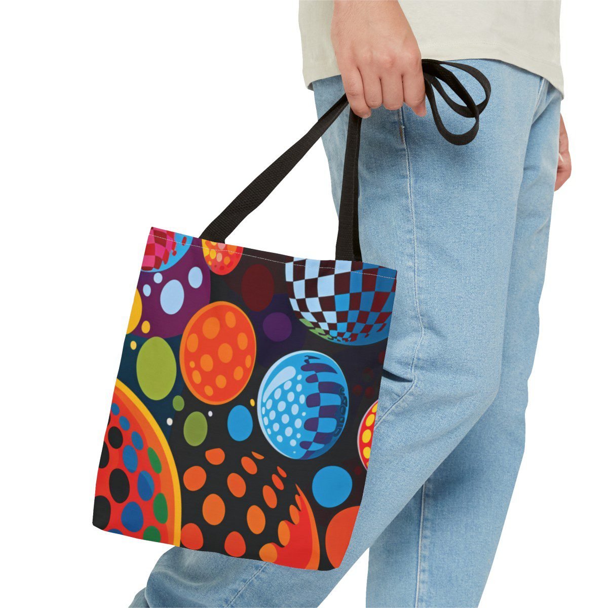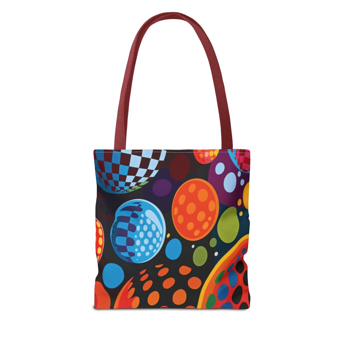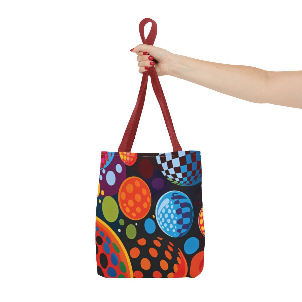 Tote Bag – Popart Abstract Disco Balls – Retro – Black Background – Choice of Handle Color.