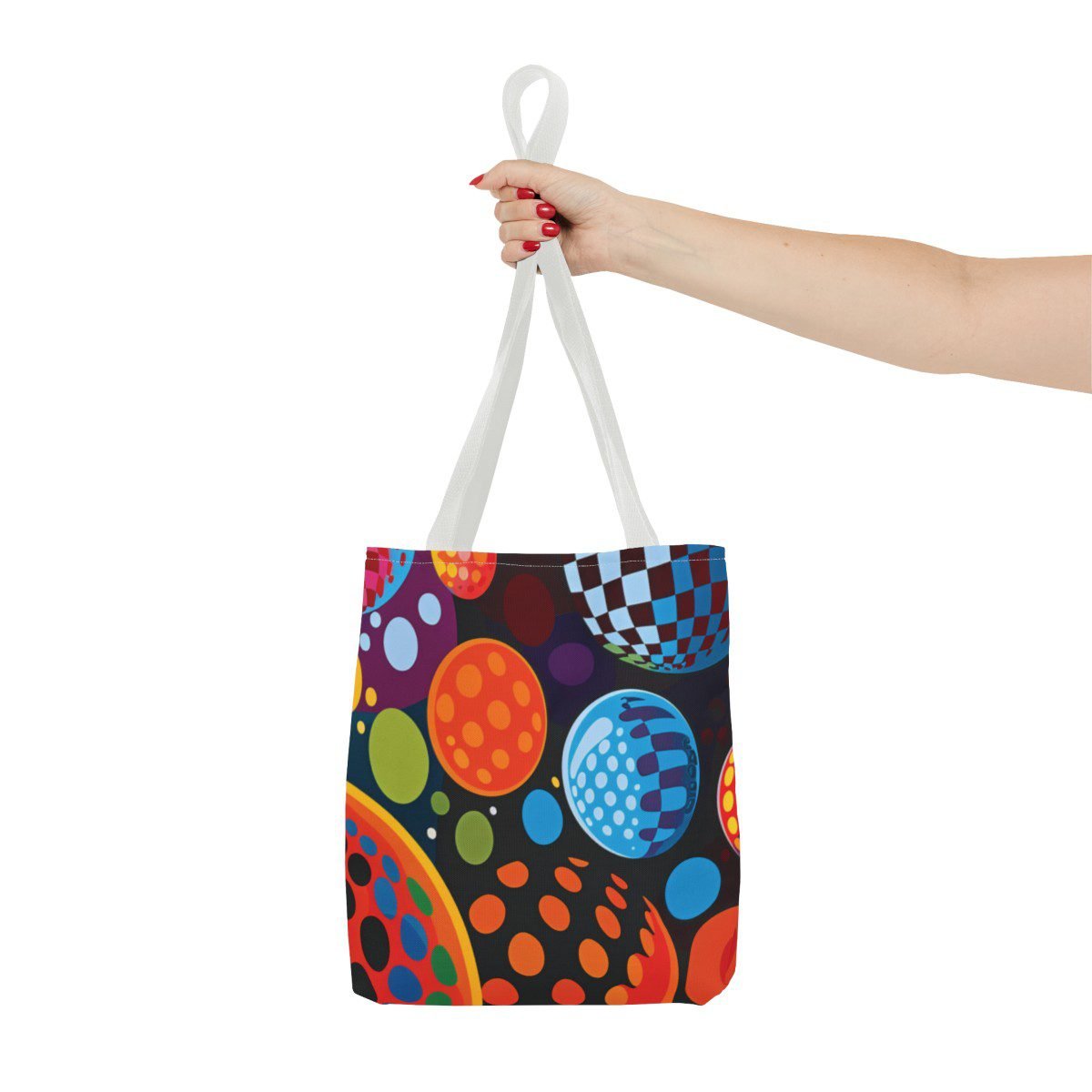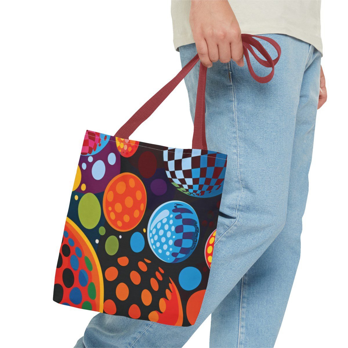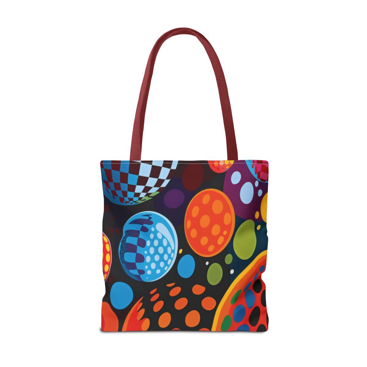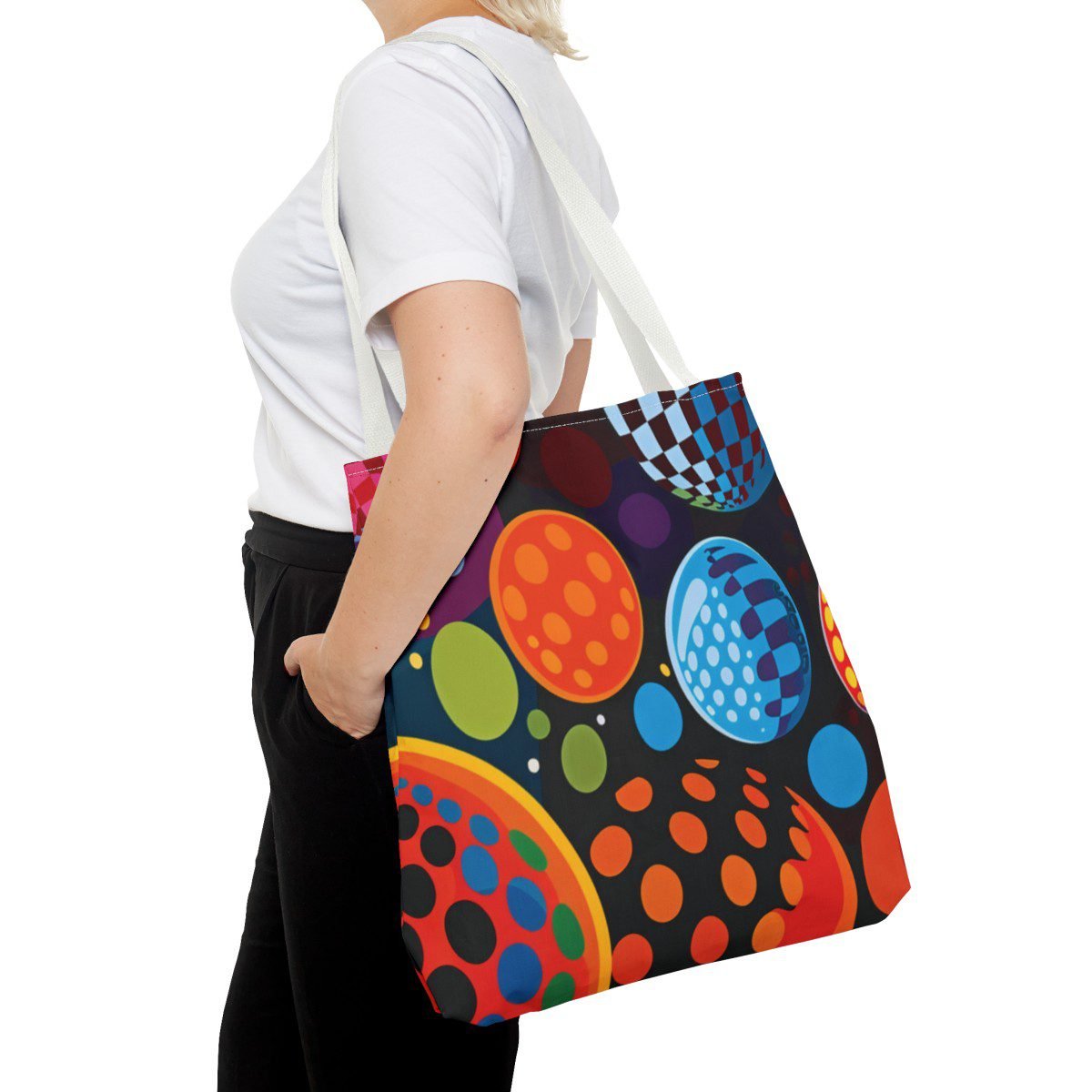 Tote Bag – Popart Abstract Disco Balls – Retro – Black Background – Choice of Handle Color.
