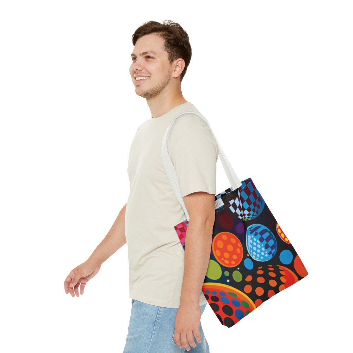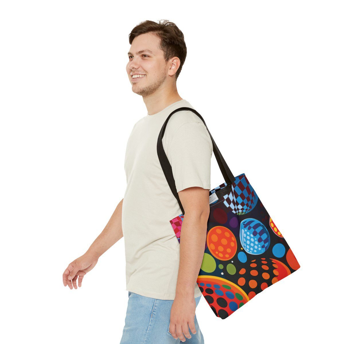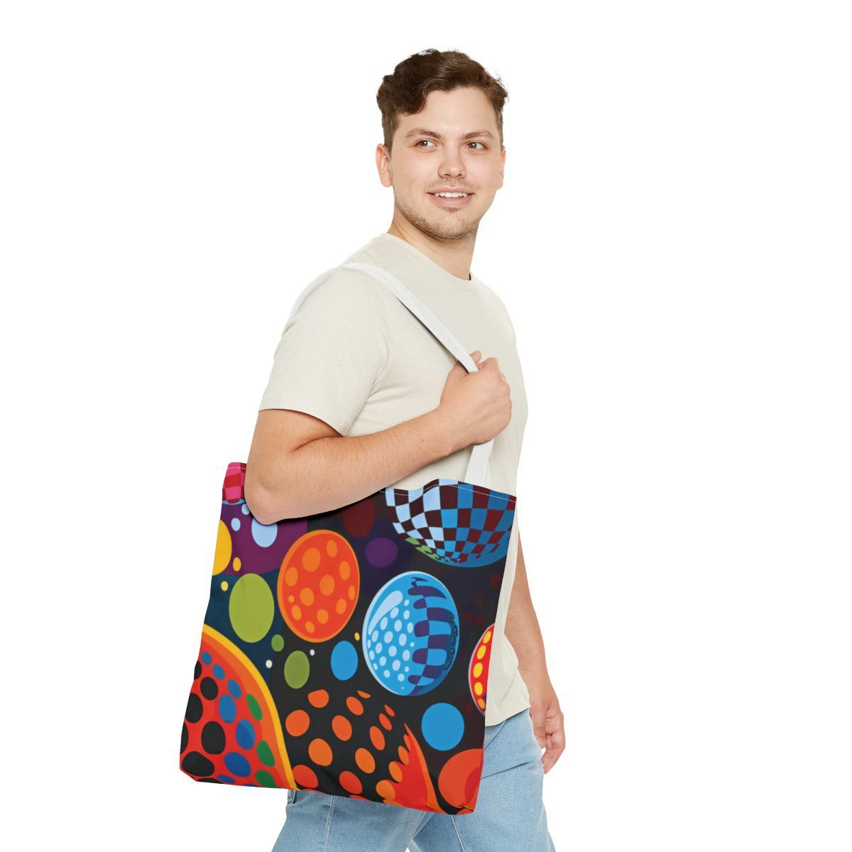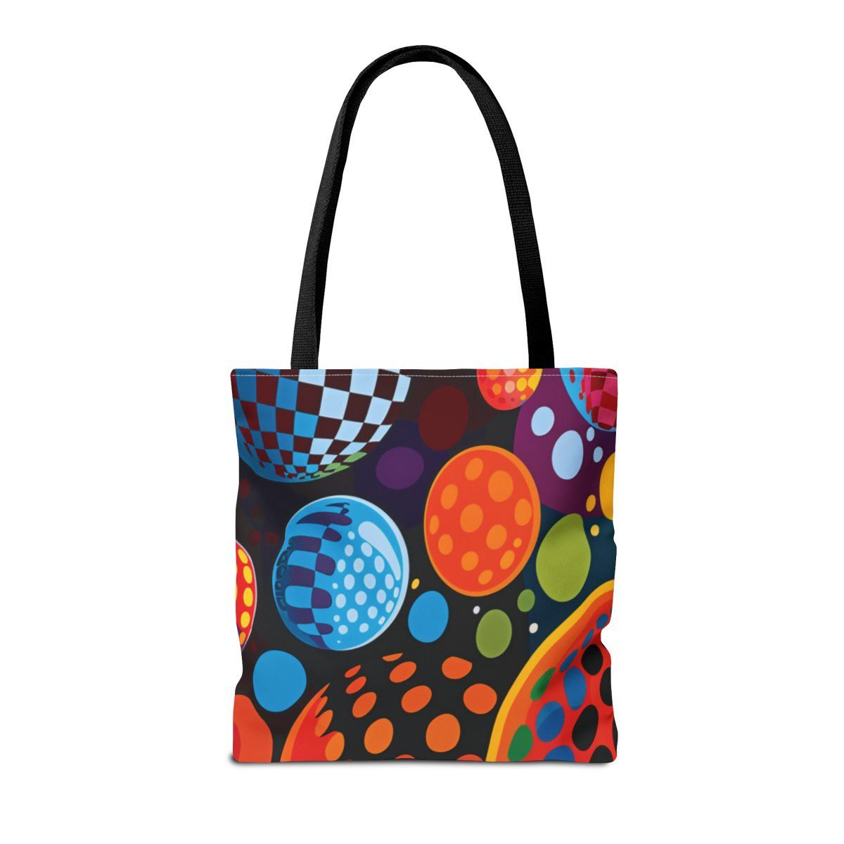 Tote Bag – Popart Abstract Disco Balls – Retro – Black Background – Choice of Handle Color.