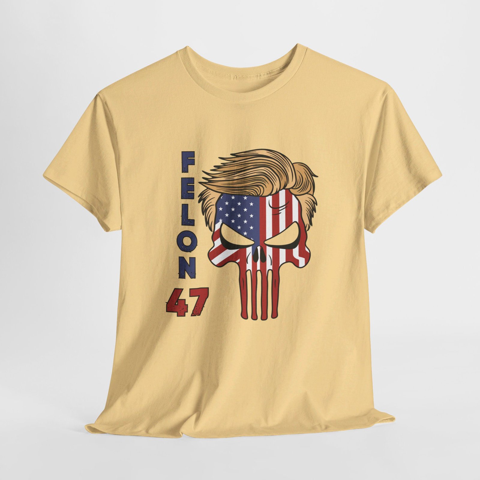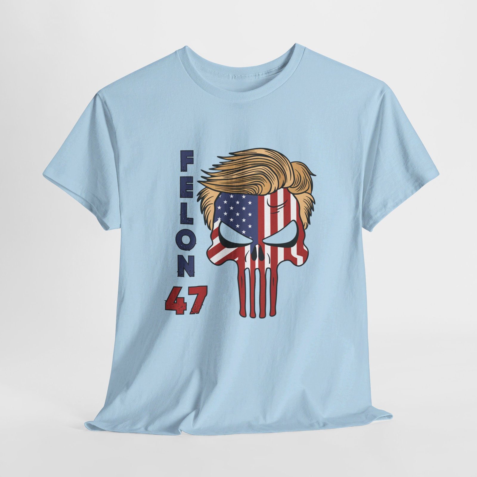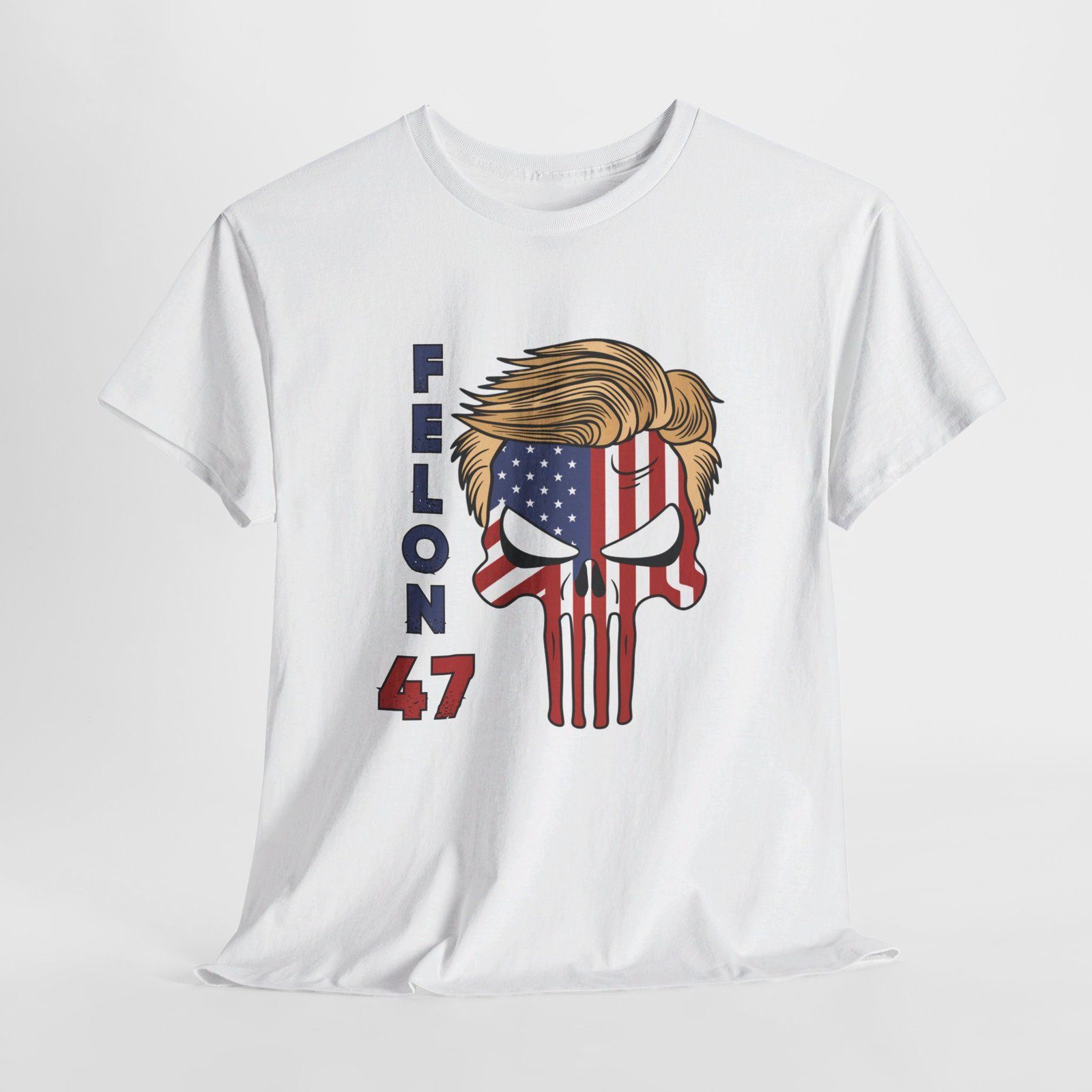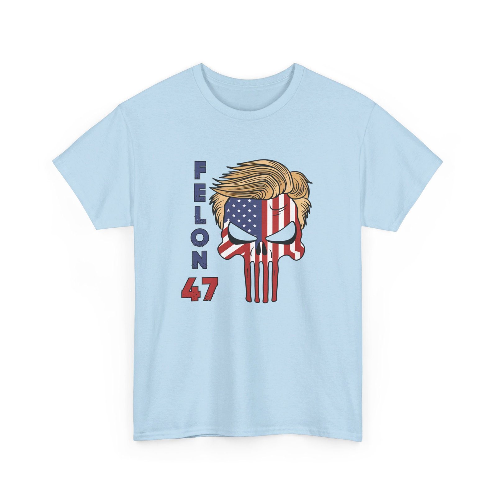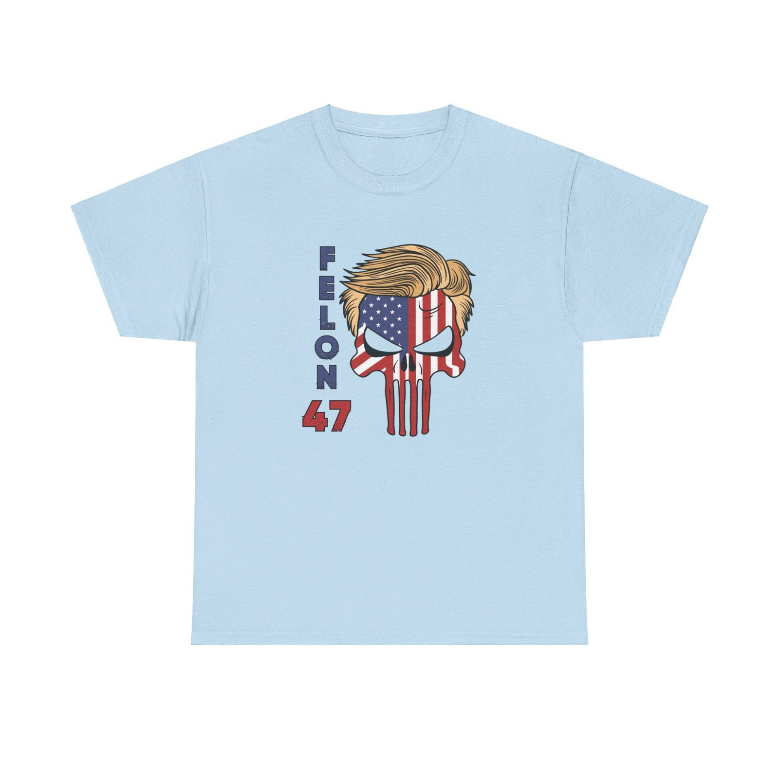 DESIGN: The text “Felon 47” in red and blue. An illustration of a skull embedded with the American Flag and with President Donald Trump’s iconic blonde hairstyle. Colors are white, black, gold, red, blue, etc. Your choice of t-shirt colors.
