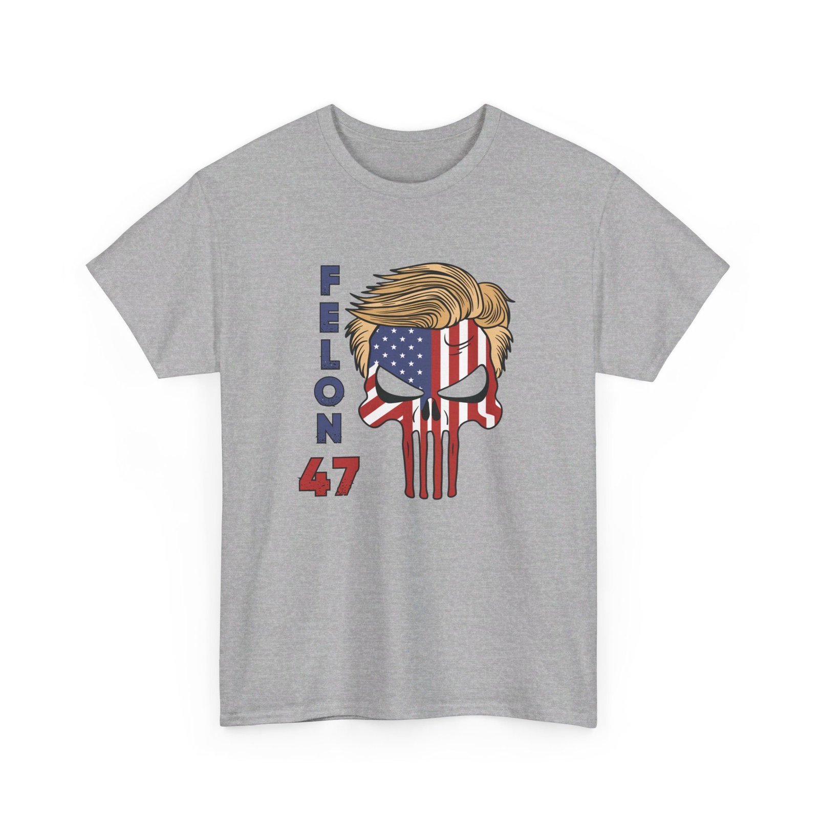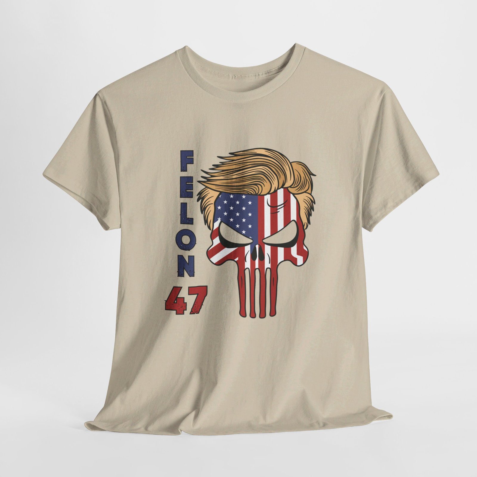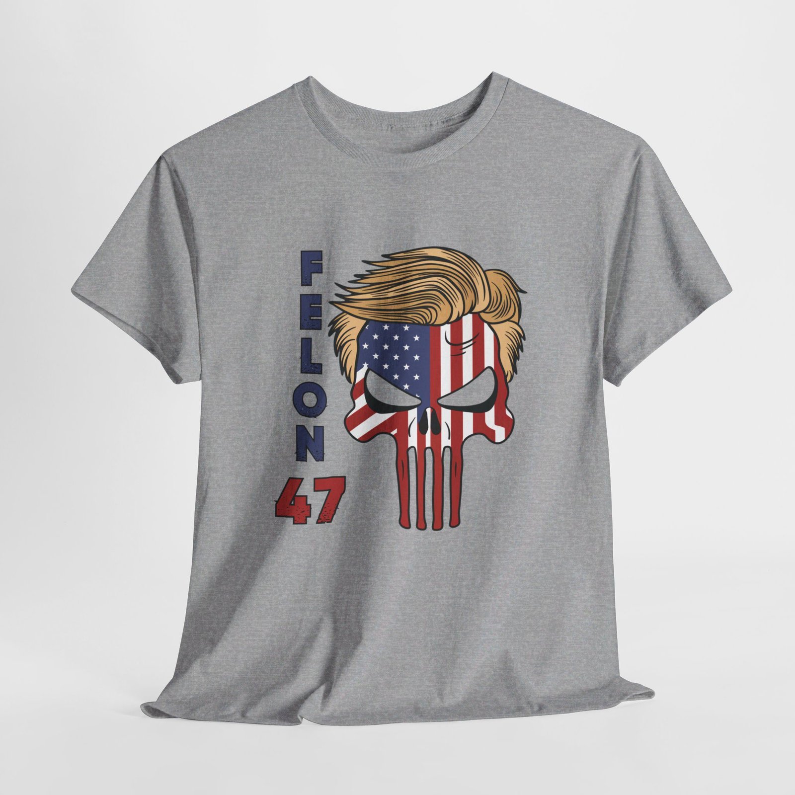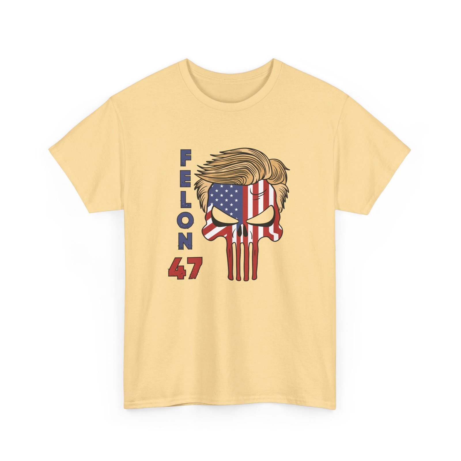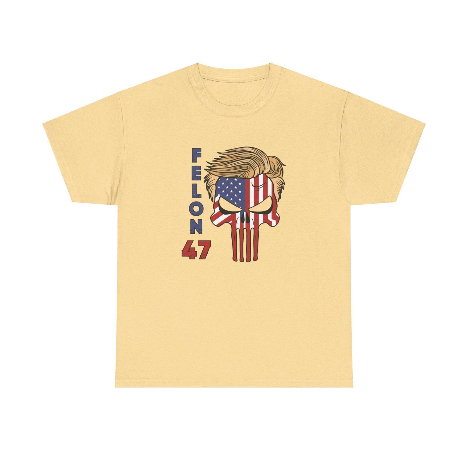 DESIGN: The text “Felon 47” in red and blue. An illustration of a skull embedded with the American Flag and with President Donald Trump’s iconic blonde hairstyle. Colors are white, black, gold, red, blue, etc. Your choice of t-shirt colors.