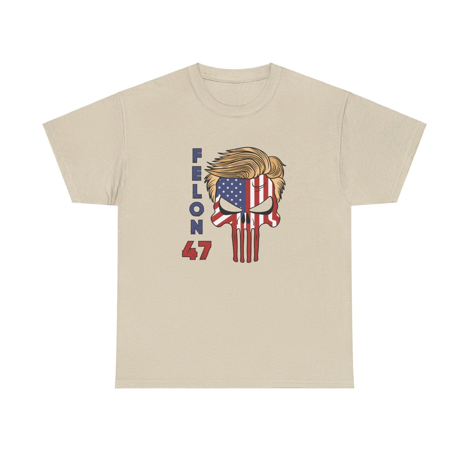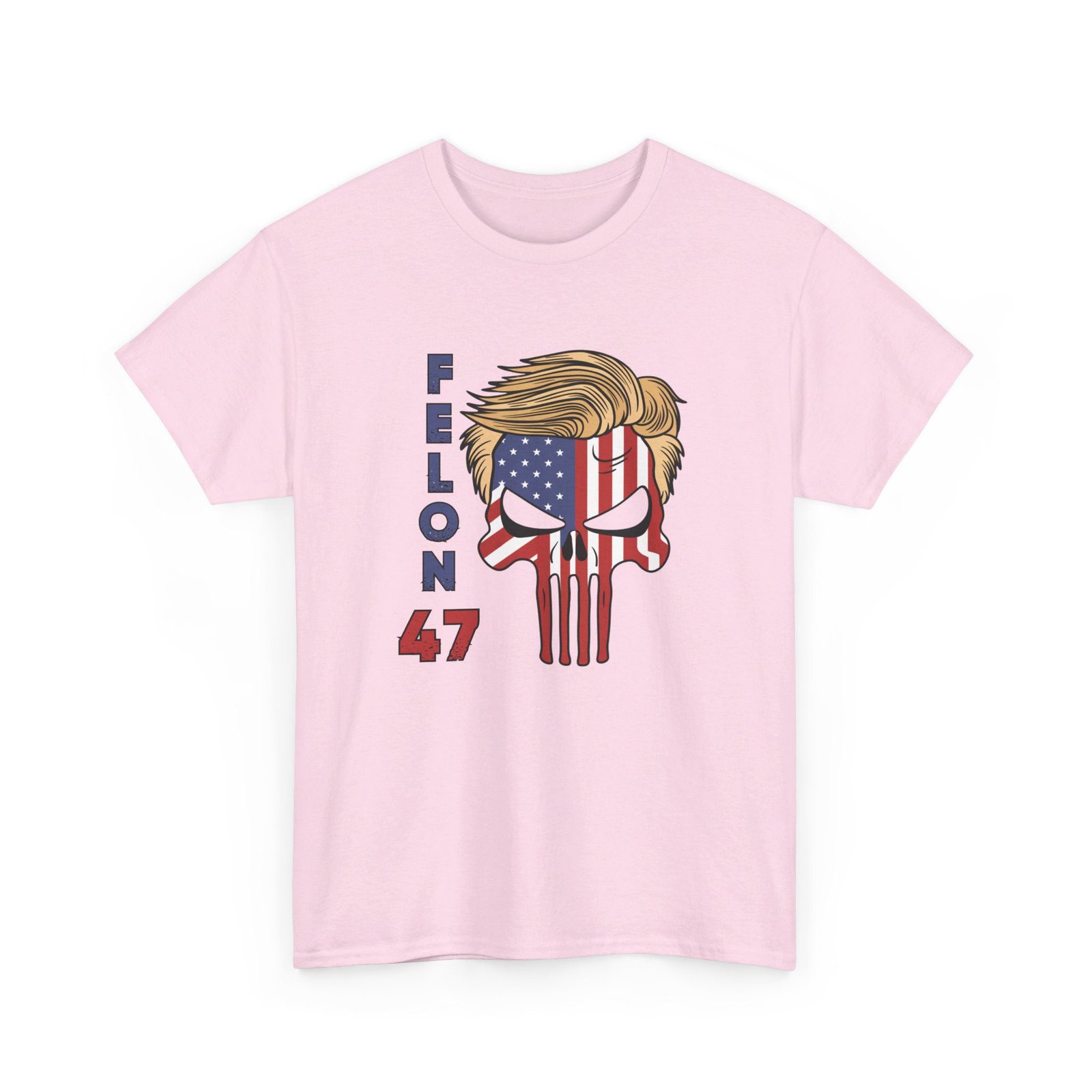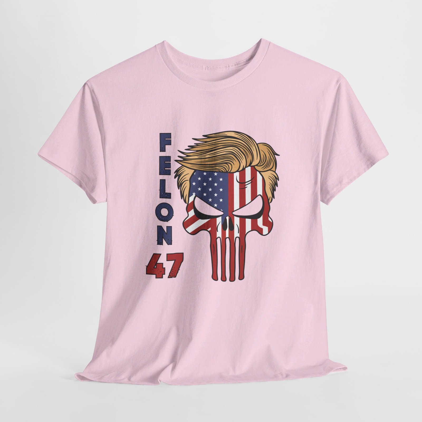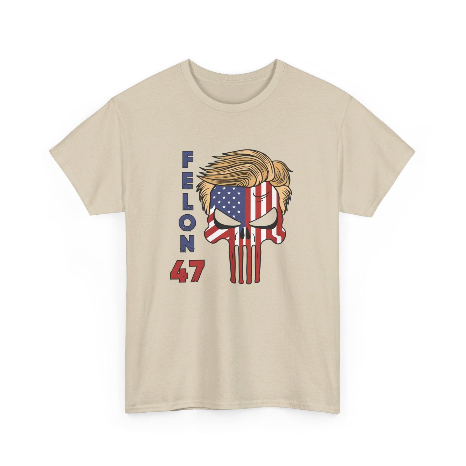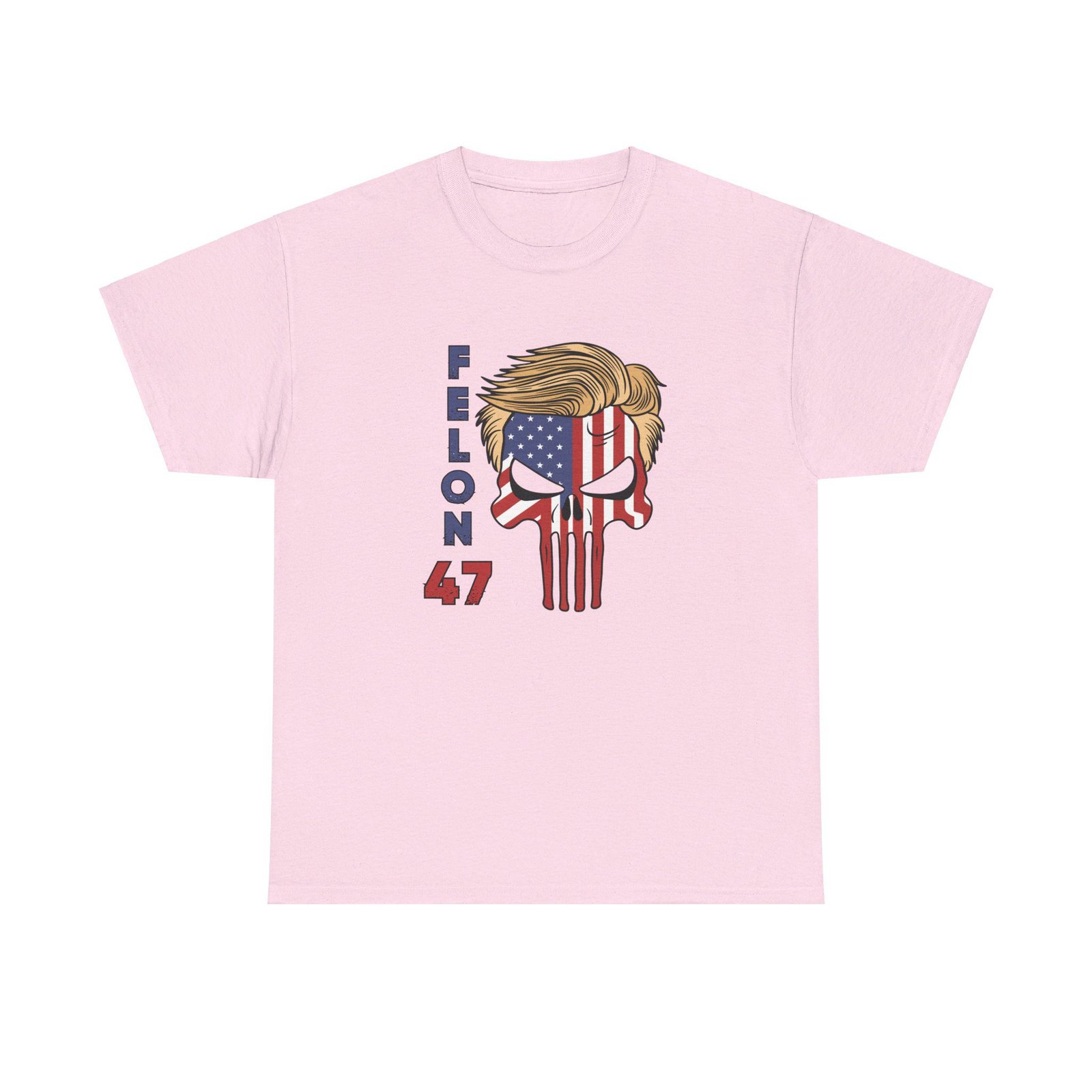 DESIGN: The text “Felon 47” in red and blue. An illustration of a skull embedded with the American Flag and with President Donald Trump’s iconic blonde hairstyle. Colors are white, black, gold, red, blue, etc. Your choice of t-shirt colors.