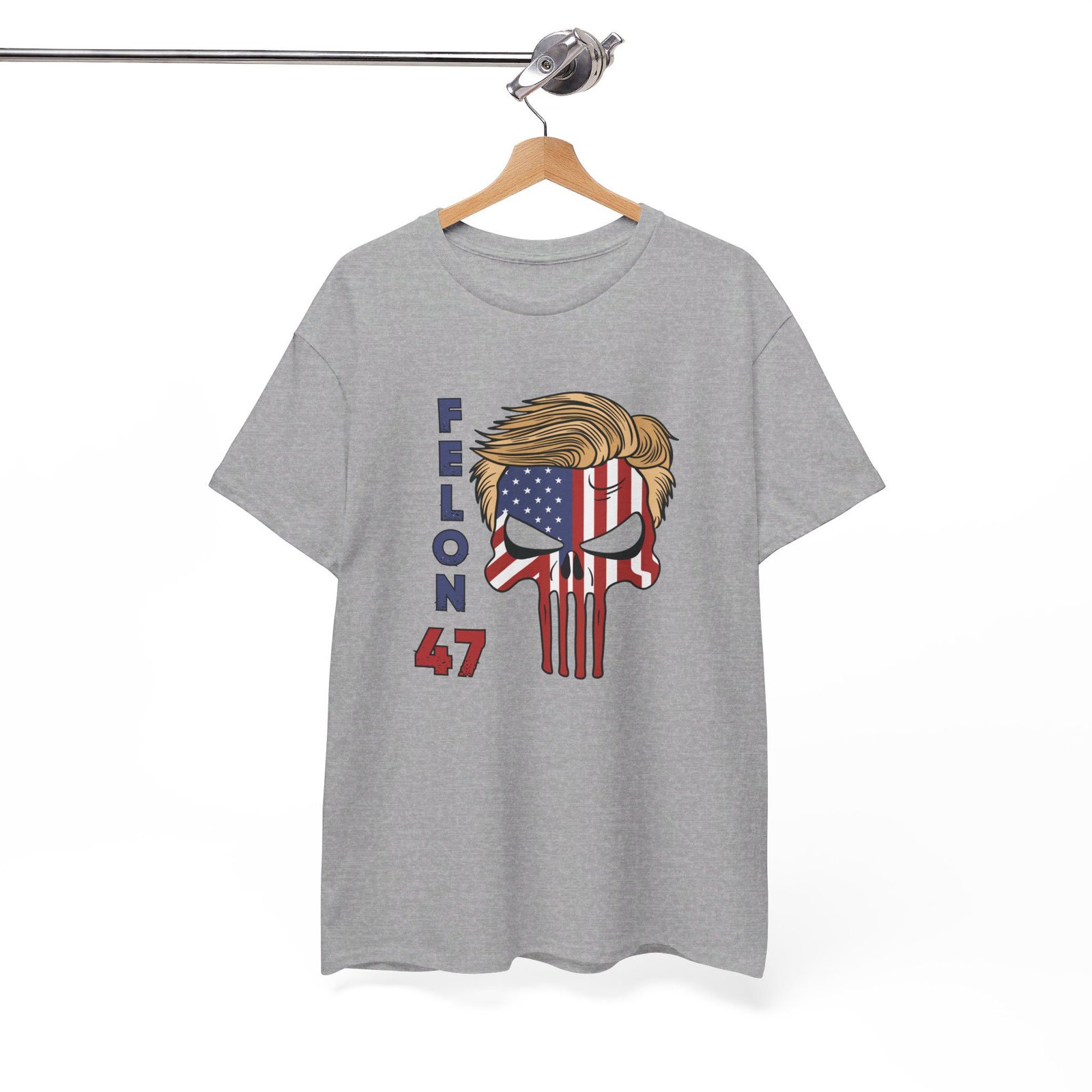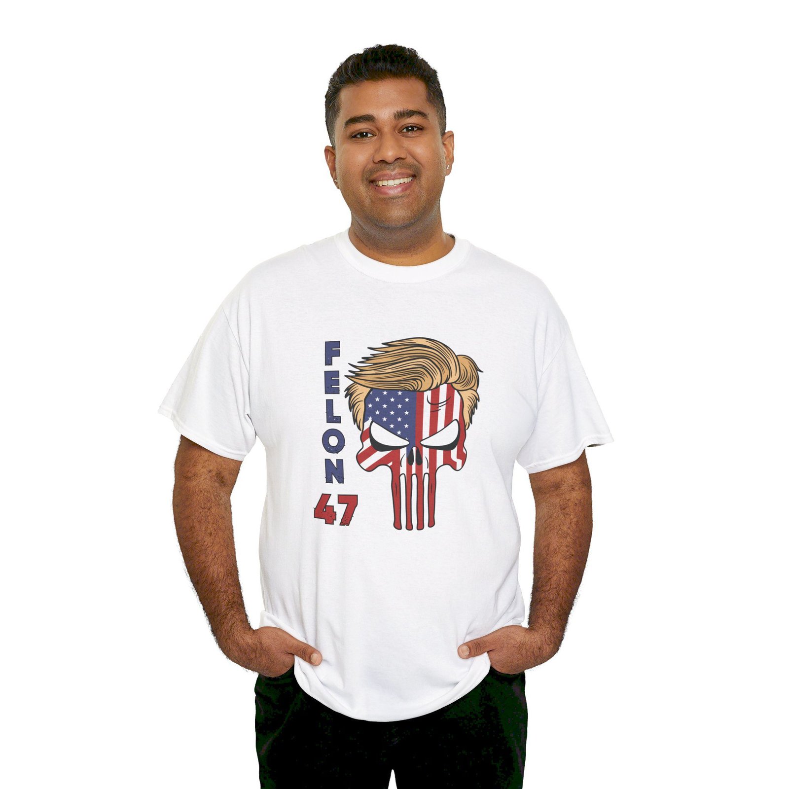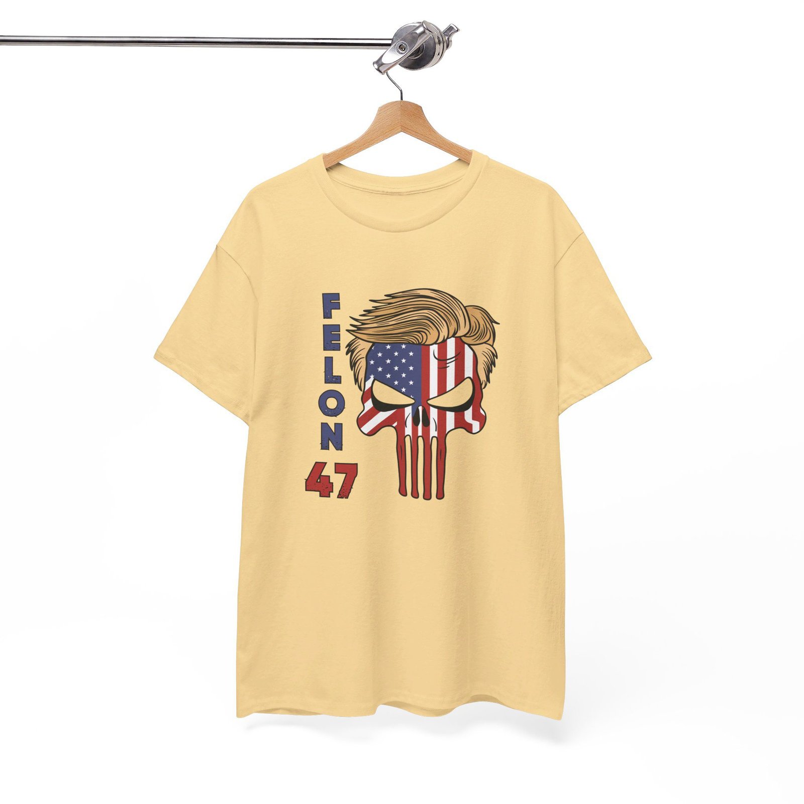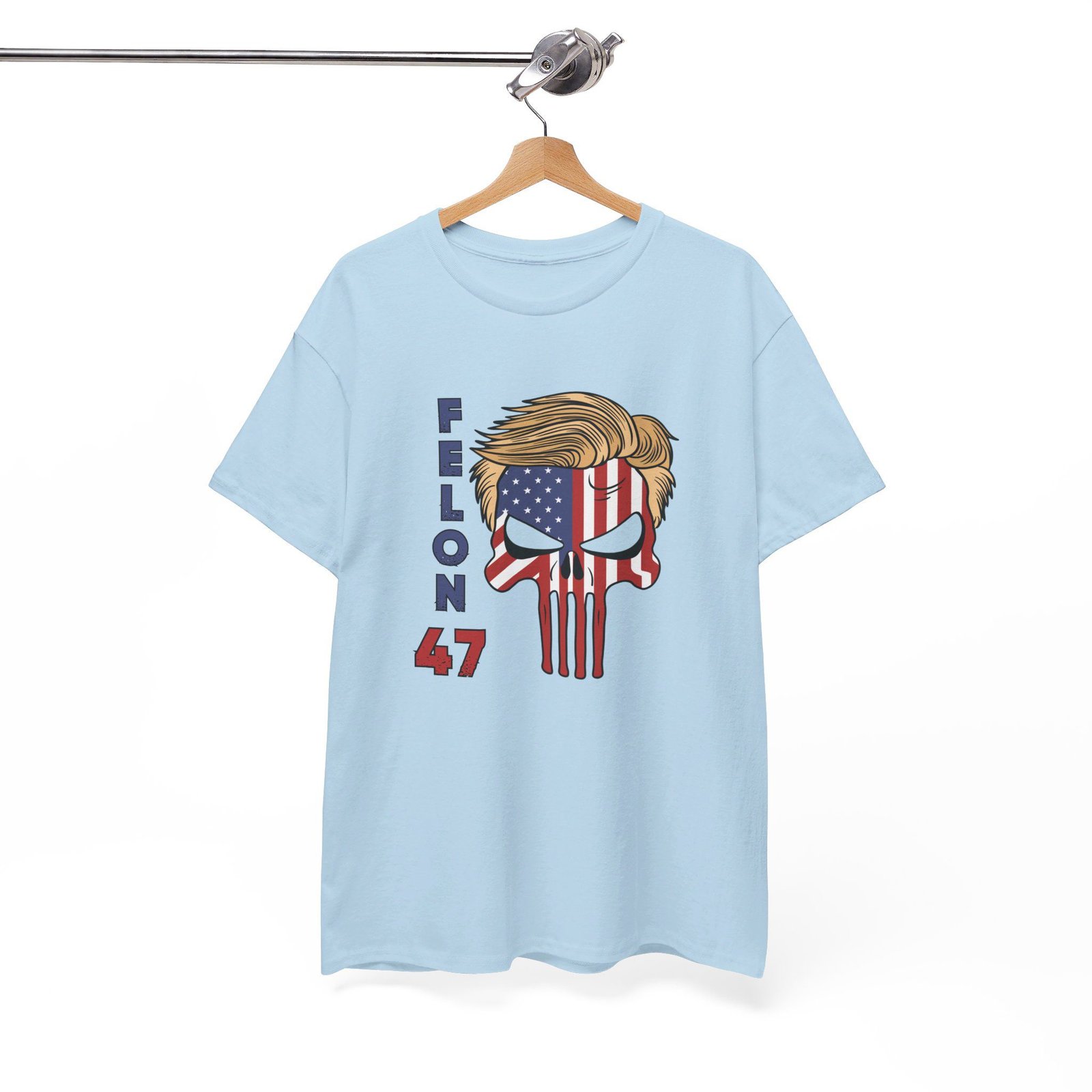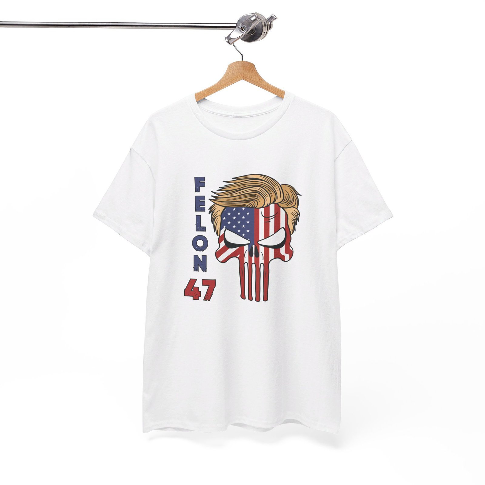 DESIGN: The text “Felon 47” in red and blue. An illustration of a skull embedded with the American Flag and with President Donald Trump’s iconic blonde hairstyle. Colors are white, black, gold, red, blue, etc. Your choice of t-shirt colors.