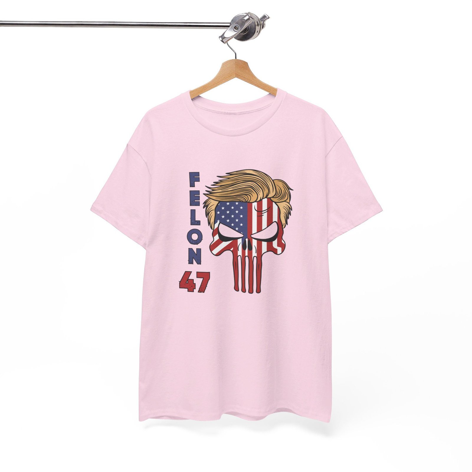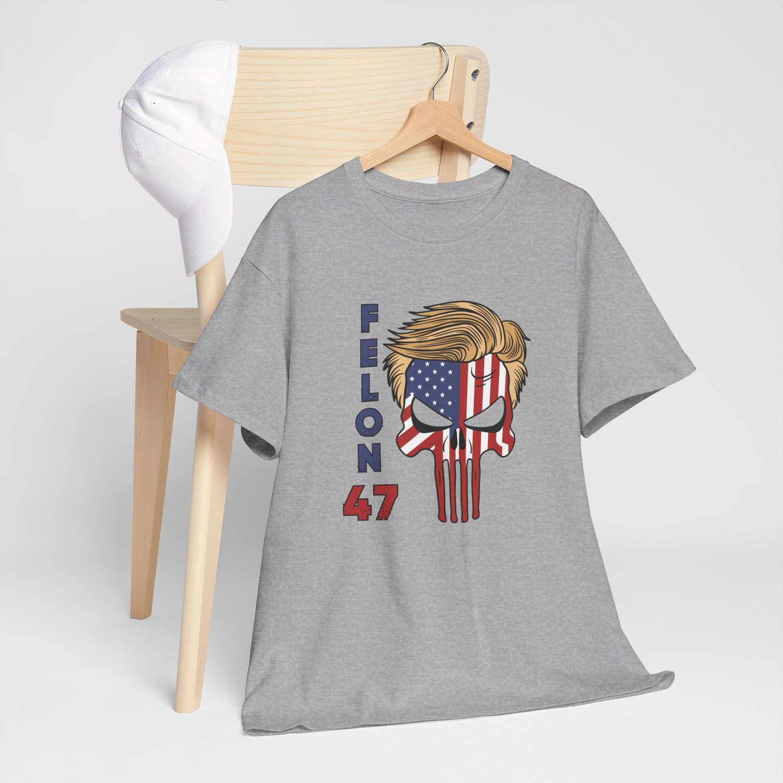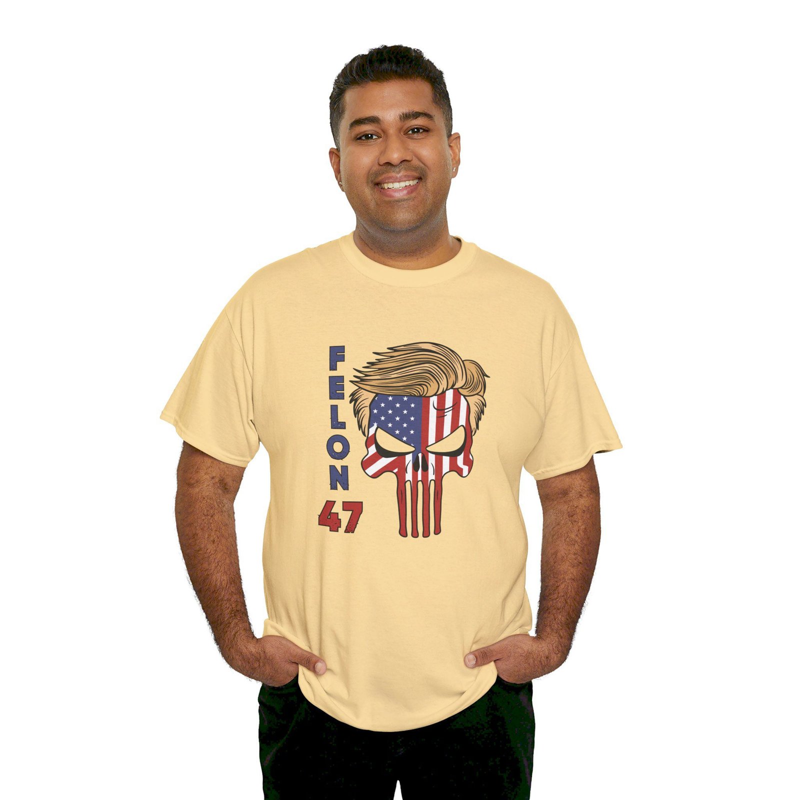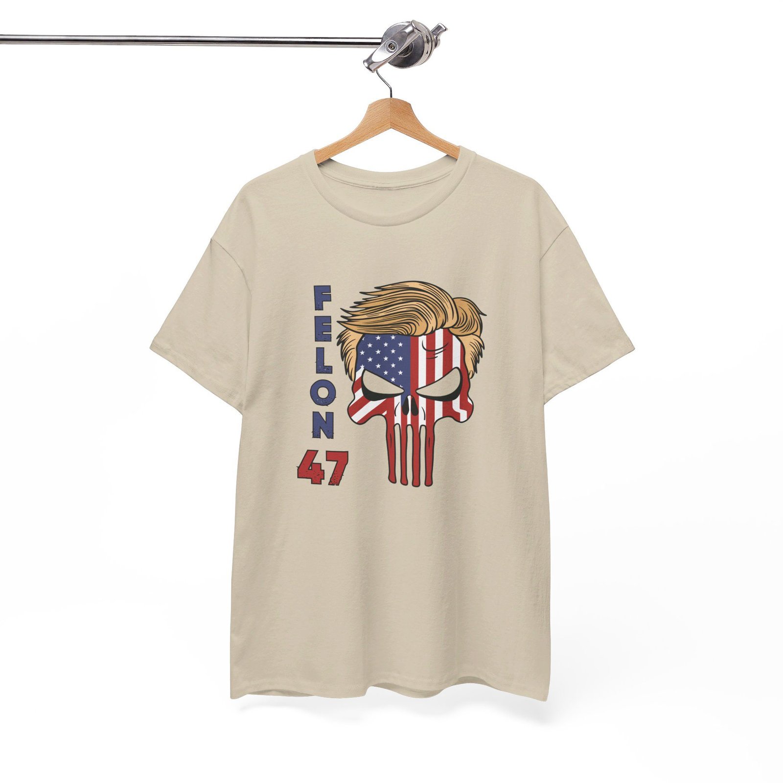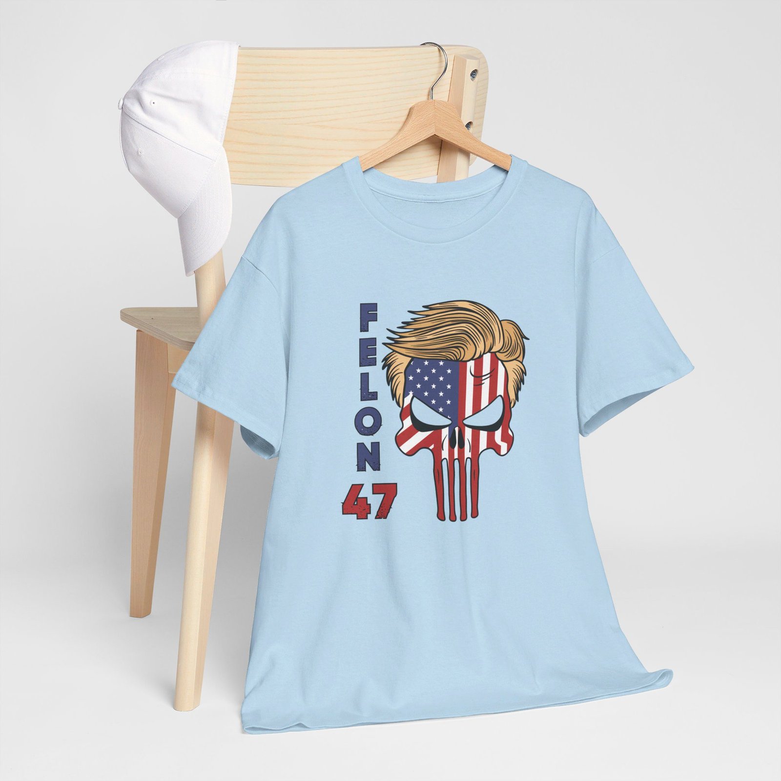 DESIGN: The text “Felon 47” in red and blue. An illustration of a skull embedded with the American Flag and with President Donald Trump’s iconic blonde hairstyle. Colors are white, black, gold, red, blue, etc. Your choice of t-shirt colors.