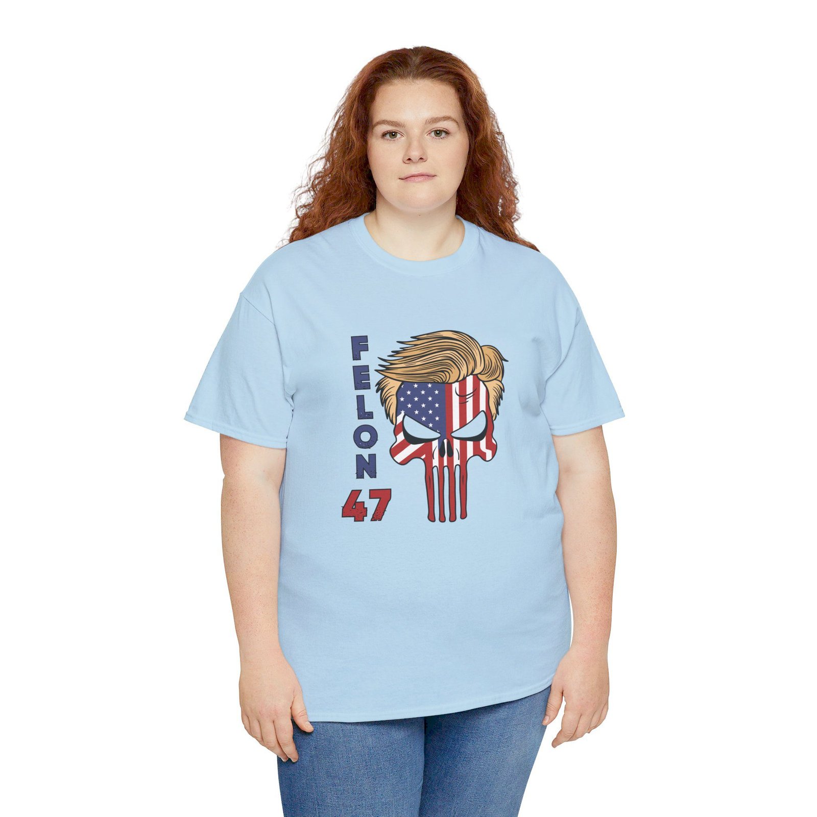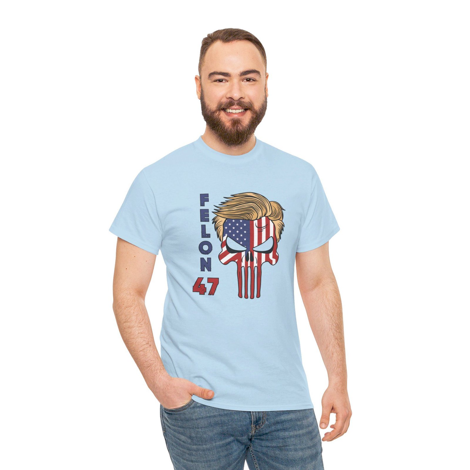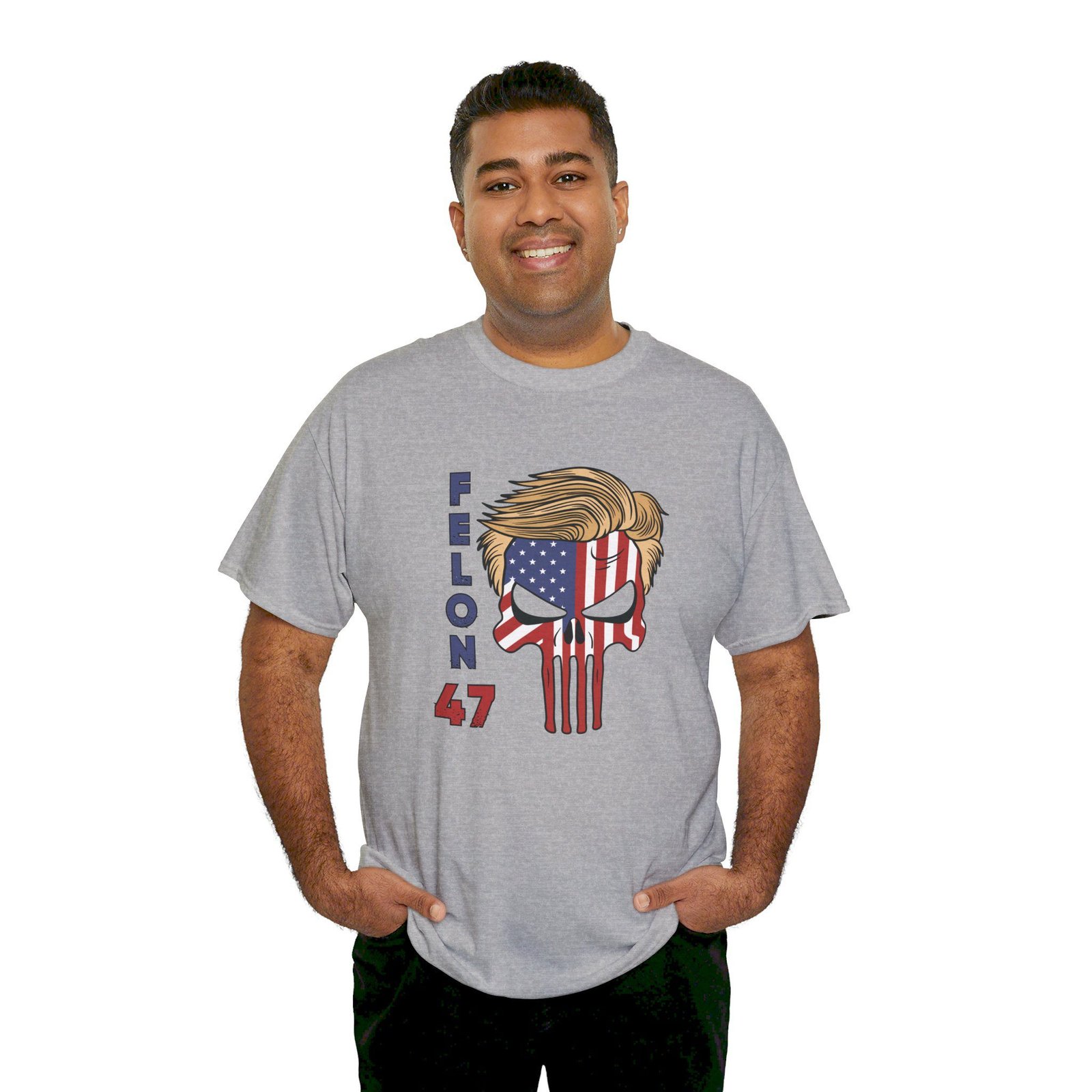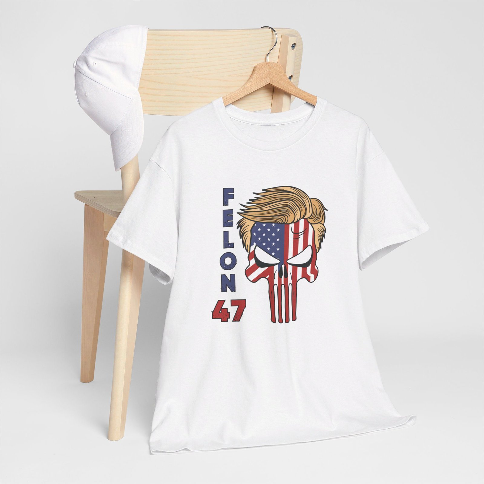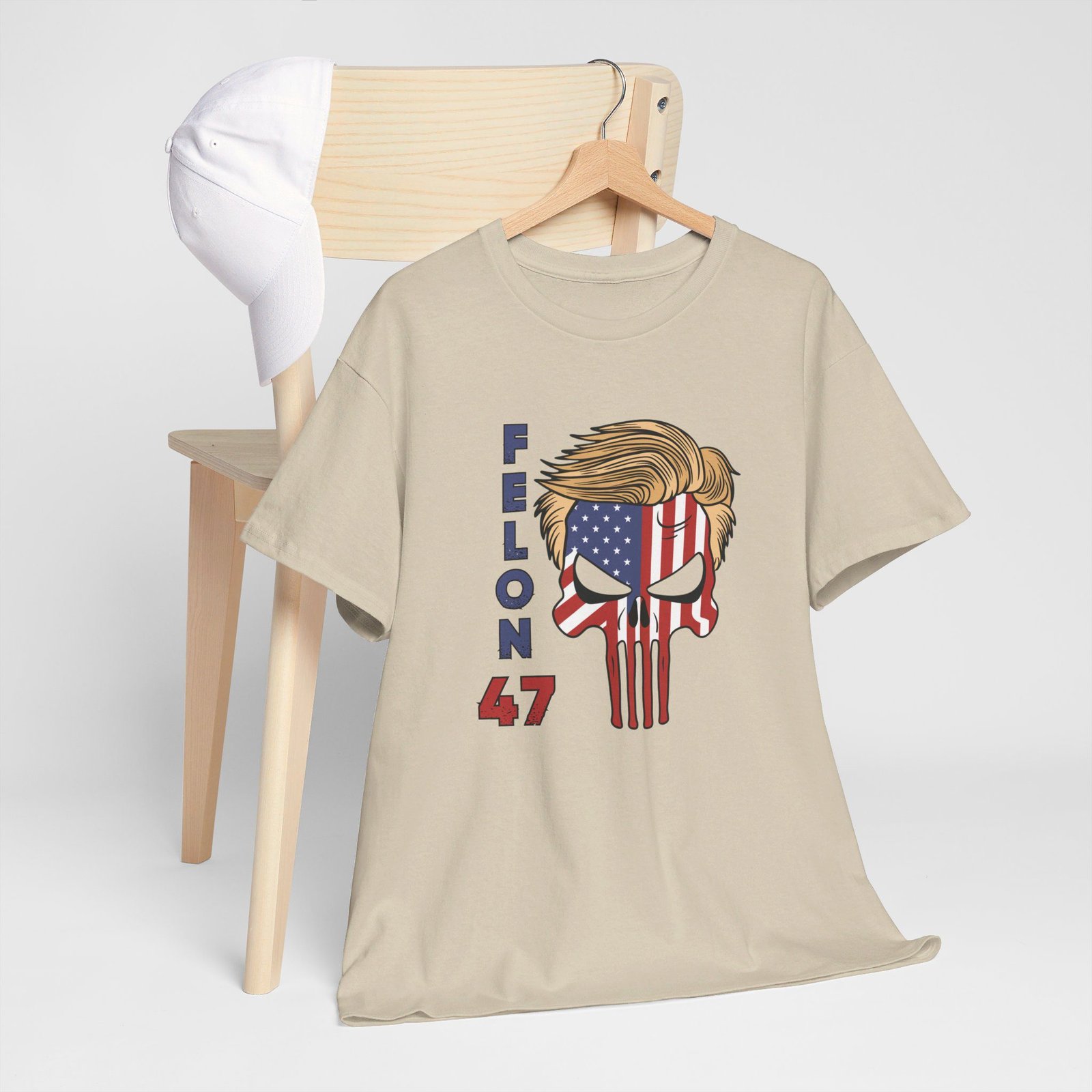 DESIGN: The text “Felon 47” in red and blue. An illustration of a skull embedded with the American Flag and with President Donald Trump’s iconic blonde hairstyle. Colors are white, black, gold, red, blue, etc. Your choice of t-shirt colors.