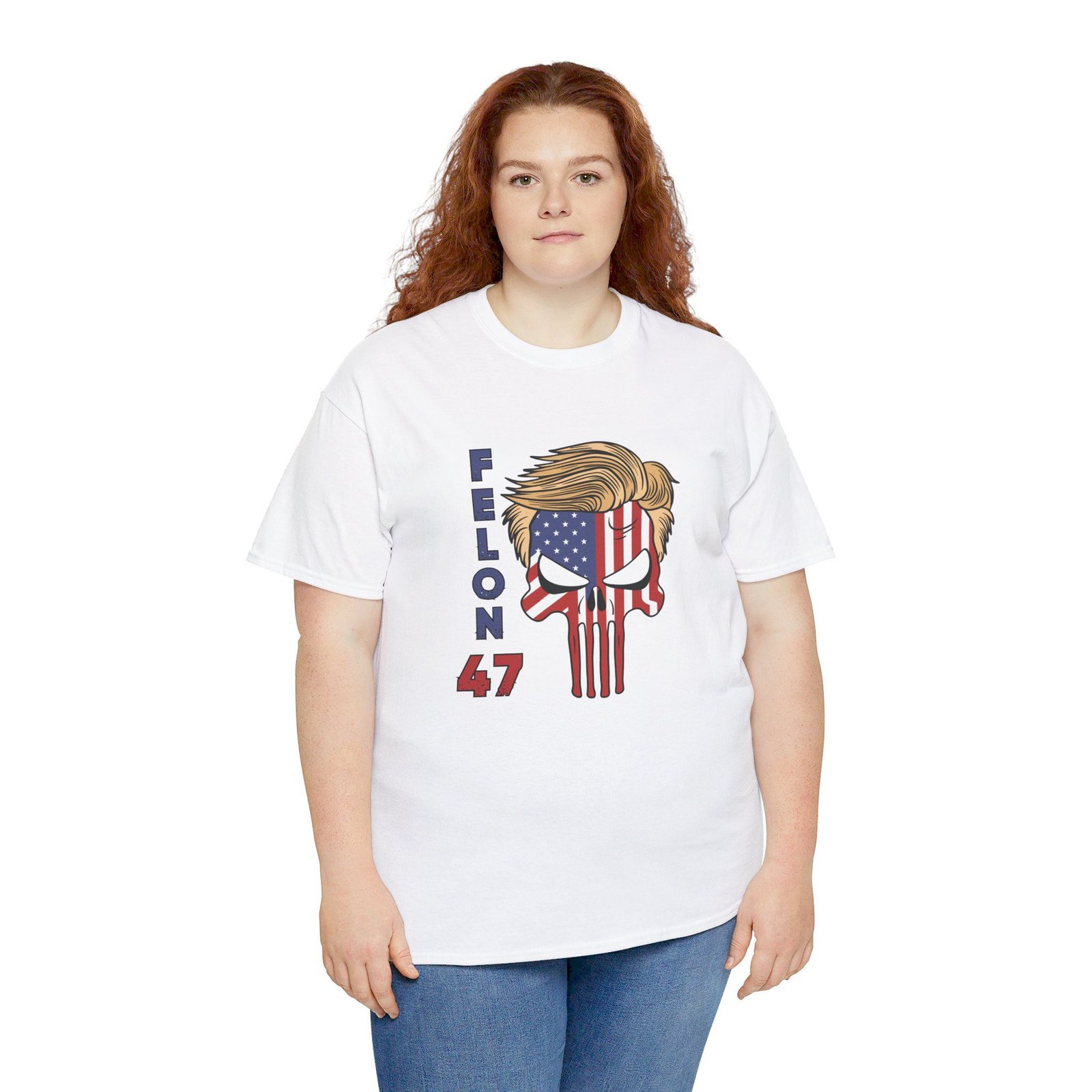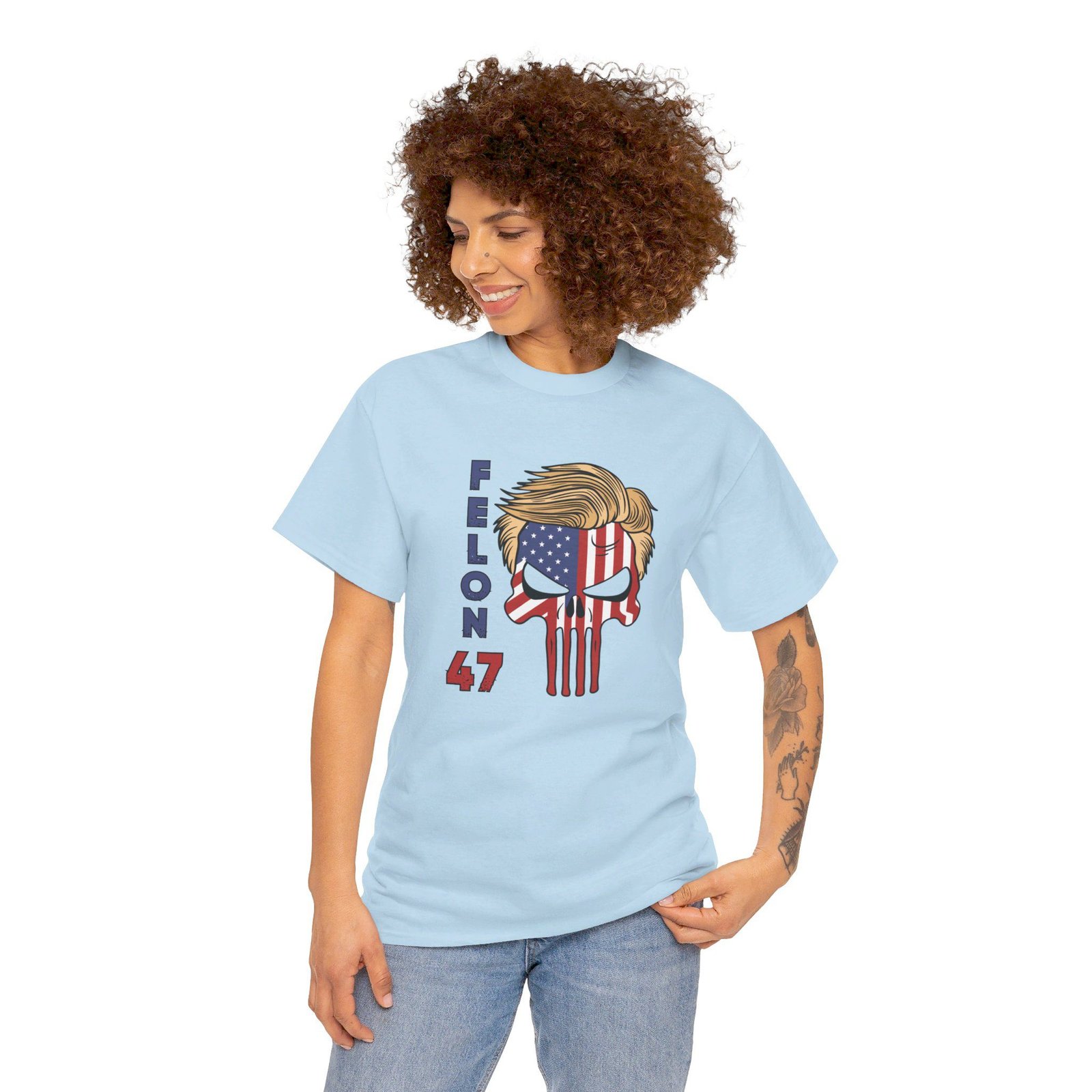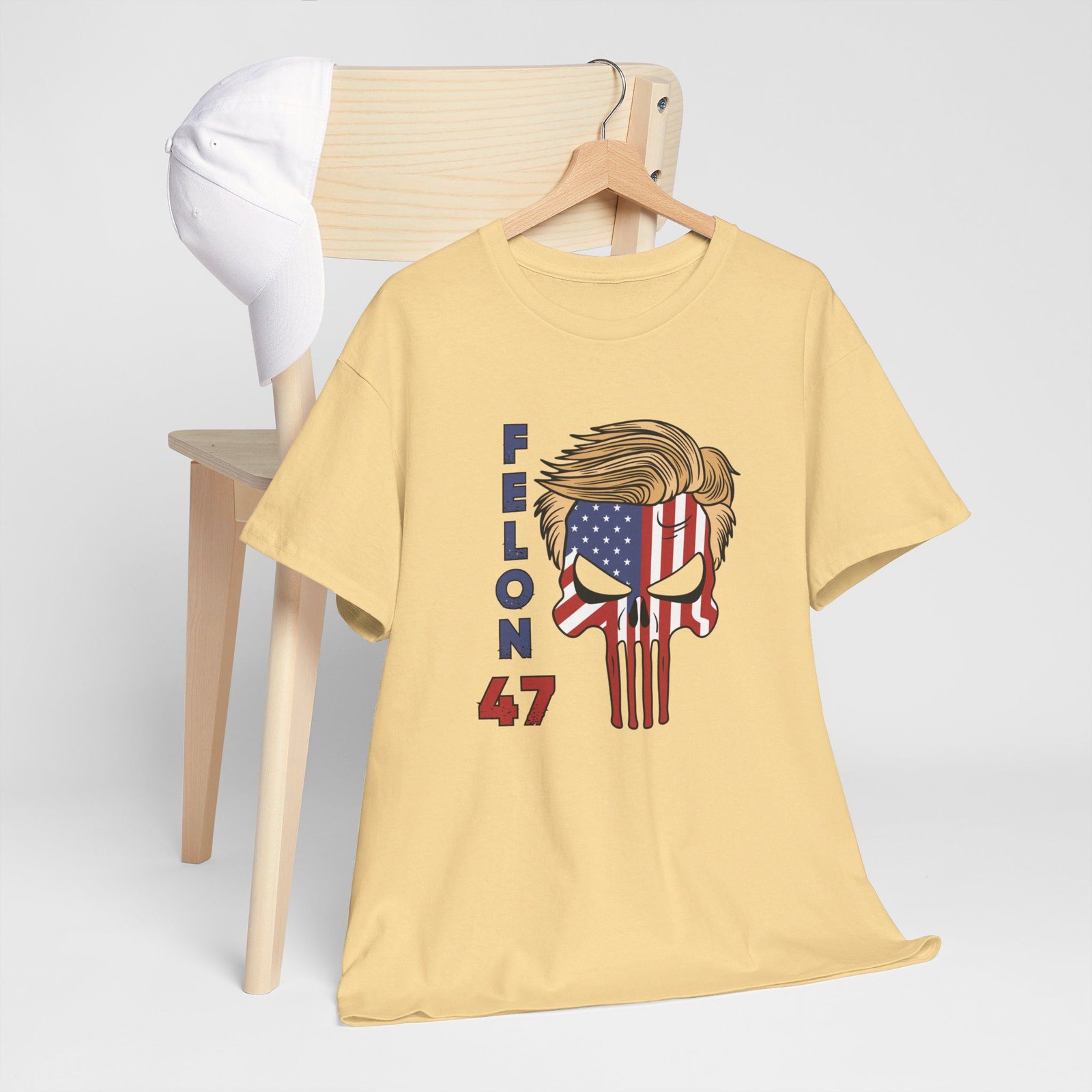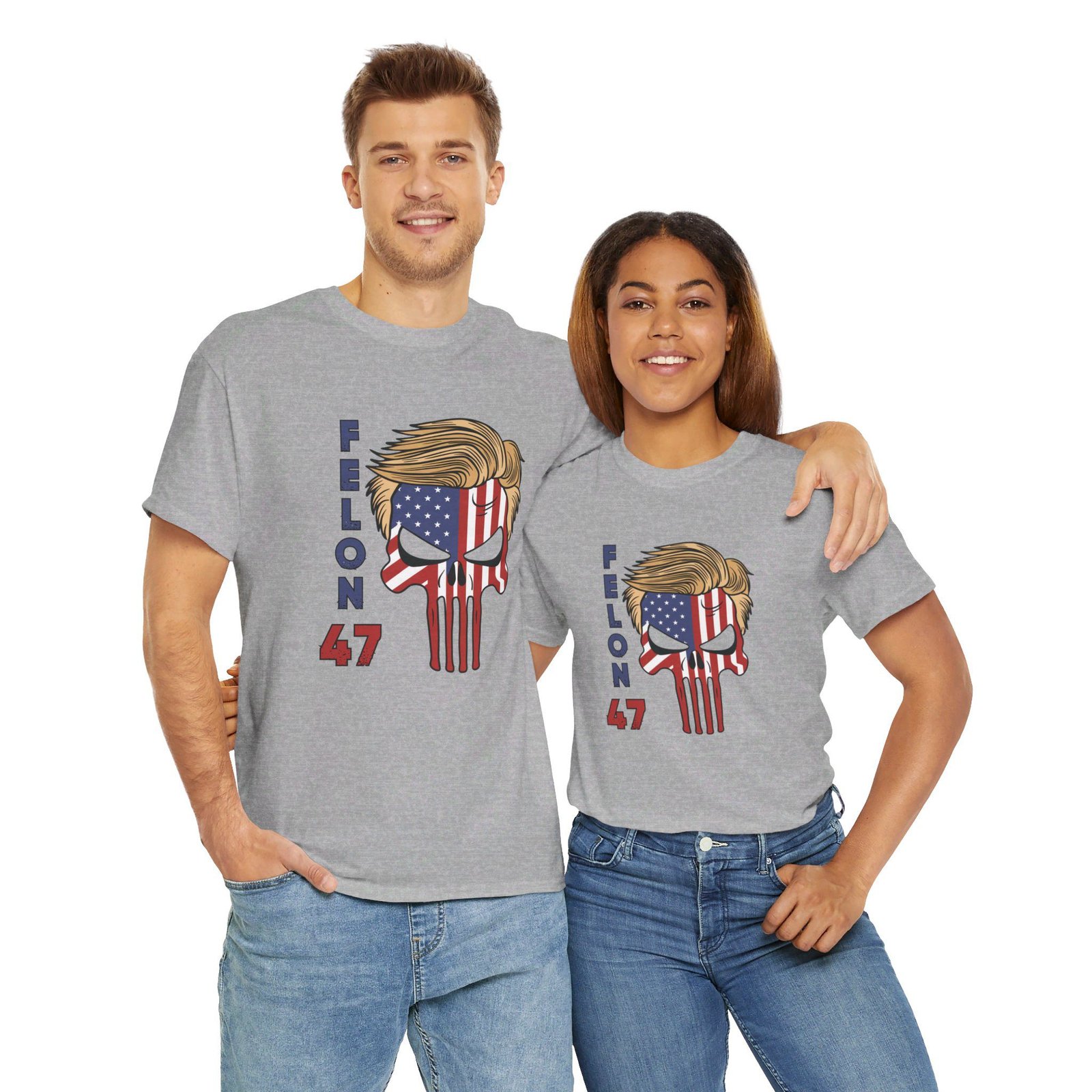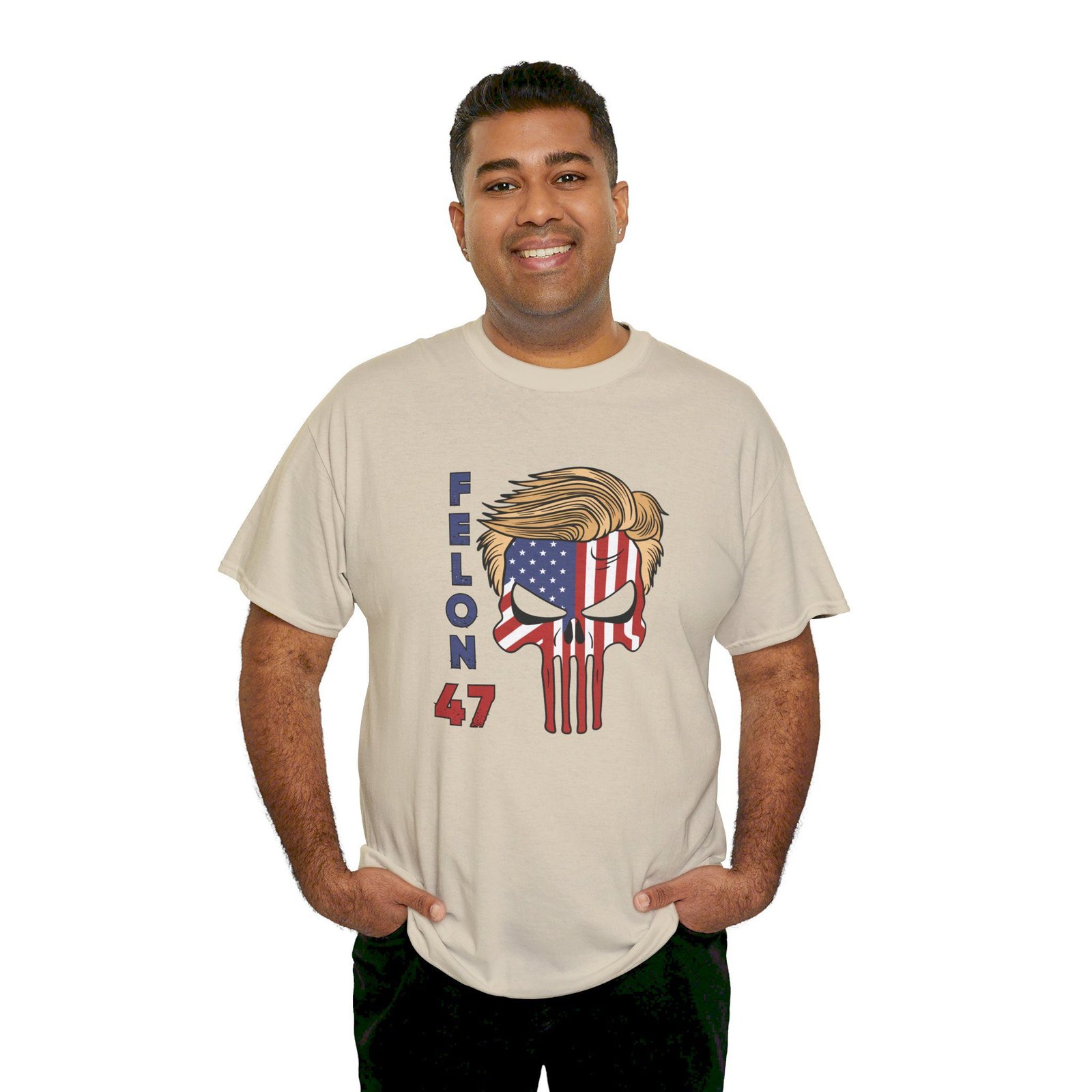 DESIGN: The text “Felon 47” in red and blue. An illustration of a skull embedded with the American Flag and with President Donald Trump’s iconic blonde hairstyle. Colors are white, black, gold, red, blue, etc. Your choice of t-shirt colors.