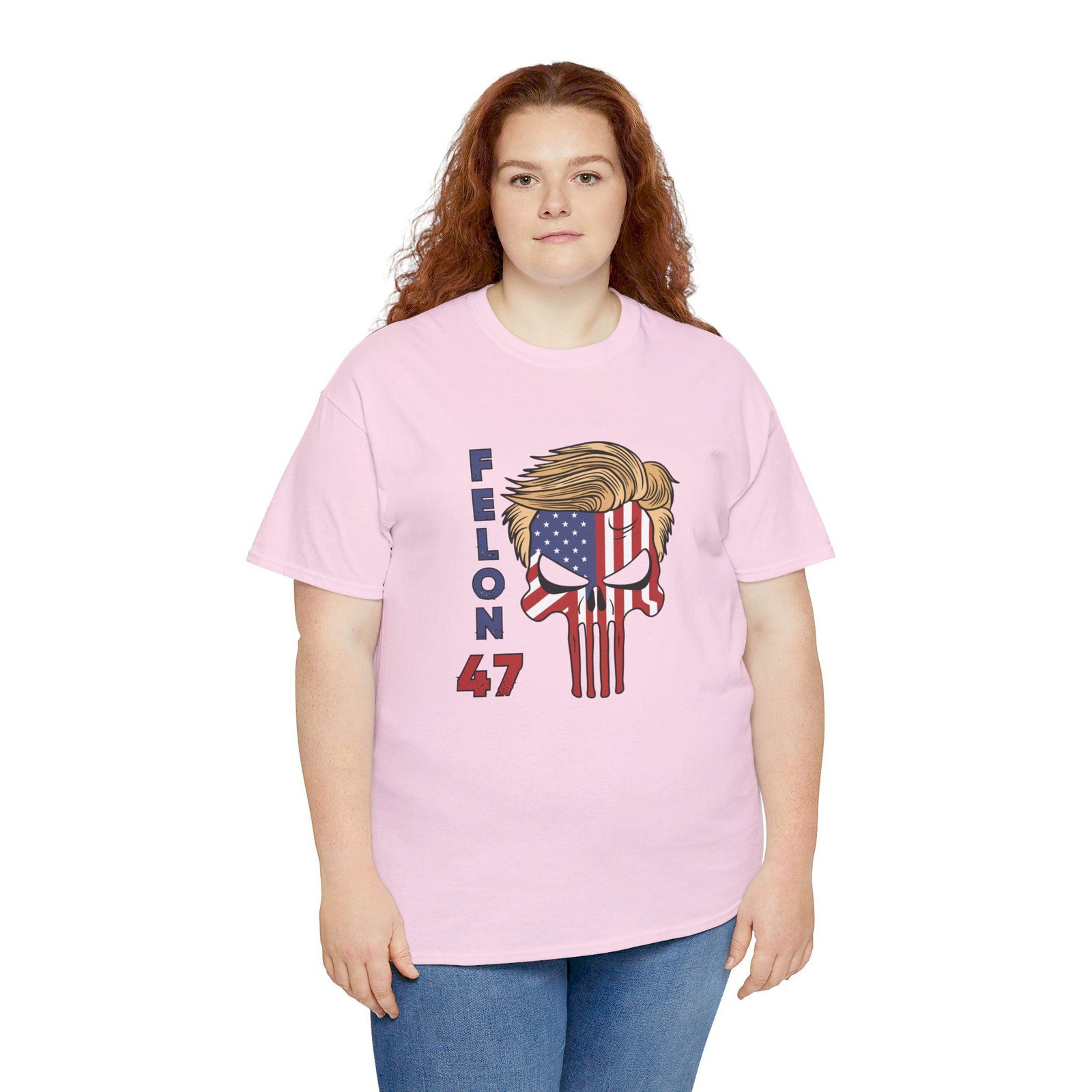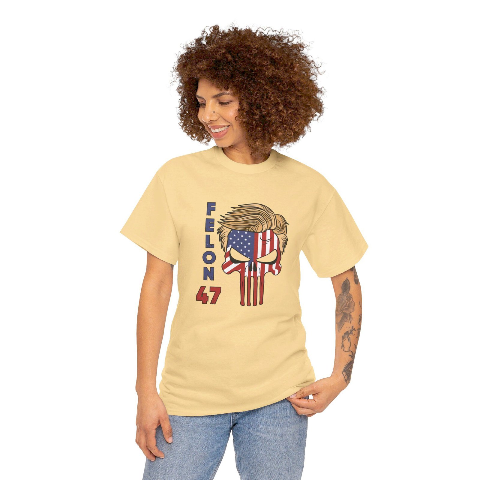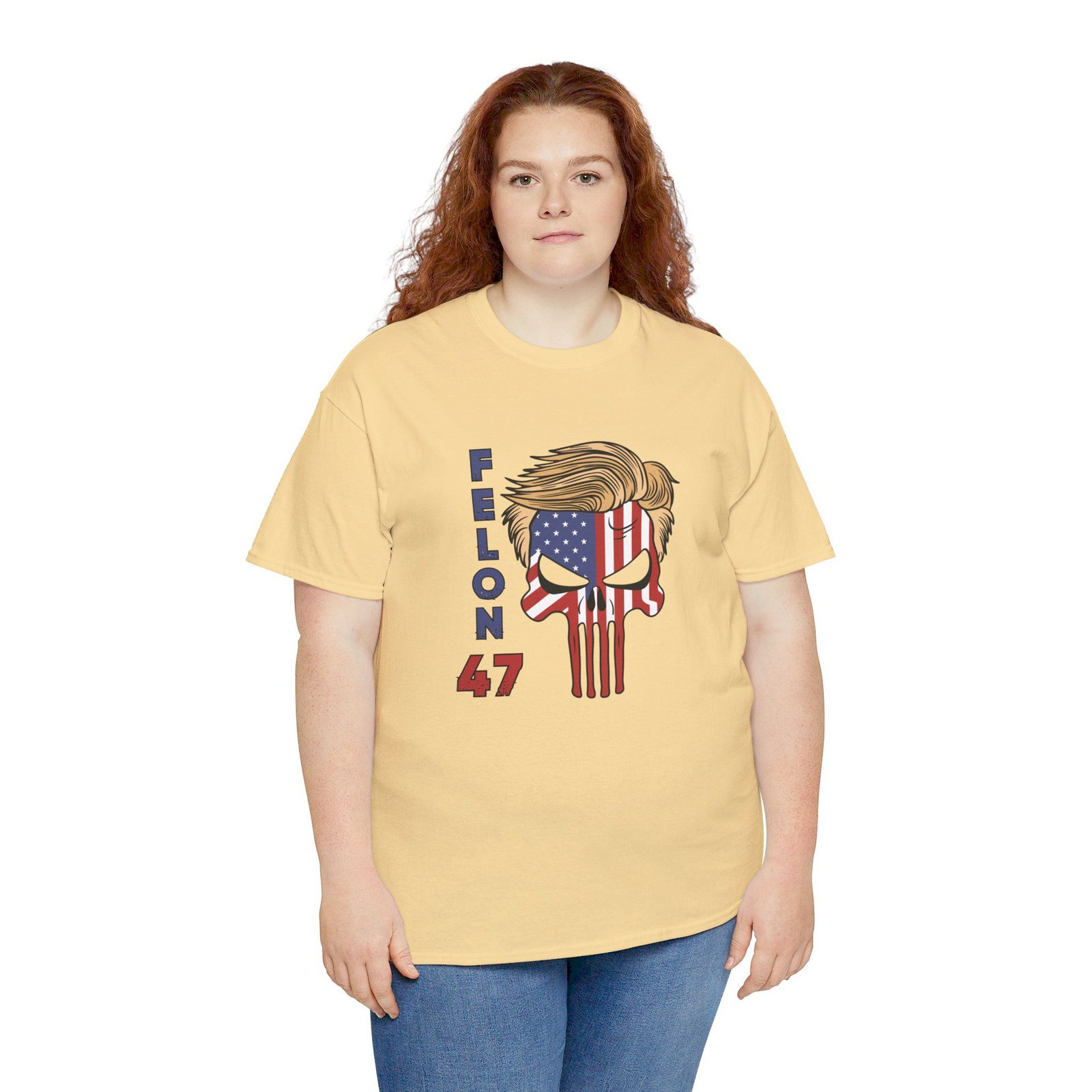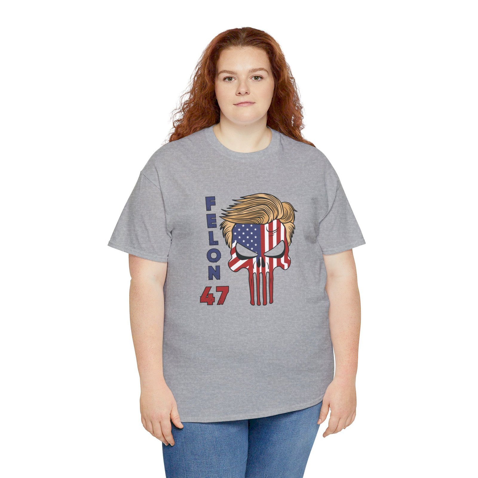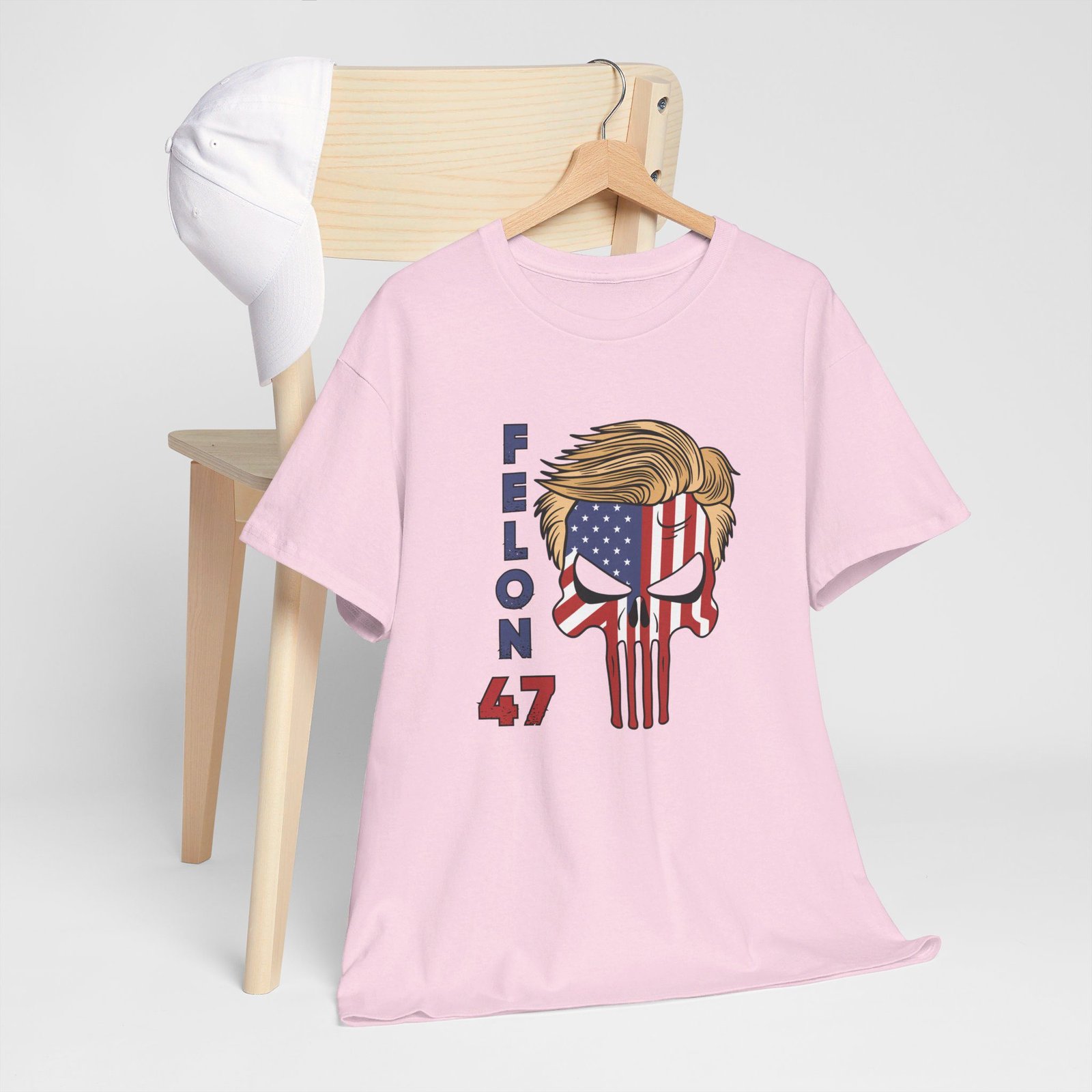 DESIGN: The text “Felon 47” in red and blue. An illustration of a skull embedded with the American Flag and with President Donald Trump’s iconic blonde hairstyle. Colors are white, black, gold, red, blue, etc. Your choice of t-shirt colors.