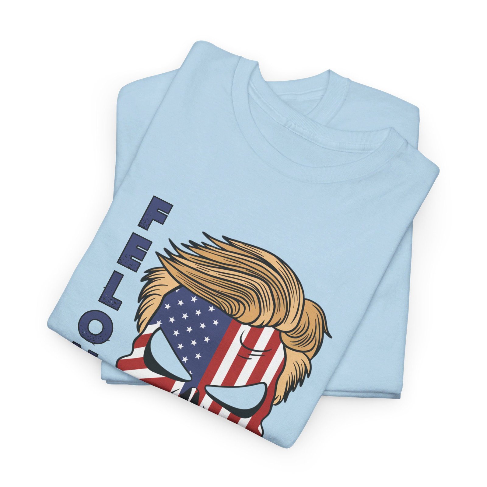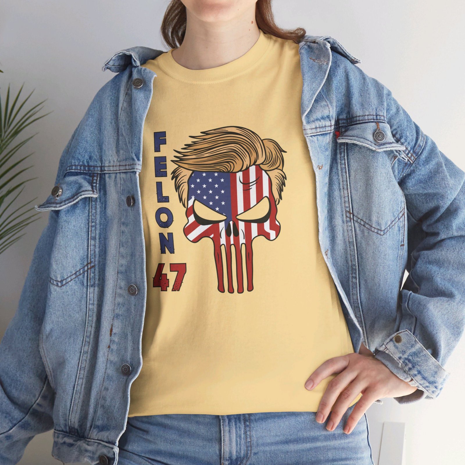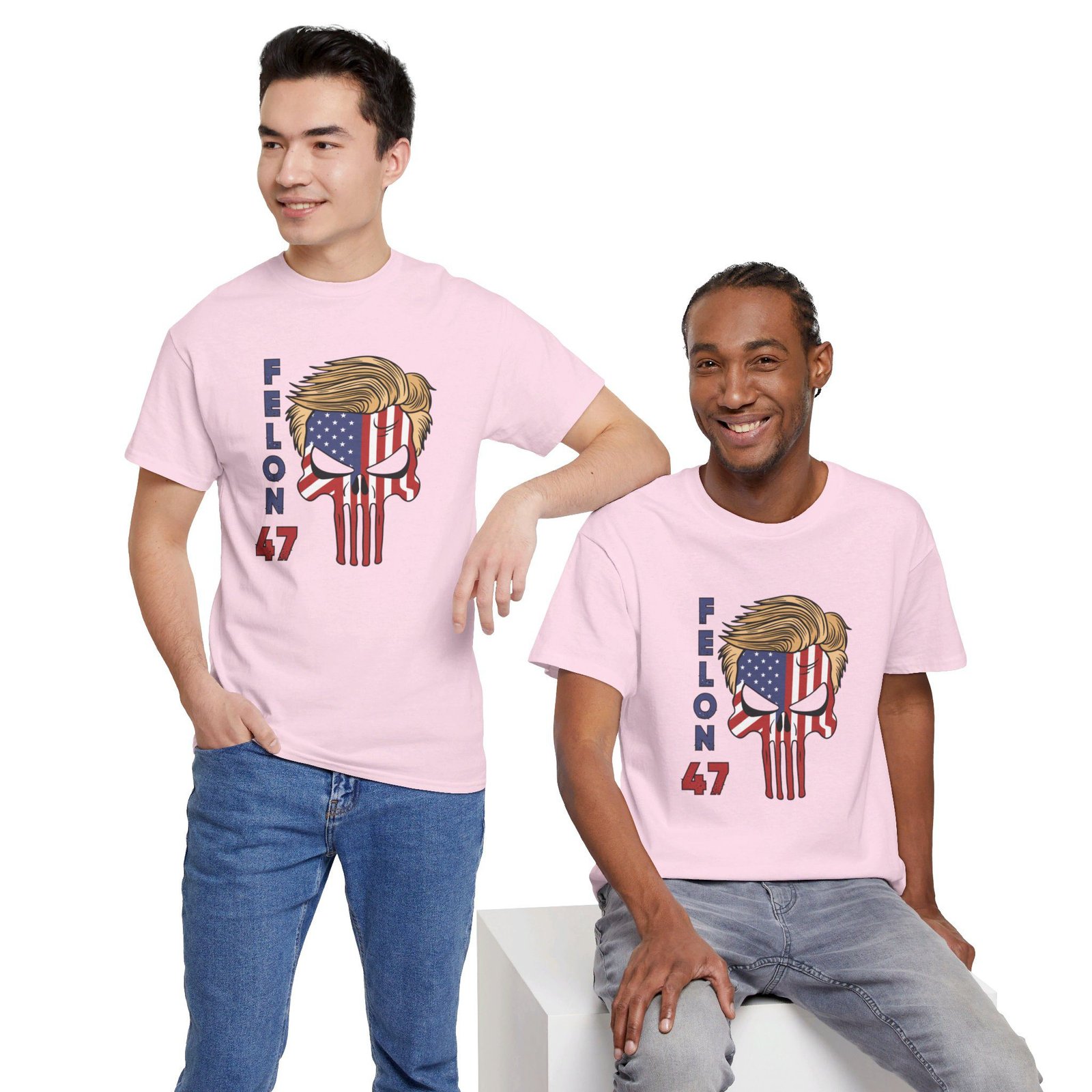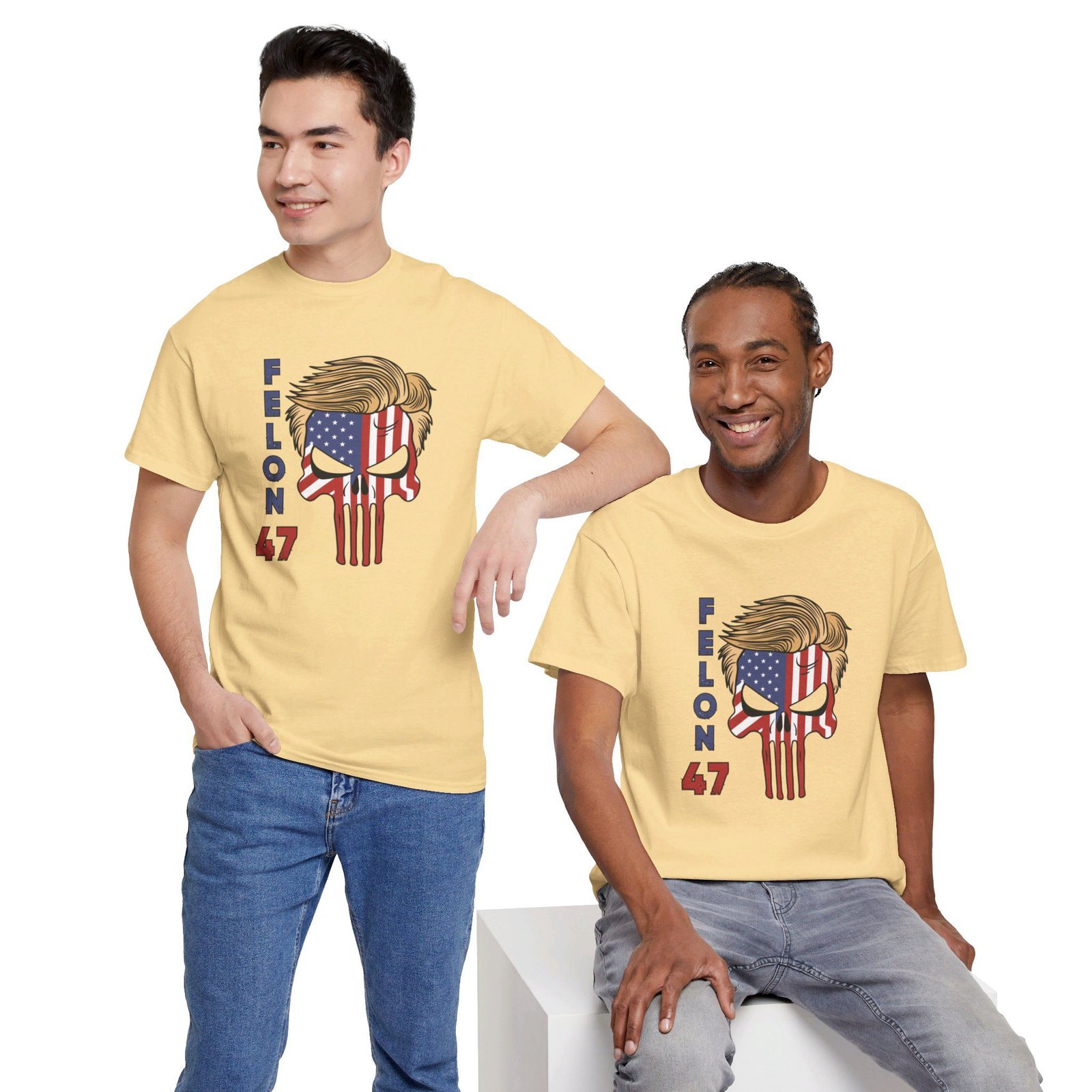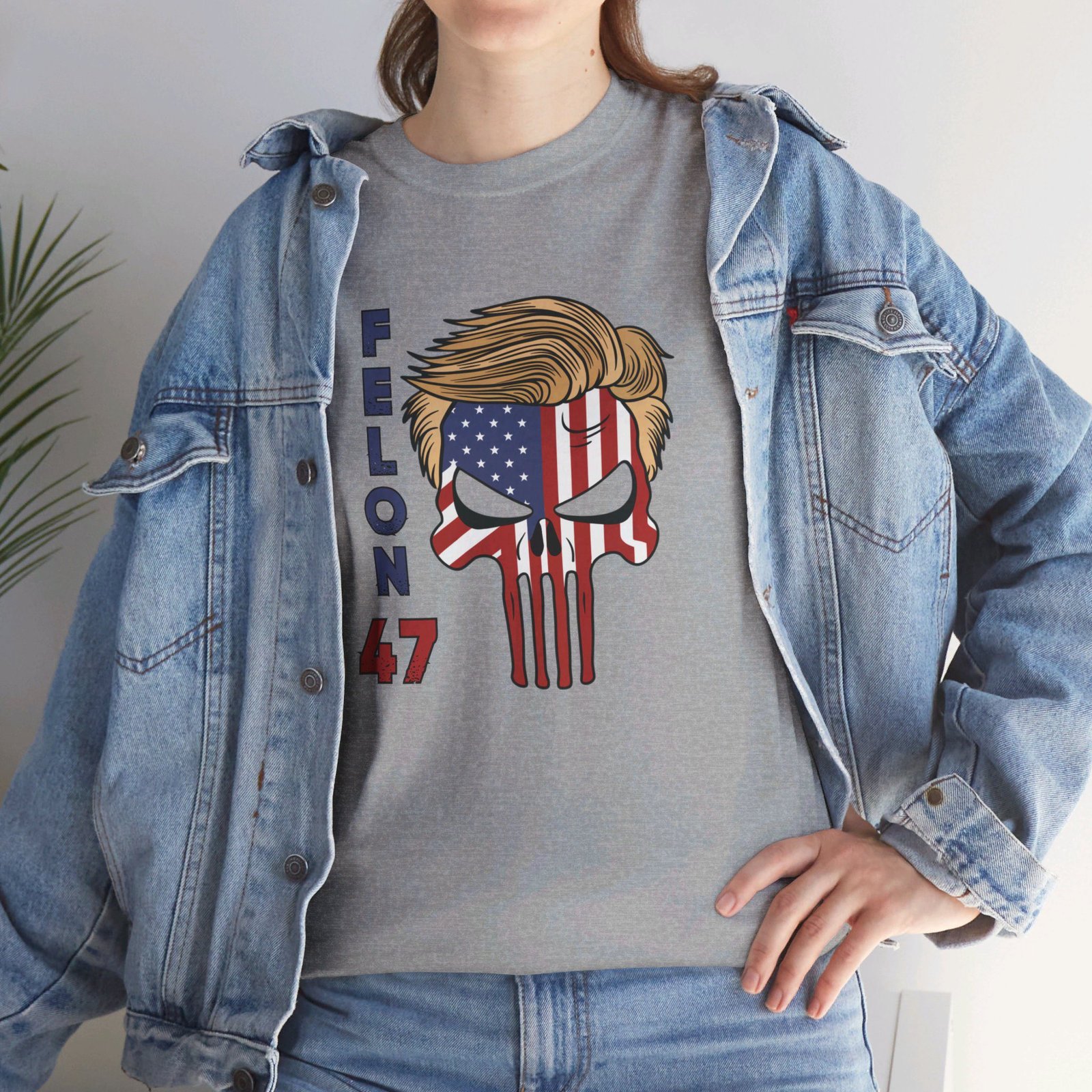 DESIGN: The text “Felon 47” in red and blue. An illustration of a skull embedded with the American Flag and with President Donald Trump’s iconic blonde hairstyle. Colors are white, black, gold, red, blue, etc. Your choice of t-shirt colors.