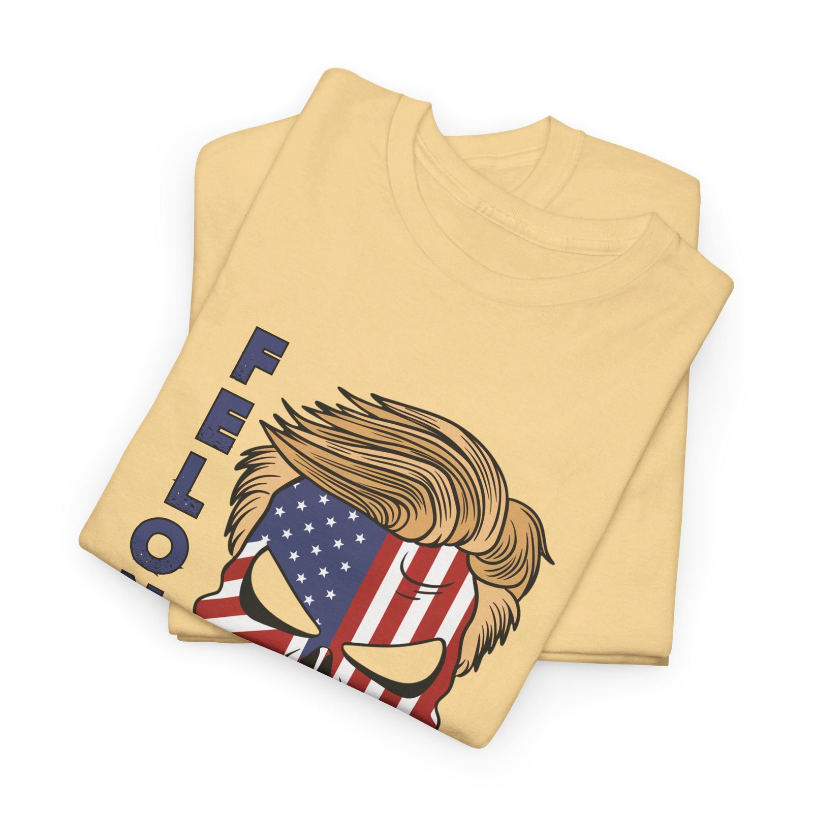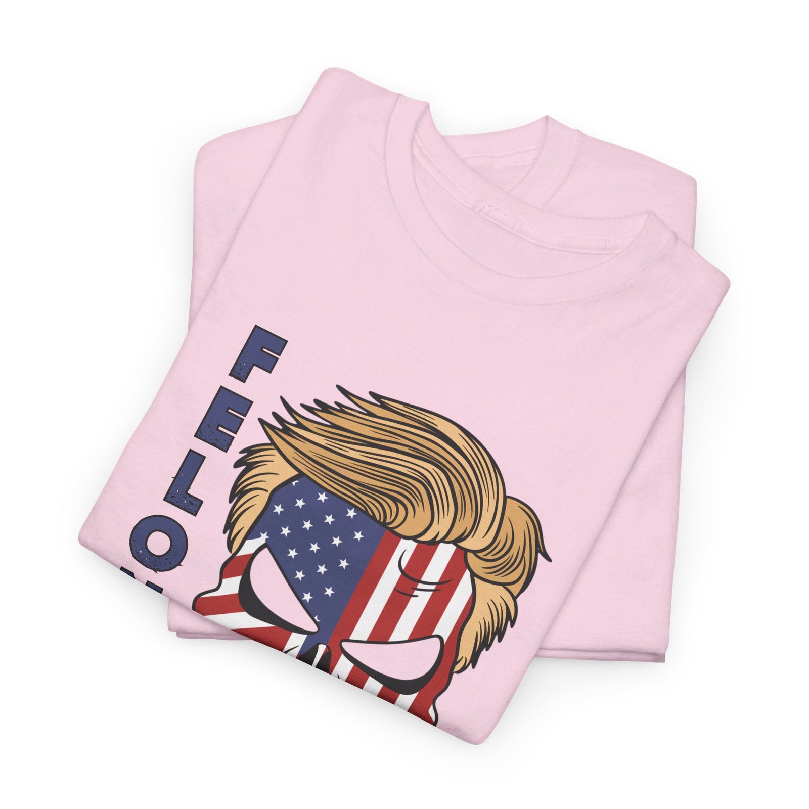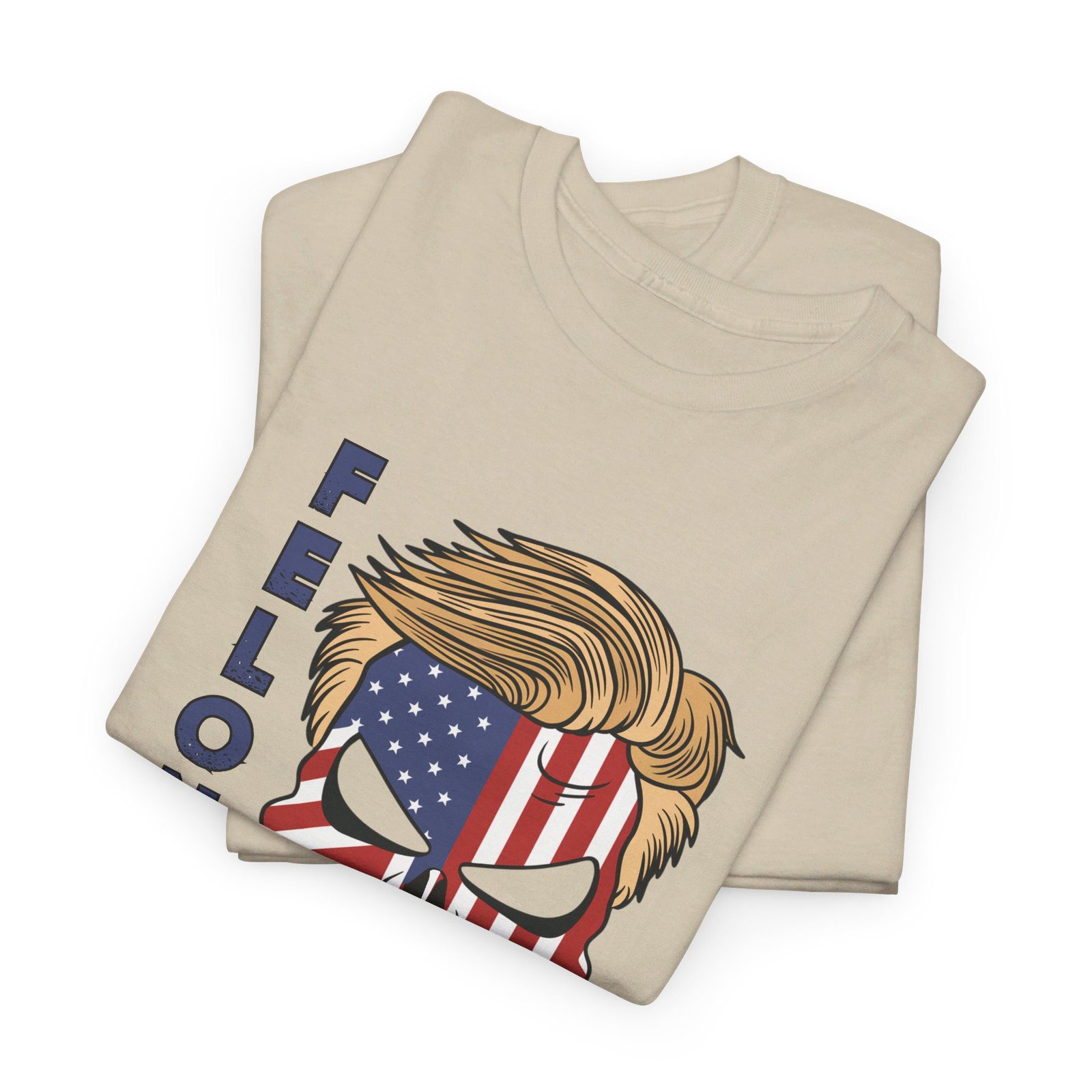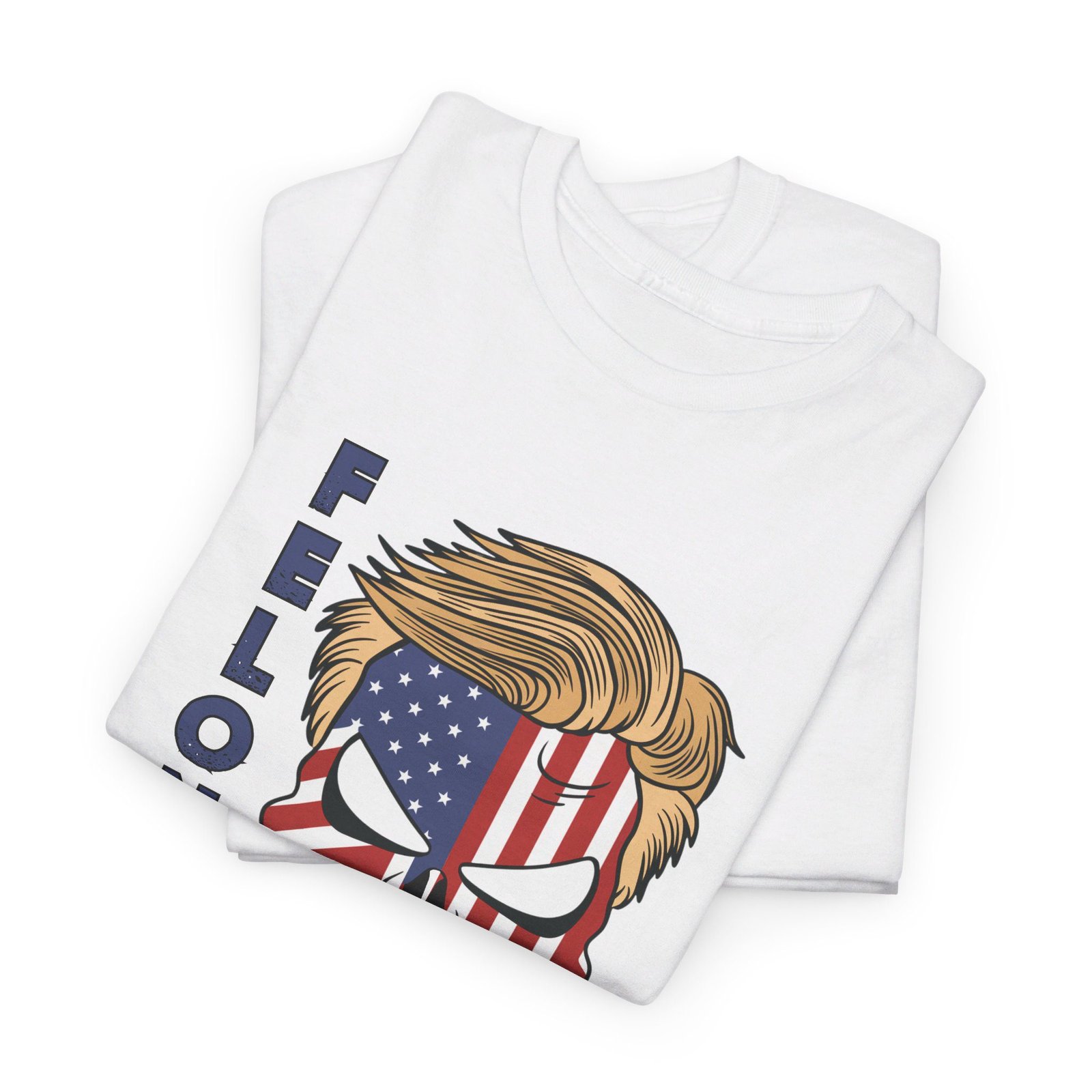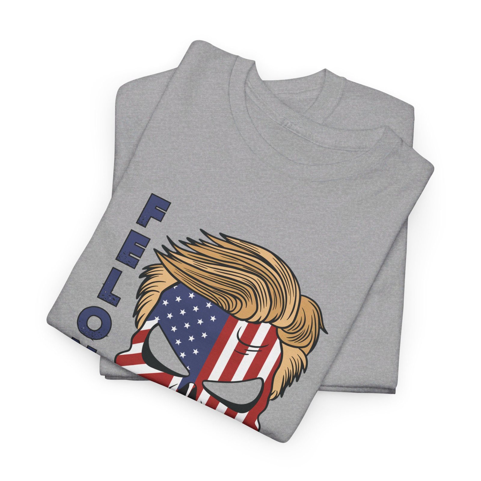 DESIGN: The text “Felon 47” in red and blue. An illustration of a skull embedded with the American Flag and with President Donald Trump’s iconic blonde hairstyle. Colors are white, black, gold, red, blue, etc. Your choice of t-shirt colors.