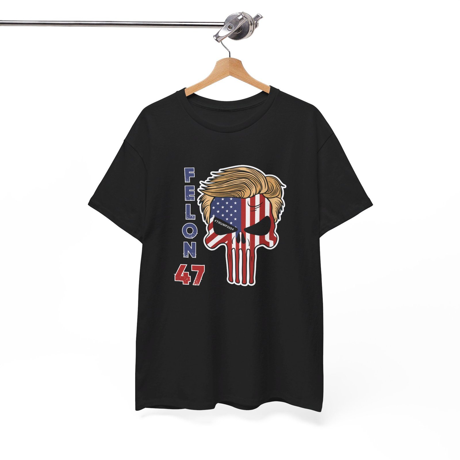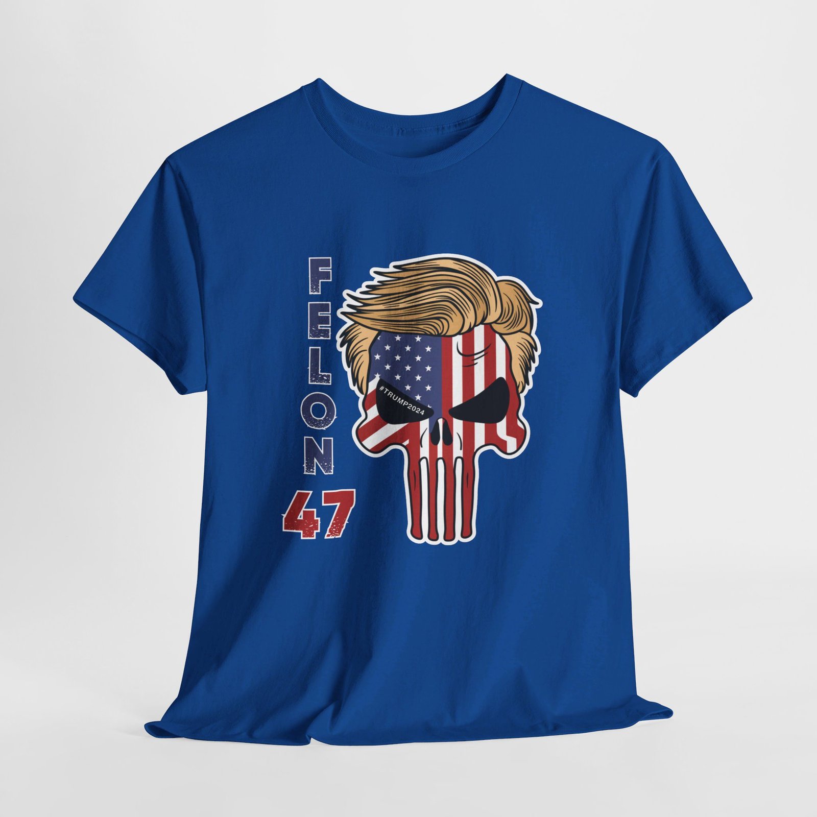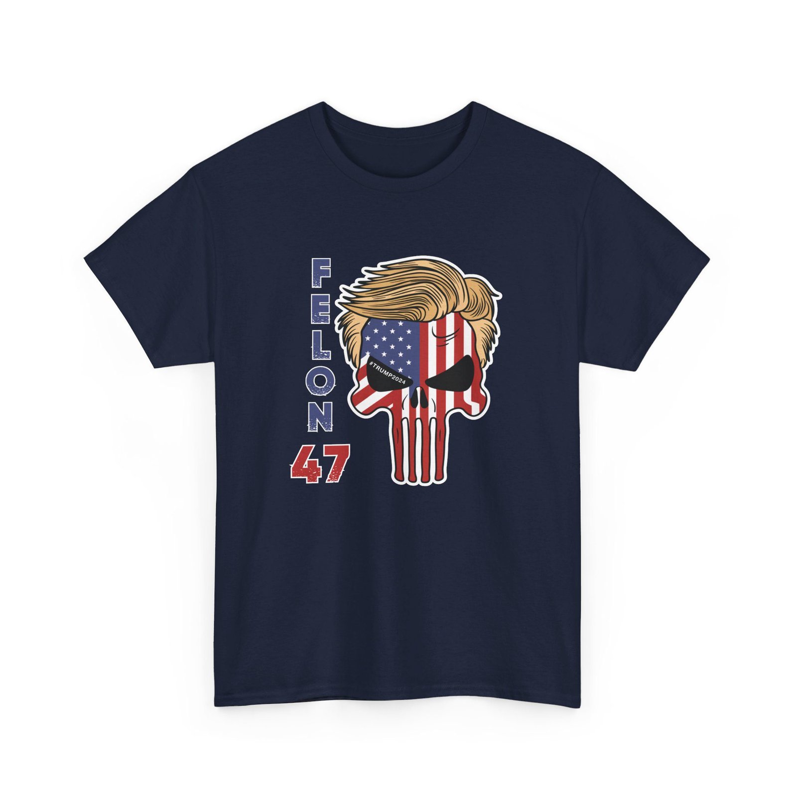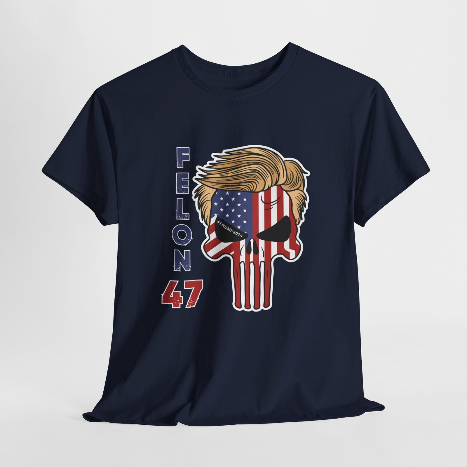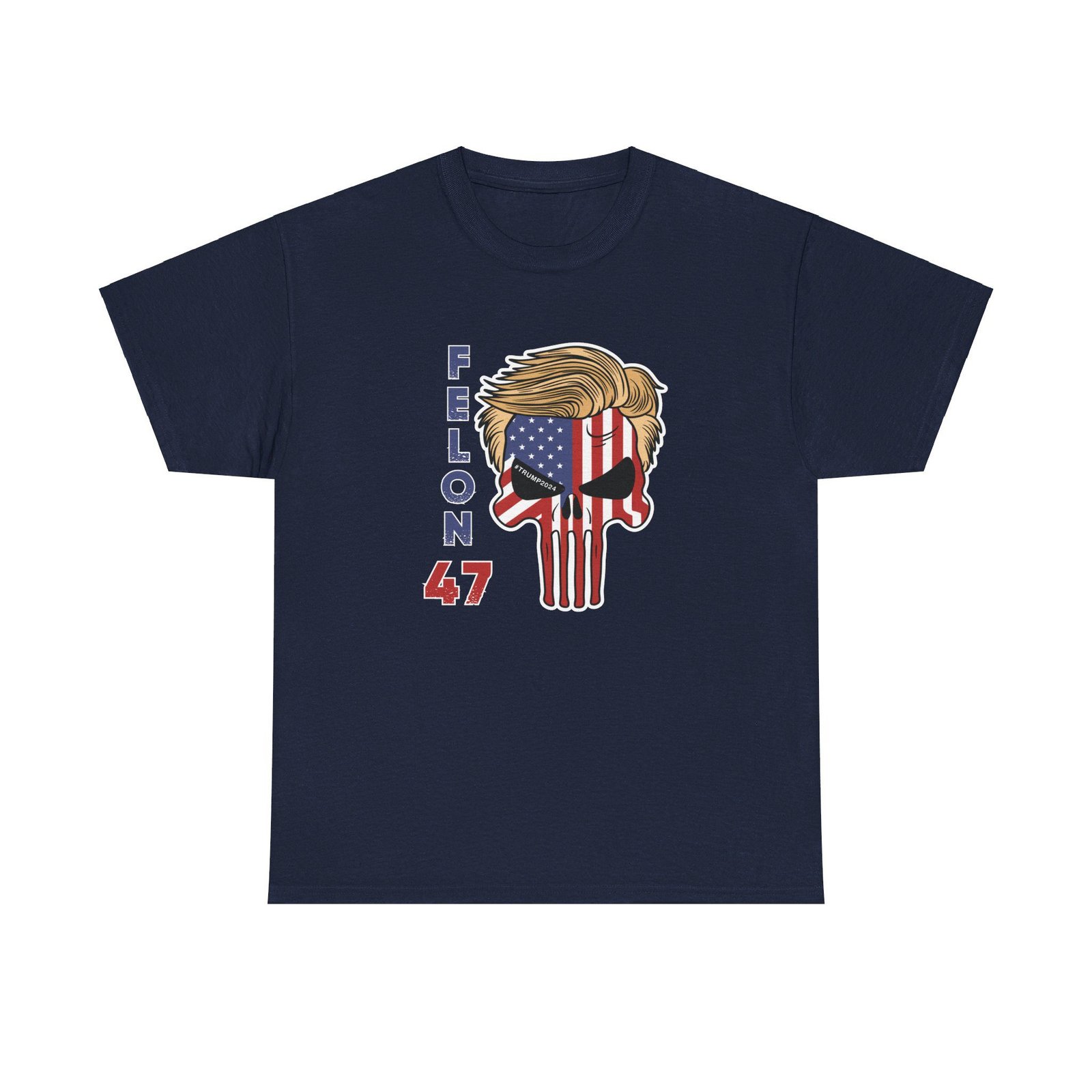 DESIGN: The text “Felon 47” in red and blue. An illustration of a skull embedded with the American Flag and with President Donald Trump’s iconic blonde hairstyle. Colors are white, black, gold, red, blue, etc. Your choice of t-shirt colors.