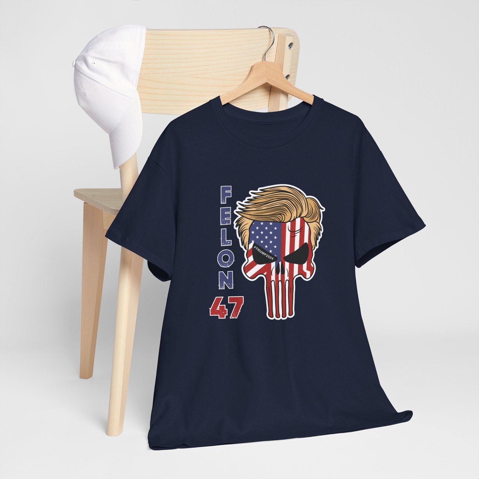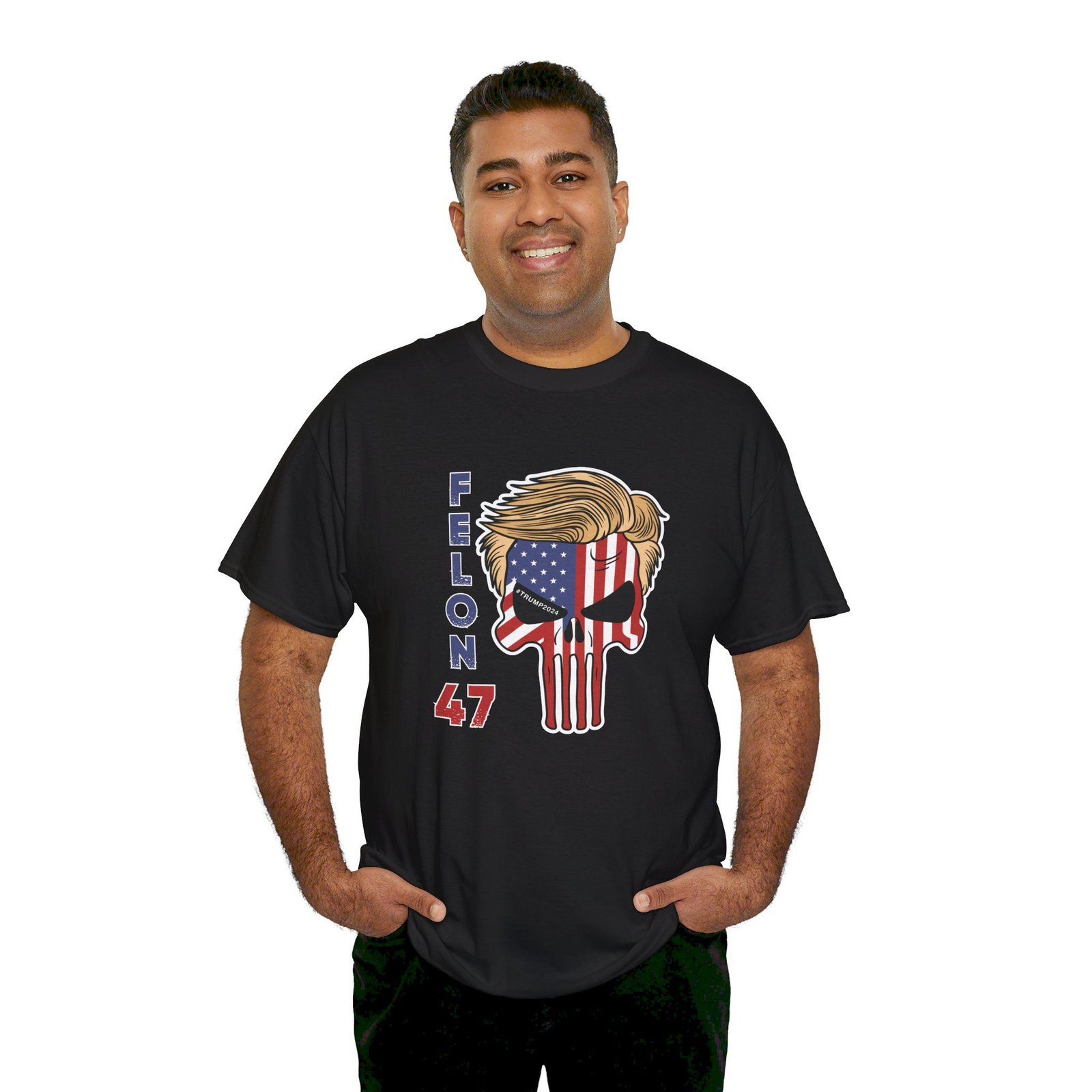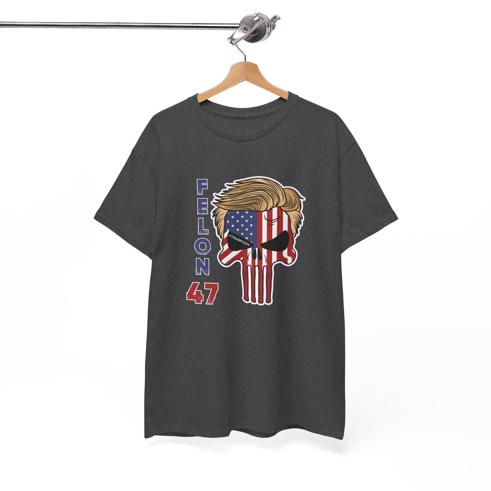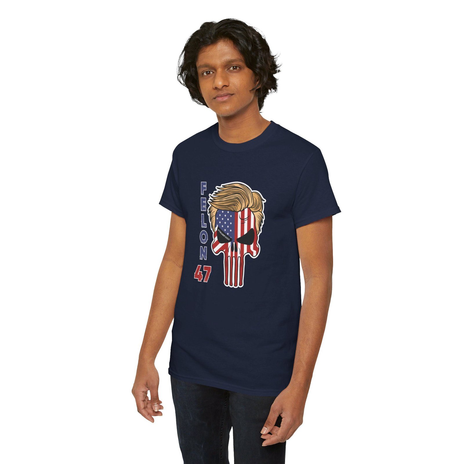 DESIGN: The text “Felon 47” in red and blue. An illustration of a skull embedded with the American Flag and with President Donald Trump’s iconic blonde hairstyle. Colors are white, black, gold, red, blue, etc. Your choice of t-shirt colors.